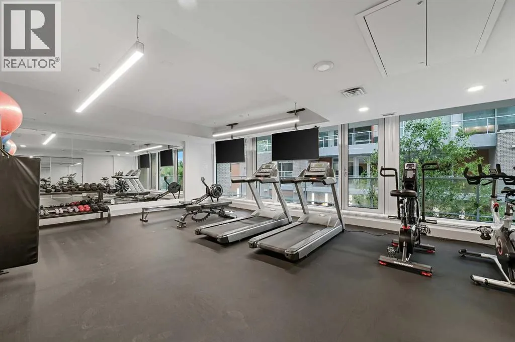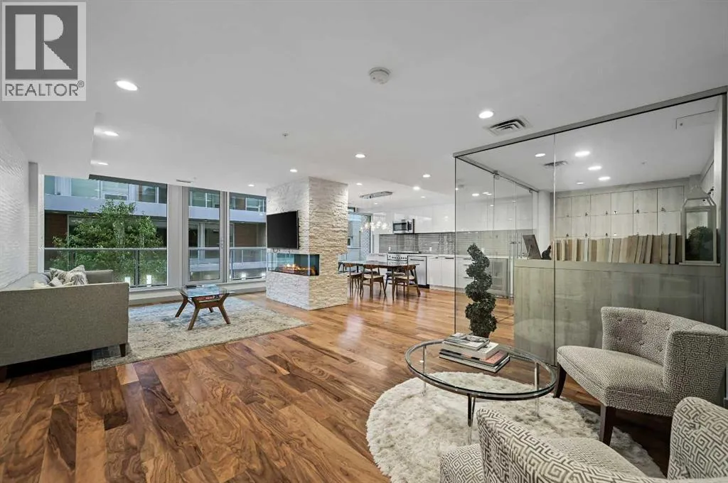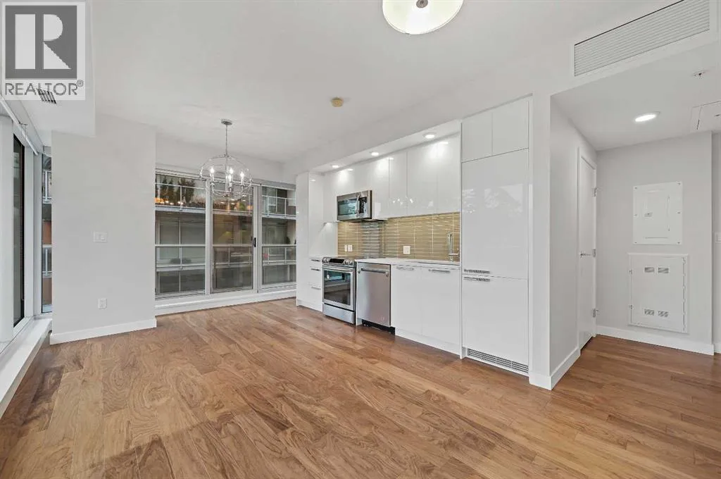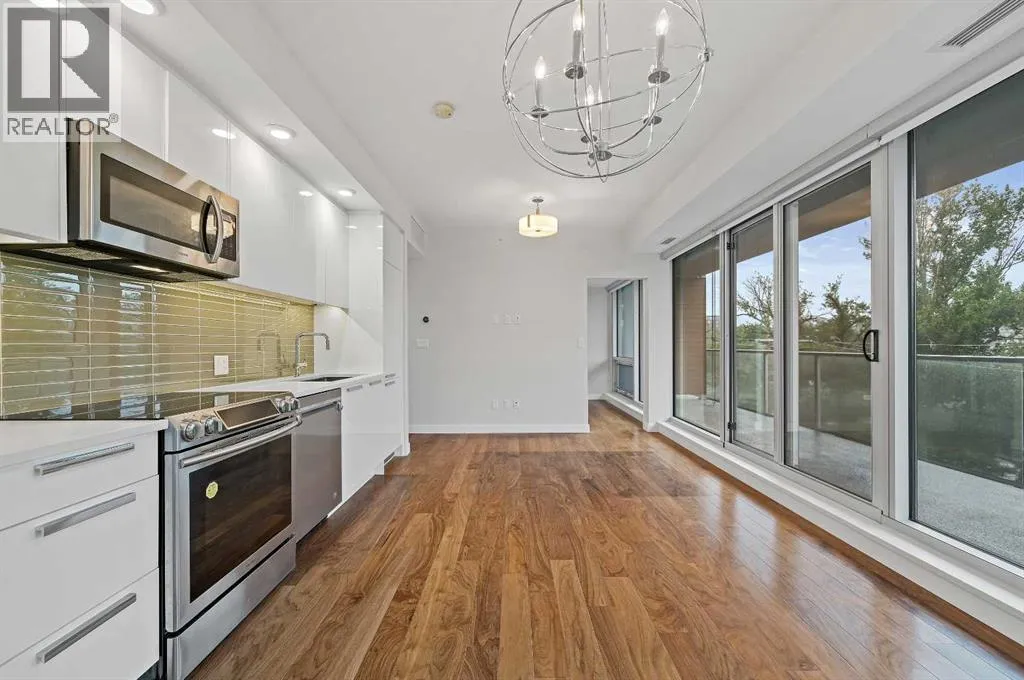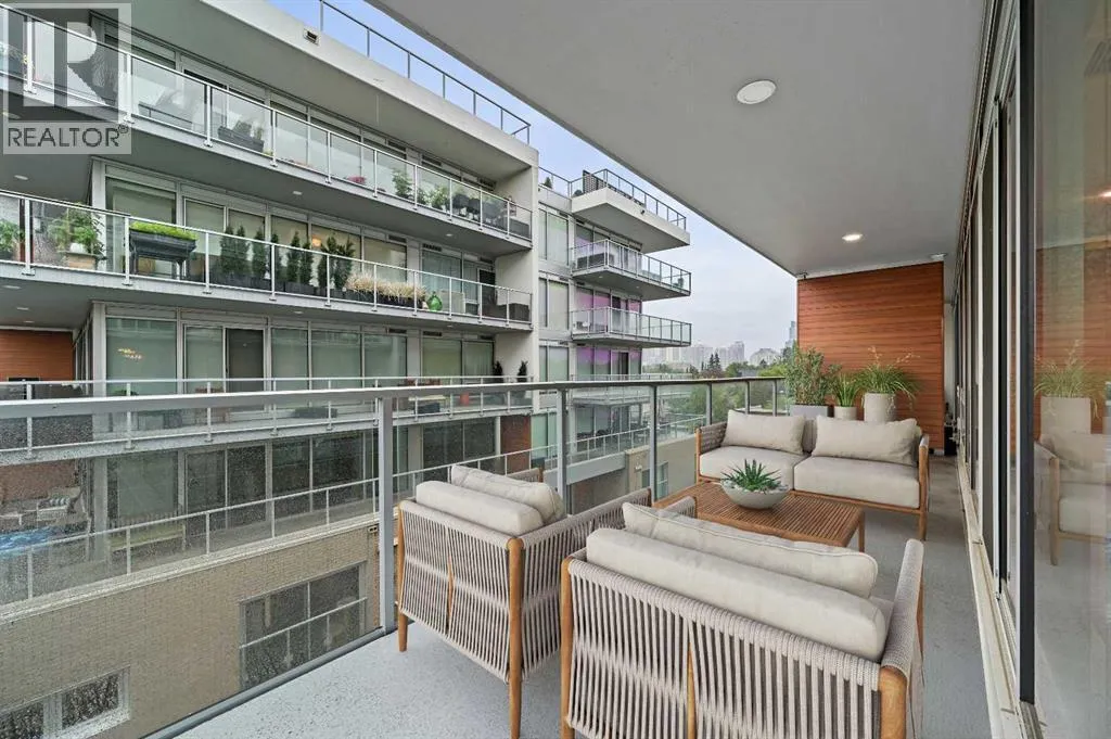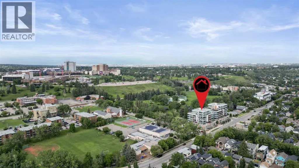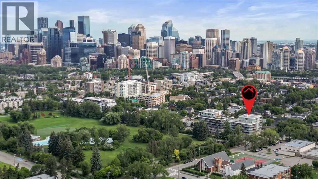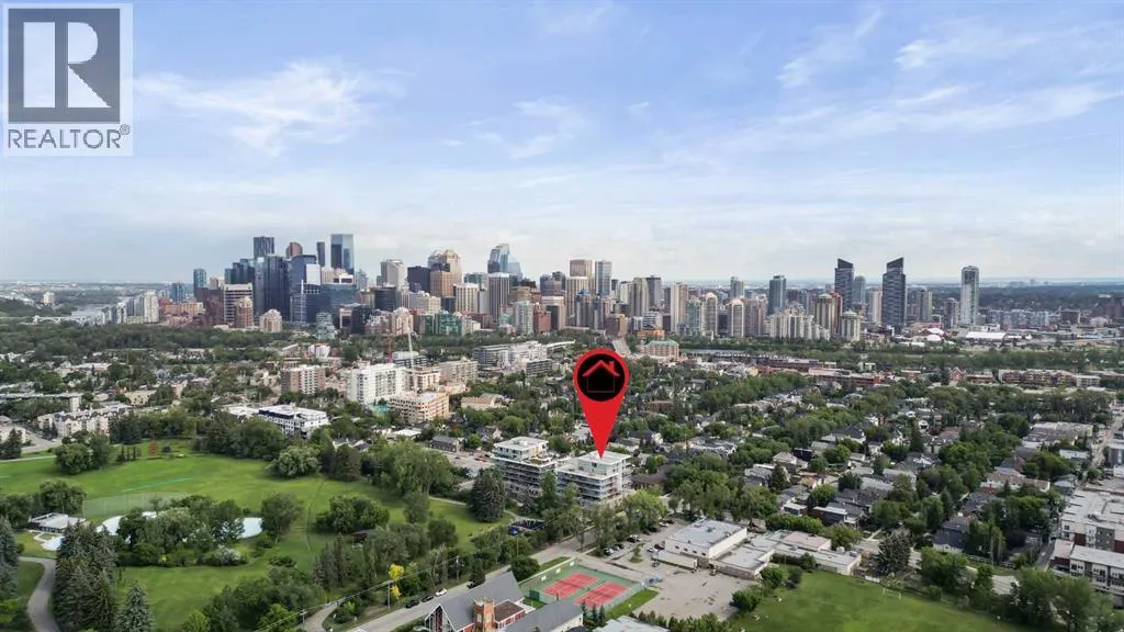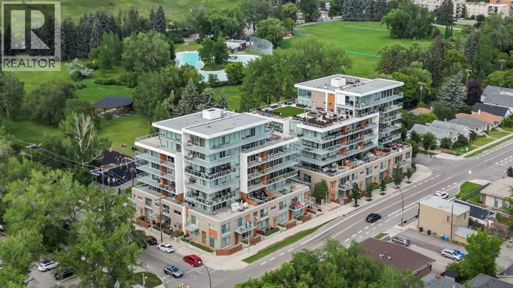 Welcome to Ezra on Riley Park, a truly unique address in the heart of Hillhurst, where stylish city living meets the serenity of nature. Nestled along the edge of the iconic Riley Park, this sophisticated 2-bedroom, 2-bath condo offers a rare opportunity to experience the best of inner-city Calgaryâwith breathtaking views, upscale design, and unmatched walkability. From the moment you step inside, you'll feel the difference. A spacious foyer welcomes you with beautiful textured engineered hardwood flooring, leading you into a thoughtfully designed open-concept living space filled with natural light streaming in through floor-to-ceiling windows. This home is perfectly framed by views of the lush greenspace just beyond, creating a seamless connection between indoor luxury and outdoor beauty. The kitchen and living area blend harmoniously, surrounded by oversized windows and double French sliding doors that open onto an expansive wrap-around balconyâan incredible outdoor living space measuring over 59 feet in total length, ideal for morning coffee, evening cocktails, or relaxing in your private oasis above the park. The modern kitchen boasts sleek stainless steel appliances, stylish white cabinetry with fridge panels to match, elegant glass tile backsplash, durable and beautiful silgranite sink and quartz countertops for a clean, contemporary finish. Both bedrooms are bright and inviting, featuring built-in closet organizers and a soft, modern color palette. The primary suite enjoys its own wing of the wraparound balcony and a private 4-piece ensuite, complete with classic tile flooring, full tile shower and tub combo and quartz vanity with undermount sink and built-in vanity. The second full bathroom, located near the entry for guests or family, mirrors the homeâs elevated aesthetic. You'll also appreciate the in-suite laundry room, central air conditioning, and ample storage throughout. Additional highlights include a titled underground parking stall in a secure, hea ted parkade, assigned storage locker, access to a premium fitness centre and chic party room with your very own wine locker, pet-friendly and impeccably maintained building. Beyond your doorstep is the best of Calgaryâs urban lifestyle. Riley Park as your backyard, complete with a cricket pitch, wading pool, new playground, and the Senator Patrick Burns Rock Garden. Steps from the Hillhurst Sunnyside community centre with tennis courts, weekly farmerâs markets, and live music. Easy stroll to the Kensington shopping district, Bow River pathways, SAIT, Jubilee Auditorium, cafés, transit, and the downtown core Ezra on Riley Park is more than a condoâitâs a lifestyle of tranquility, convenience, and contemporary charm in one of Calgaryâs most vibrant, connected neighborhoods. Donât miss this rare opportunity to live stylishly above the parkâschedule your private showing today. (id:27476)