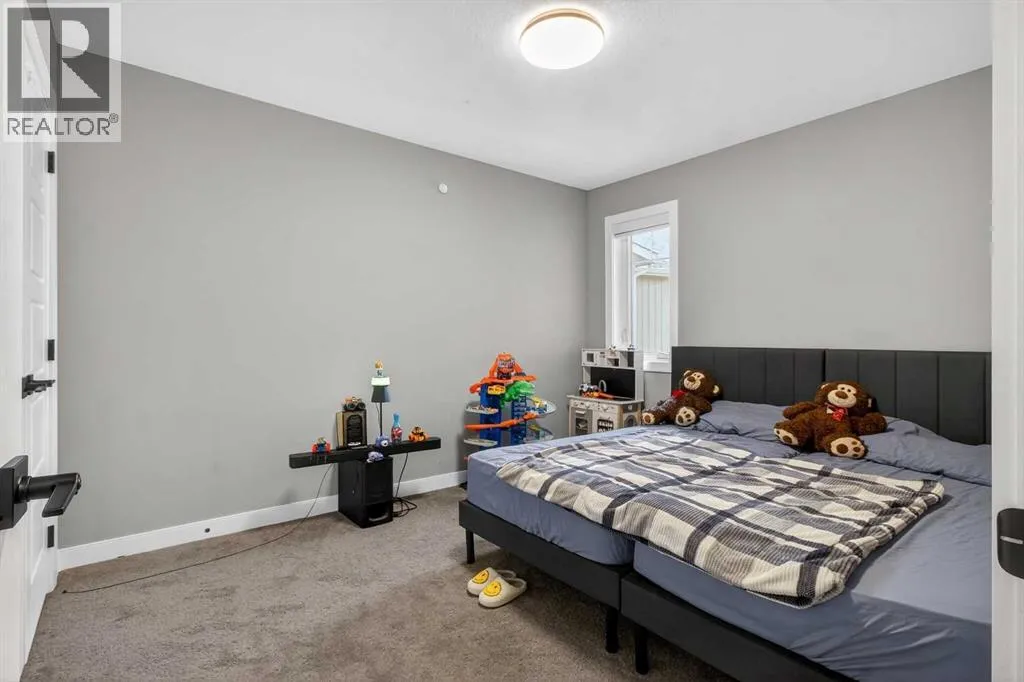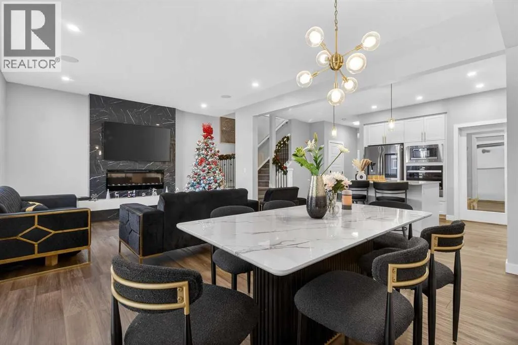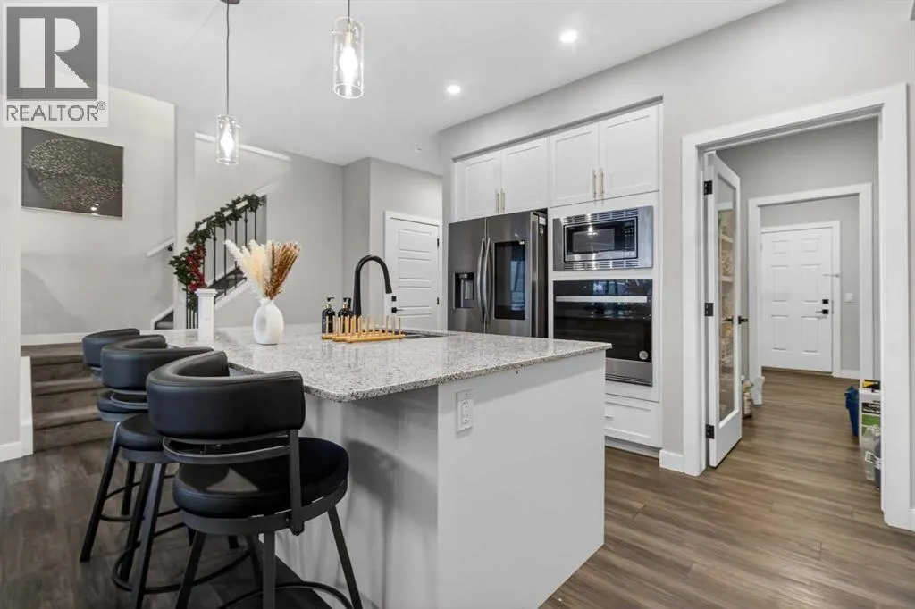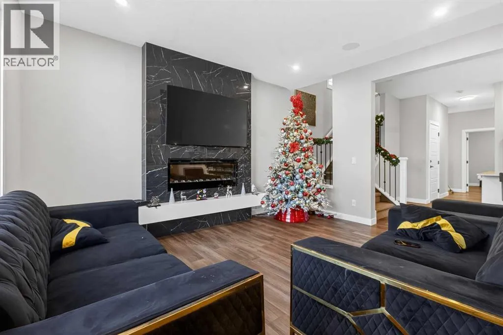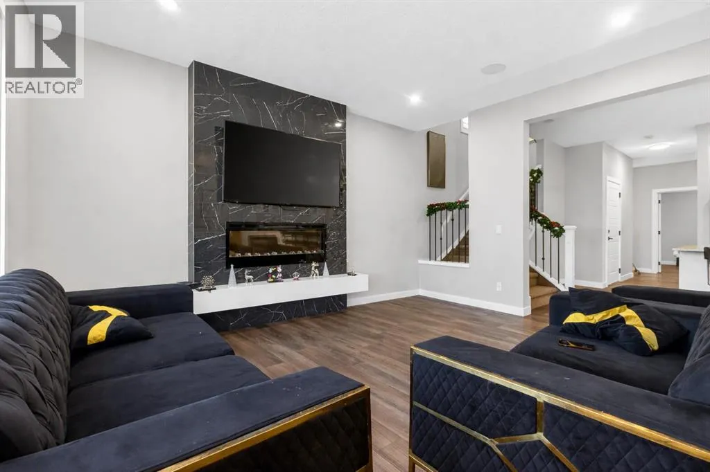 Welcome to an exceptional luxury residence in the highly sought-after community of Belmont SW. This newly built home, less than 22 months old, offers over 3,333 square feet of thoughtfully designed living space, seamlessly blending upscale finishes with modern functionality and smart home convenience.The main level features a sophisticated open-concept layout with a cozy tiled fireplace anchoring the living room, an expansive entertaining area, and a chef-inspired kitchen complete with an extended island, upgraded cabinetry, premium stainless steel appliances, and upgraded interior doors throughout. A private, fully enclosed office on the main floor provides the perfect work-from-home space.Upstairs, the home offers a spacious bonus room, four generously sized bedrooms, and two and a half bathrooms. The primary retreat serves as a true sanctuary with a spa-like five-piece ensuite and a large walk-in closet designed for comfort and privacy.A fully legal basement suite adds exceptional value, featuring a separate entrance, its own municipal address, separate gas and electrical meters, a dedicated furnace, in-suite laundry, a full kitchen, two bedrooms, and a full bathroom. The basement suite is currently tenant-occupied, generating $2,000 per month including gas and electricity, making it ideal for investors or multi-generational living.Additional highlights include a double attached garage, keyless entry, smart home technology, two Sonos 6.5-inch in-ceiling speakers, a Lorex 4K security camera system with live monitoring, and upgraded kitchen finishes. The large pie-shaped backyard offers over 600 square metres of outdoor space, providing a blank canvas for future landscaping or outdoor entertaining.Located in a growing southwest Calgary community, this impressive property delivers luxury, income potential, and modern design in one exceptional home. This is a rare opportunity to own a move-in-ready residence in Belmont SW (id:27476)
