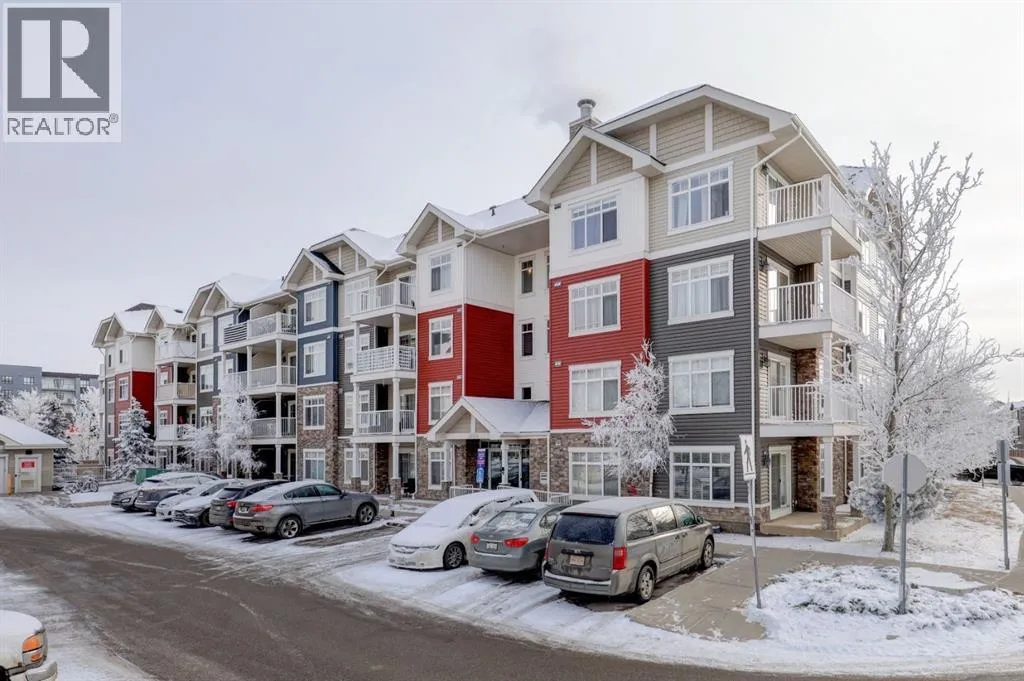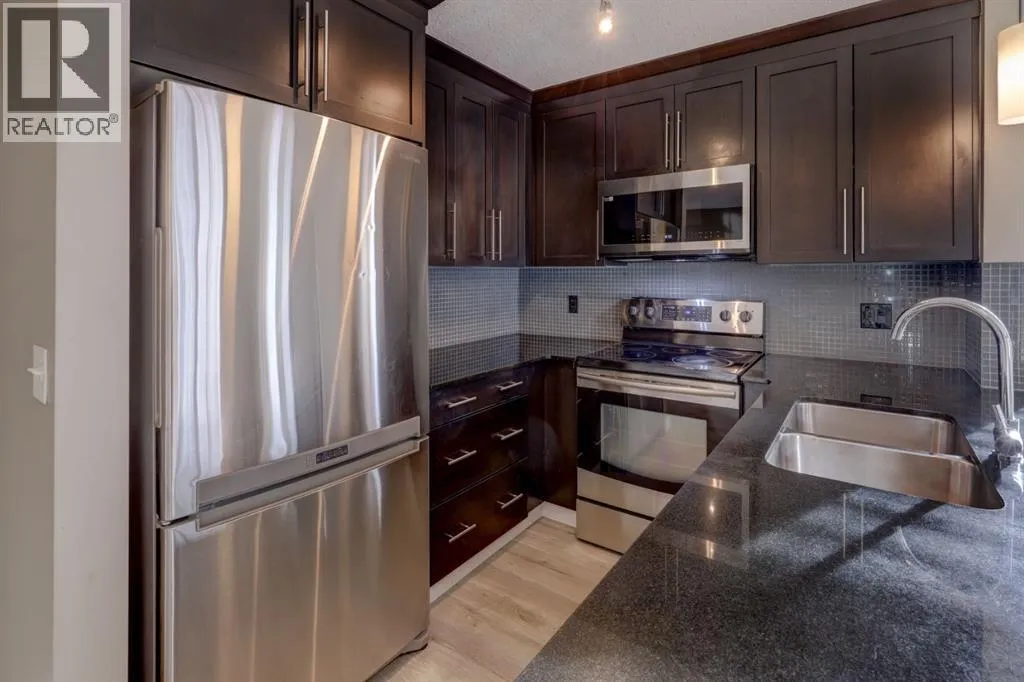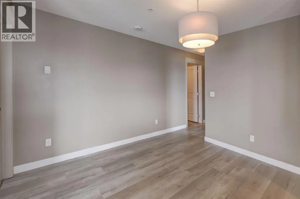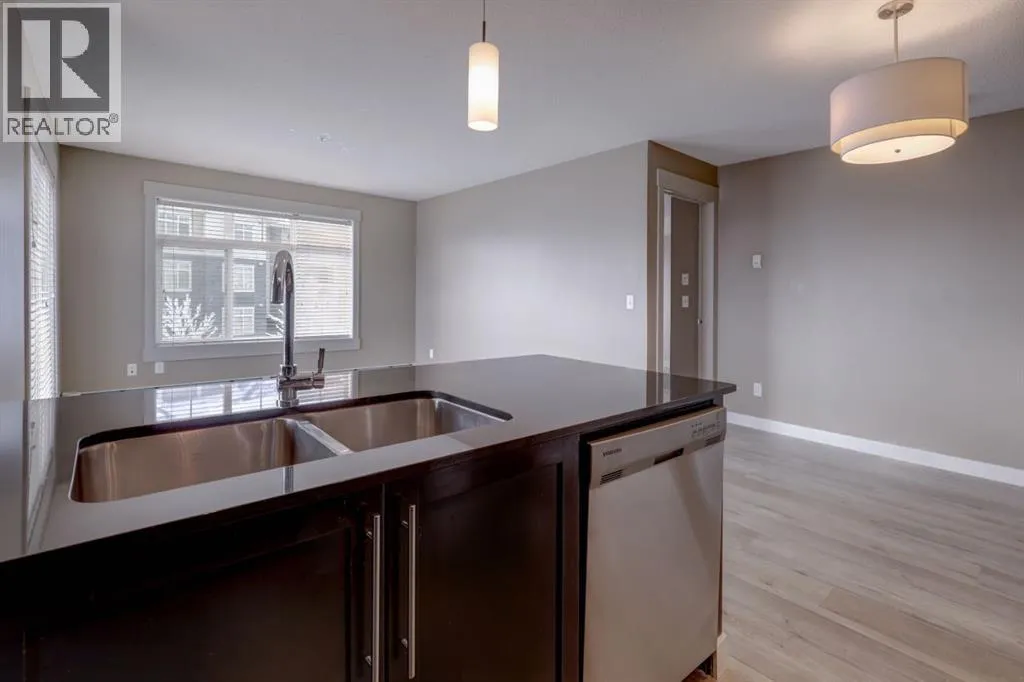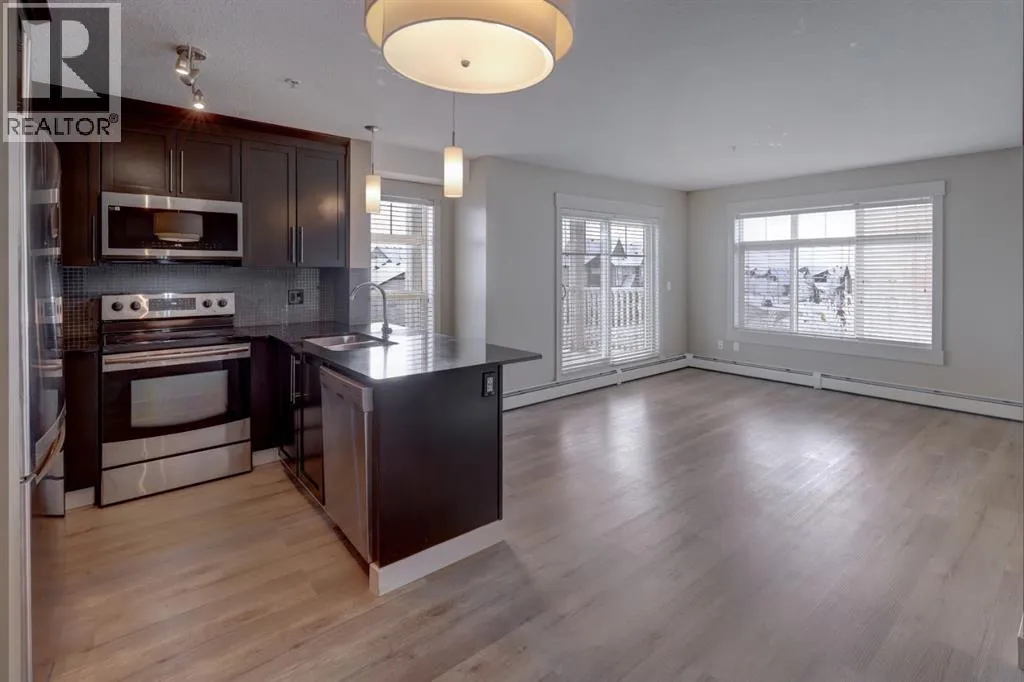 This contemporary corner unit offers 903 square foot of stylish living space with 2 bedrooms, 2 bathrooms and panoramic south-west exposure. Step out onto the balcony, complete with gas BBQ line and enjoy the stunning mountain views. Fresh laminate flooring and an open-concept design create a modern, airy feel that's filled with natural light throughout the day. The contemporary kitchen features dark-stained cabinetry, tiled backsplash, granite counter, and stainless steel appliances. The spacious primary bedroom includes a walk-through closet leading to a 4 piece ensuite, while the second bedroom and full bathroom provide flexibility for guests or a home office. The two bedrooms are thoughtfully positioned on opposite sides of the condo for added privacy - please see the included floor plan for full layout. Additional highlights include in-suite laundry, titled heated underground parking with a storage locker conveniently located directly in front of the stall. Ideally located with easy access to Stoney and Deerfoot Trail, just minutes from the airport and Cross Iron Mills, plus shopping, parks, schools, and everyday amenities nearby - including a bus stop right on the street. This move-in ready condo is available for immediate possession. It blends comfort, convenience and incredible views - a fantastic place to call home. Be sure to take time to explore the 3D virtual tour. (id:27476)