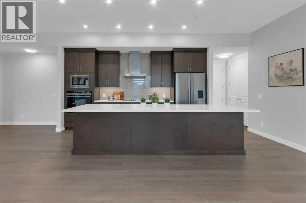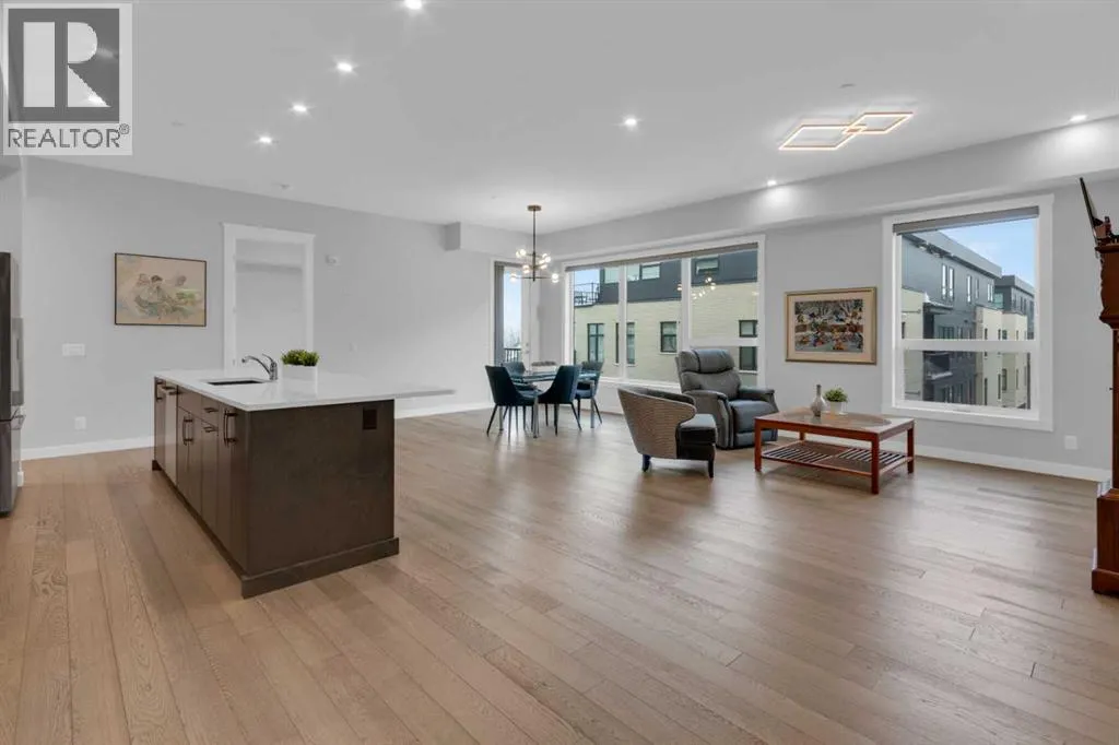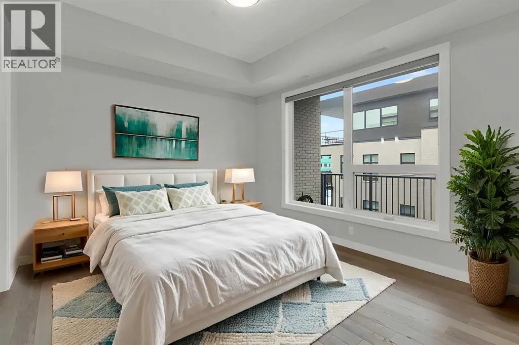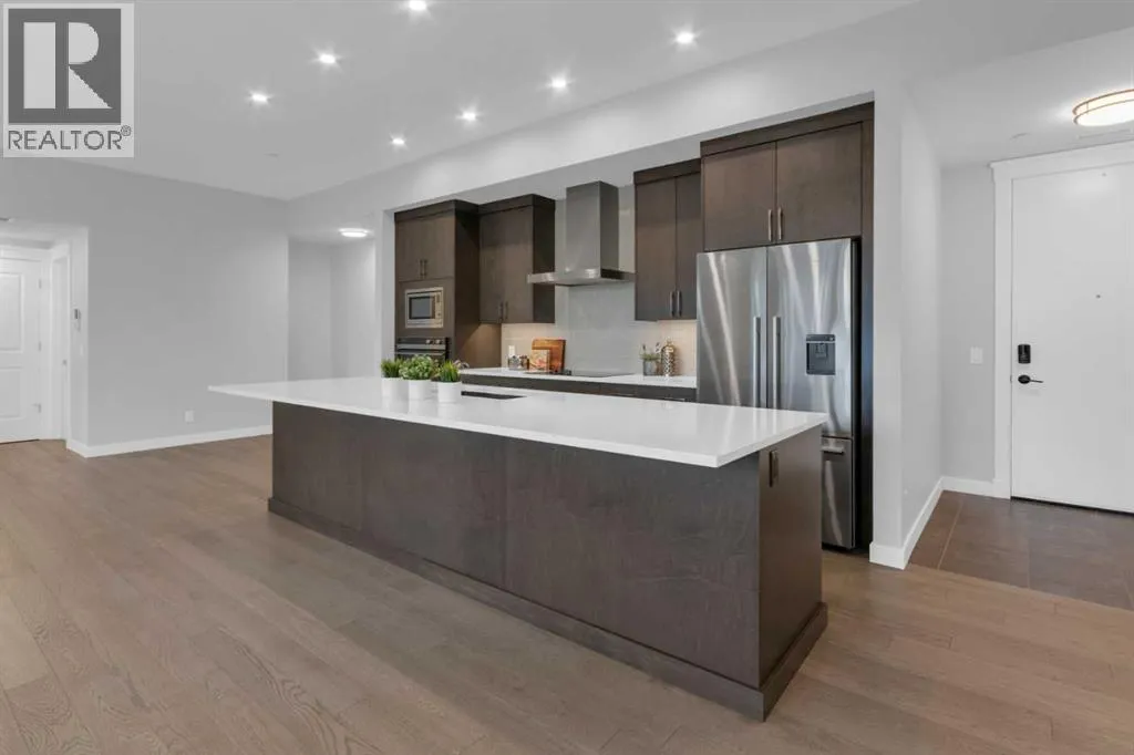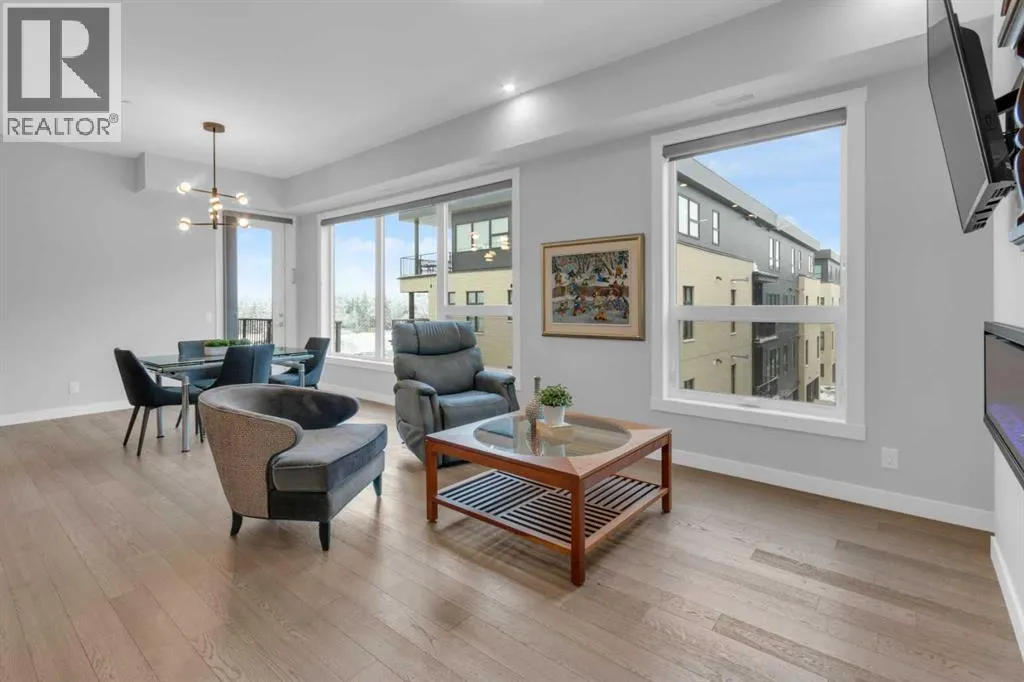 Welcome to Capella in University District, a small condo building with only 8 Estate Style single level luxury homes. This spacious and well laid-out 2 bedroom, 2 bathroom condo with single garage is just steps away from all of the amenities this highly desirable community offers. Located on the third floor is this modern residence with hardwood flooring, 10 foot ceilings, many large windows, central air conditioning, designer bathrooms and well-equipped spacious kitchen. The open concept main living space is flooded with natural light and features a sleek kitchen with expansive island, quartz countertops and full height cabinetry. The kitchen opens directly on to the dining space, the living room with electric fireplace, and a nook that works well for a den/office or as space for additional furniture. The bright primary suite offers enough space for a king size bed, a walk-in closet, and a 5-piece ensuite with heated floors, free standing tub, dual vanity, and fully tiled walk-in shower. The second bedroom has a murphy bed, a full bathroom across the hall, and is located on the other side of the condo from the primary bedroom, providing privacy between the bedrooms. Enjoy the morning sunrise on the spacious east-facing covered balcony that is equipped with a gas line for your BBQ or heater and a water line. The private, heated singe garage is attached to the building has epoxy floors, storage space, and a water softener for the condo unit. This well cared for building is part of a 7 building complex that offers a fitness centre, visitor parking, and courtyard spaces. Conveniently situated within walking distance to a grocery store, restaurants and coffee shops. Steps away from Market Mall, the U of C and the Children's Hospital and a quick commute to downtown and access out to the mountains. (id:27476)