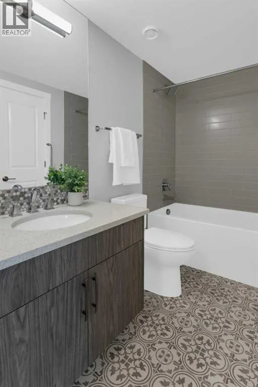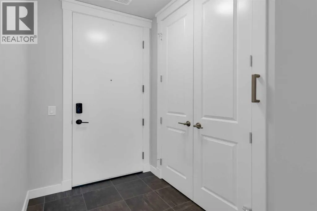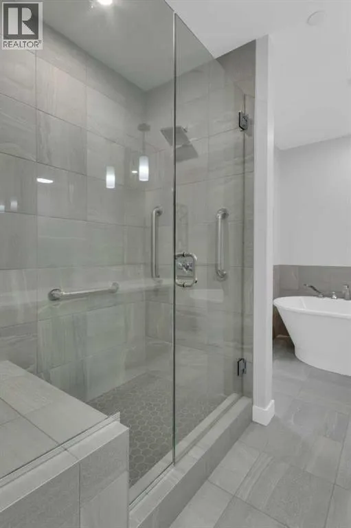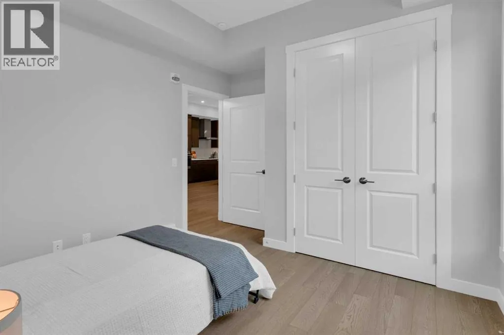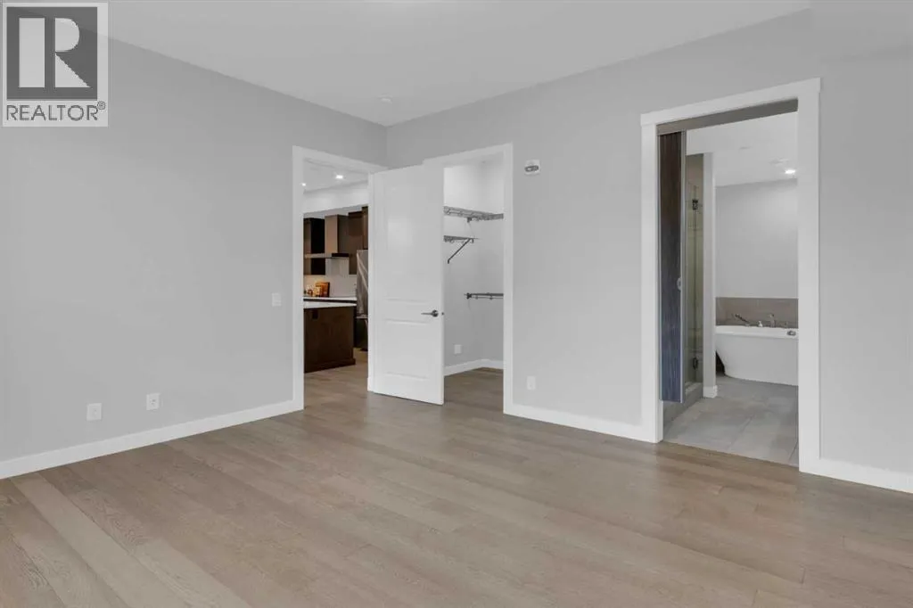 Welcome to Capella in University District, a small condo building with only 8 Estate Style single level luxury homes. This spacious and well laid-out 2 bedroom, 2 bathroom condo with single garage is just steps away from all of the amenities this highly desirable community offers. Located on the third floor is this modern residence with hardwood flooring, 10 foot ceilings, many large windows, central air conditioning, designer bathrooms and well-equipped spacious kitchen. The open concept main living space is flooded with natural light and features a sleek kitchen with expansive island, quartz countertops and full height cabinetry. The kitchen opens directly on to the dining space, the living room with electric fireplace, and a nook that works well for a den/office or as space for additional furniture. The bright primary suite offers enough space for a king size bed, a walk-in closet, and a 5-piece ensuite with heated floors, free standing tub, dual vanity, and fully tiled walk-in shower. The second bedroom has a murphy bed, a full bathroom across the hall, and is located on the other side of the condo from the primary bedroom, providing privacy between the bedrooms. Enjoy the morning sunrise on the spacious east-facing covered balcony that is equipped with a gas line for your BBQ or heater and a water line. The private, heated singe garage is attached to the building has epoxy floors, storage space, and a water softener for the condo unit. This well cared for building is part of a 7 building complex that offers a fitness centre, visitor parking, and courtyard spaces. Conveniently situated within walking distance to a grocery store, restaurants and coffee shops. Steps away from Market Mall, the U of C and the Children's Hospital and a quick commute to downtown and access out to the mountains. (id:27476)