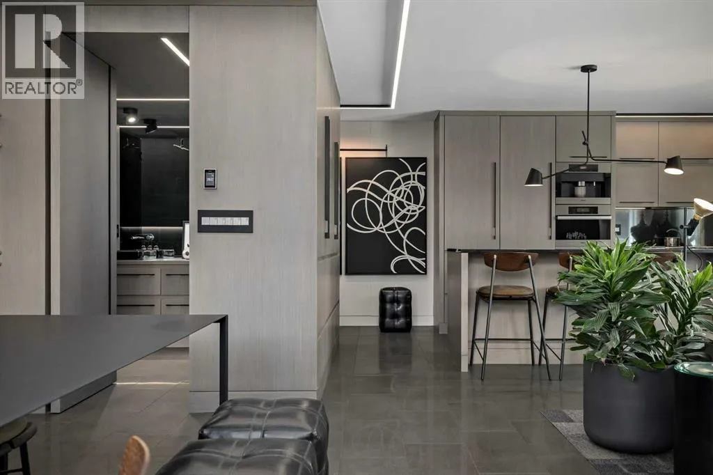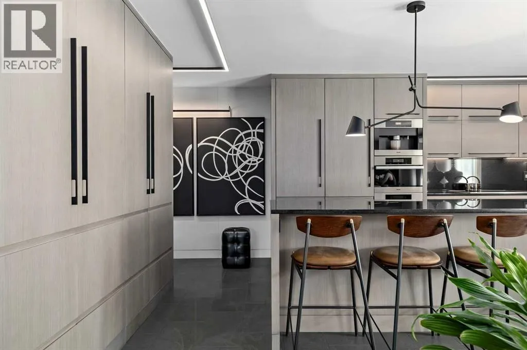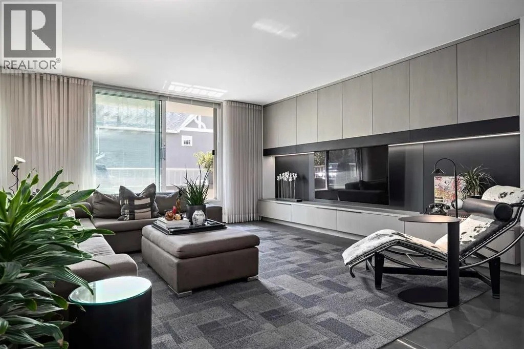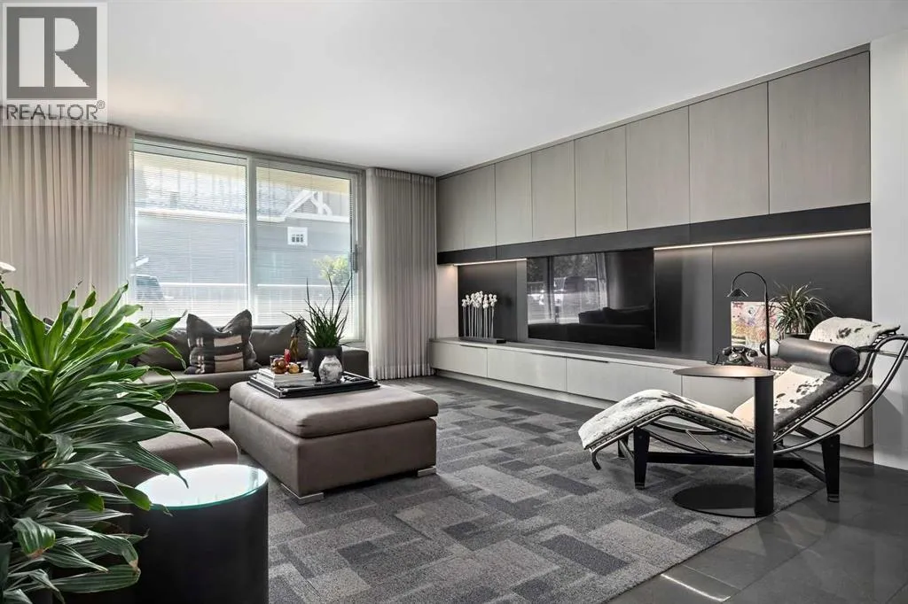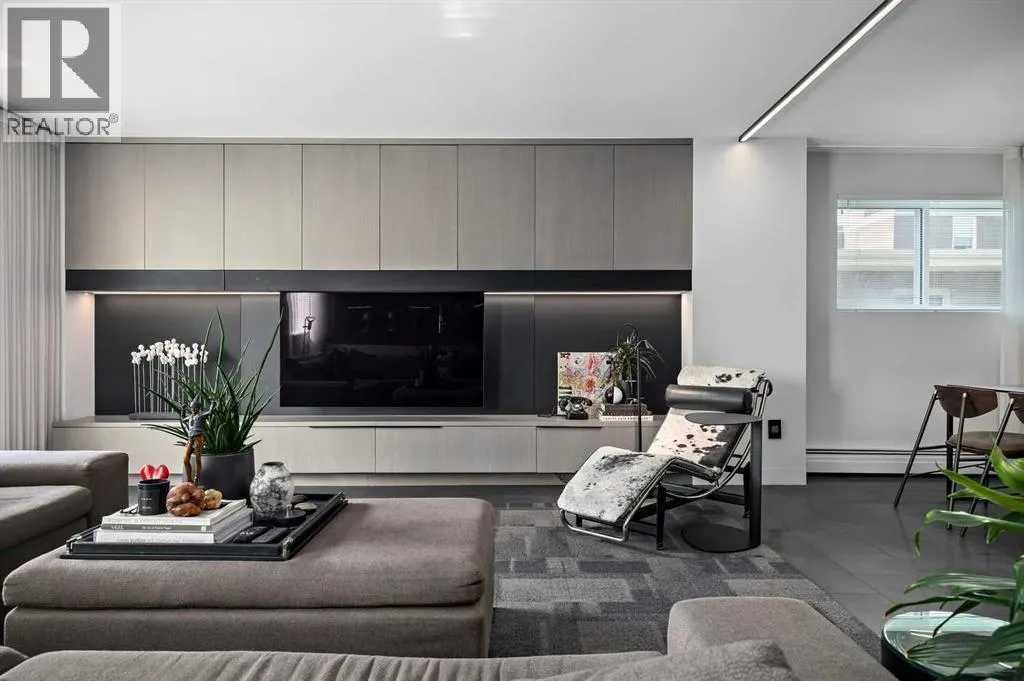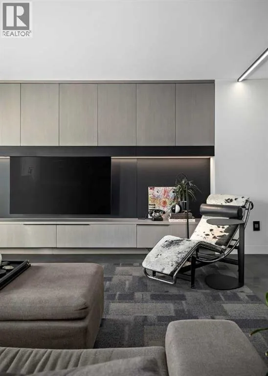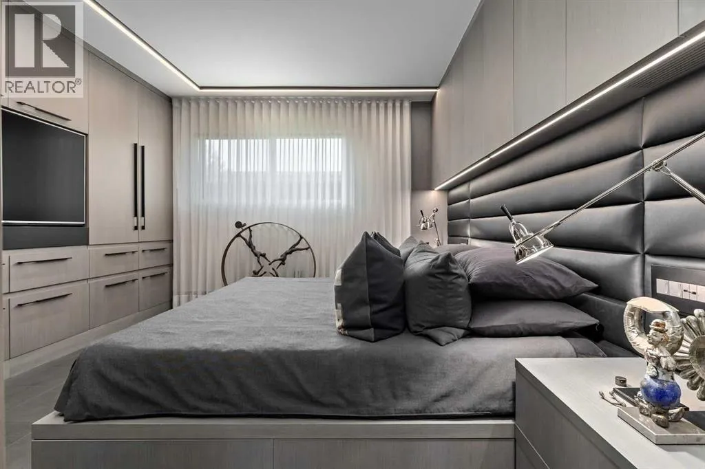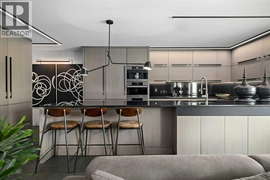 An unprecedented offering in Calgaryâs prestigious Mount Royal. Welcome to Palace Royale â a mid-century modern icon of concrete construction, meticulously revitalized with a new roof, boiler, elevator, and a fully restored exterior envelope. Perfectly poised steps from vibrant shops, galleries, cafés, and the downtown core, this residence fuses architectural pedigree with cosmopolitan living at its finest. Formerly a two-bedroom, the residence has been masterfully reimagined into a grand one-bedroom with an opulent dining salon â a bold design statement that can easily be converted back to 2 bedroom, if desired. Every inch of this 1,009 sq. ft. interior radiates luxury, with more than $300,000 invested in finishes and technology of uncompromising quality. The chefâs kitchen is a triumph of form and function: reconstructed oak millwork, striking black granite surfaces, and a fully integrated Miele ensemble â including built-in coffee station, steam and wall ovens, dishwasher, 32â induction cooktop with concealed Faber hood, and freestanding refrigerator/freezer. This is a kitchen designed not merely for cooking, but for performance. The living space is both dramatic and intimate, defined by architectural millwork, black glass accents, and LED illumination. Hidden at first glance, entertainment unfolds with a motorized 65â drop-down television, James Loudspeakers, subwoofer, and six-zone surround sound â transforming the room into a private cinema. The primary suite is pure indulgence: wall-to-wall wardrobes, a custom platform bed with integrated storage, leather-padded headboard accented with linear LED lighting, and a discreetly incorporated 55â television with Bluesound audio. The ensuite rivals world-class spas with bespoke cabinetry, a sculptural black-glass shower, Kohler fixtures, and a soaring mirror wall. The main bath is equally spectacular, anchored by a double porcelain Lappato tile shower with multiple showerheads encased in glass â an architectural cent erpiece rarely seen even in the cityâs most exclusive residences. Refinements extend throughout: porcelain Lappato flooring, triple-pane Lux windows, Ripplefold drapery with Hunter Douglas blinds, reverse-osmosis water filtration, soft water system, LeGrand lighting controls, and bespoke foyer millwork concealing pantry, coat, and shoe storage. Step outside to the wraparound south- and west-facing balcony, where lush treetop views give way to the glittering downtown skyline. Complete with a built-in Broil King BBQ and elegant lounge area, it is an outdoor sanctuary unlike any other. A private adjacent storage room and secure underground parking stall elevate both convenience and exclusivity. Palace Royale is more than a home â it is theatre, artistry, and refinement. A singular residence for the connoisseur who demands the exceptional, set within one of Calgaryâs most celebrated enclaves. (id:27476)
