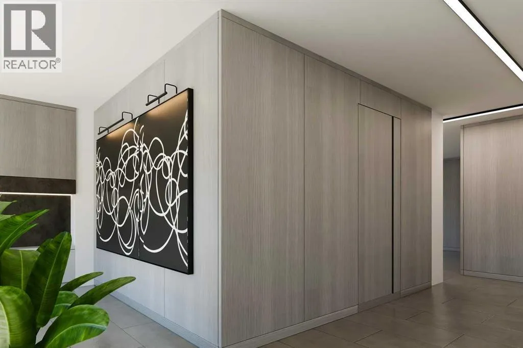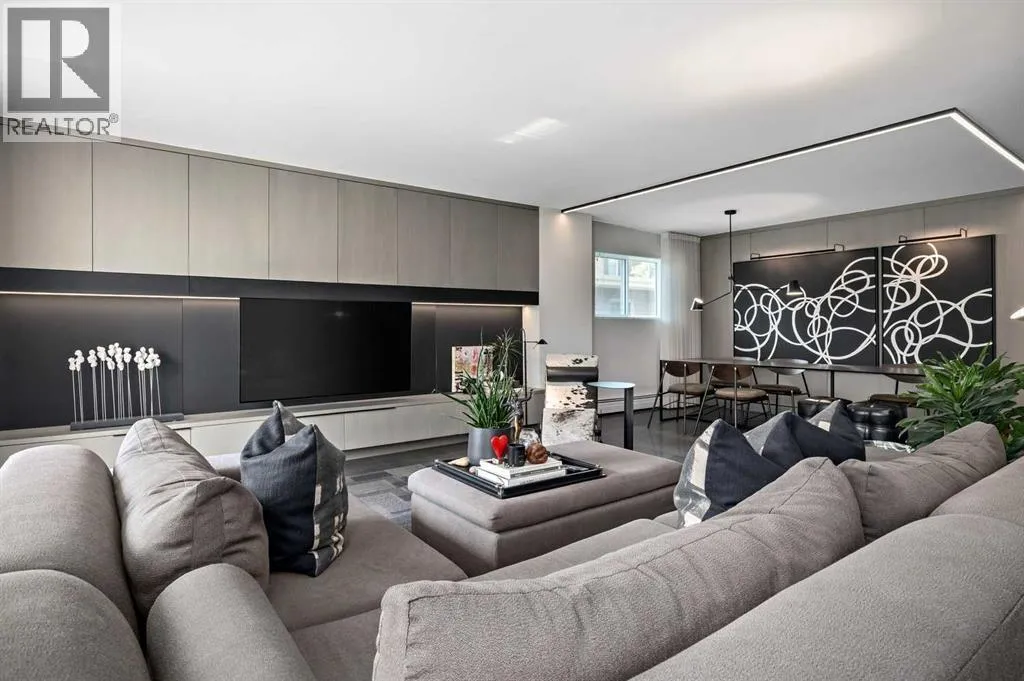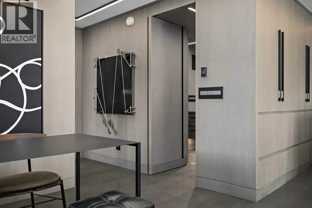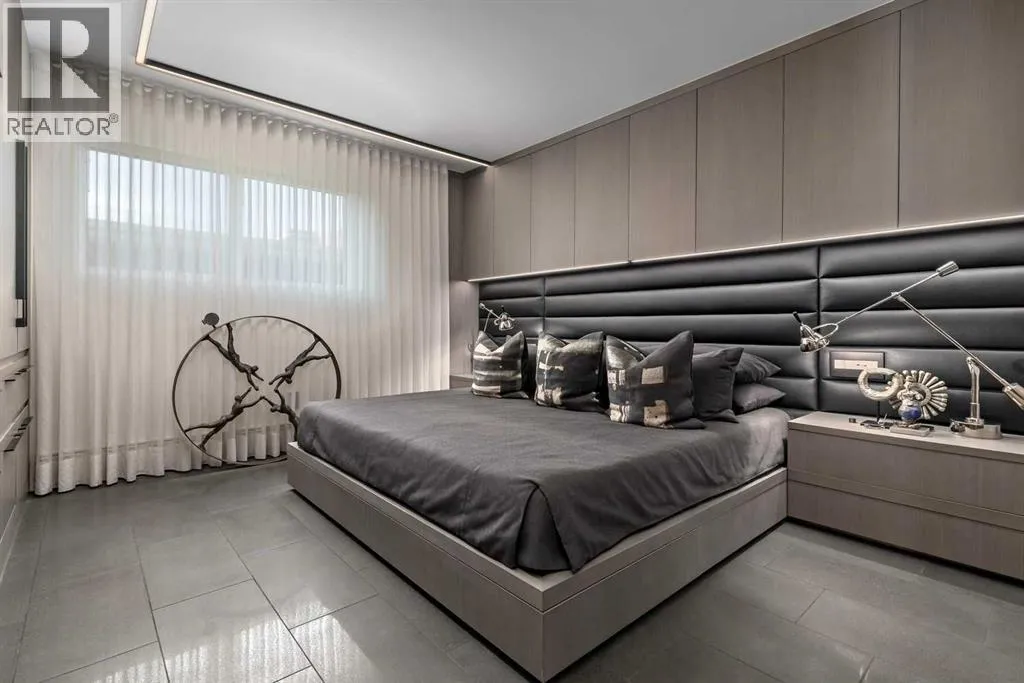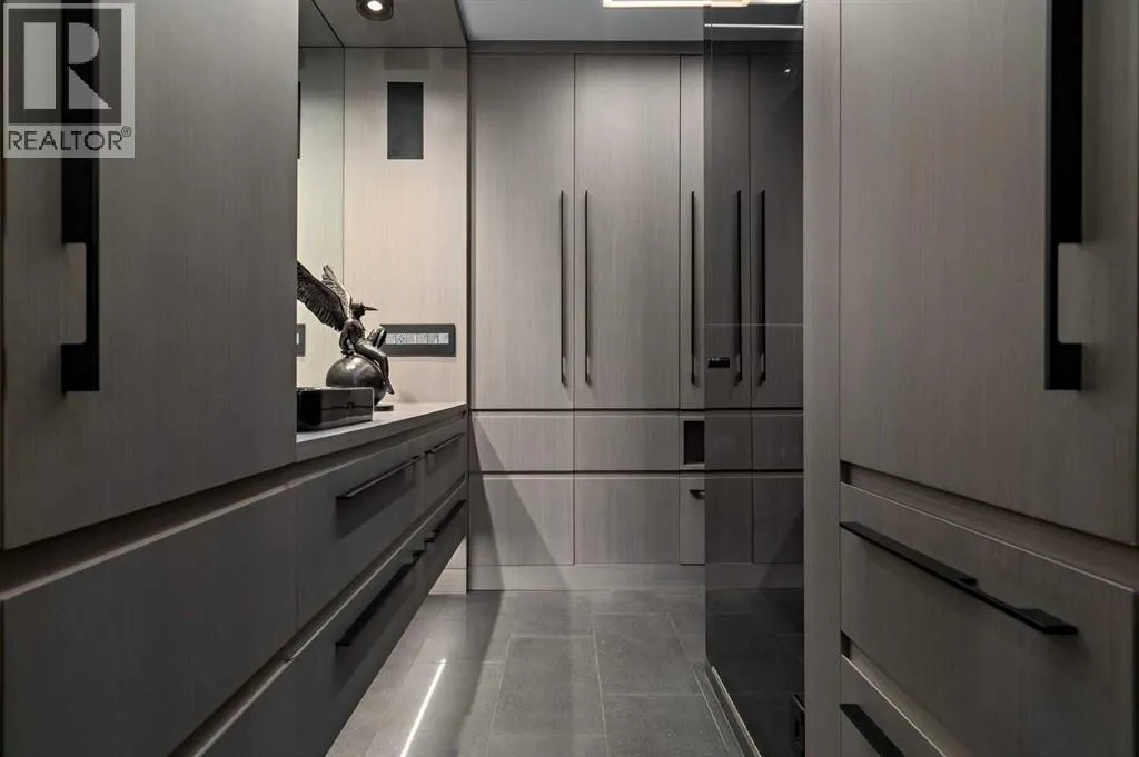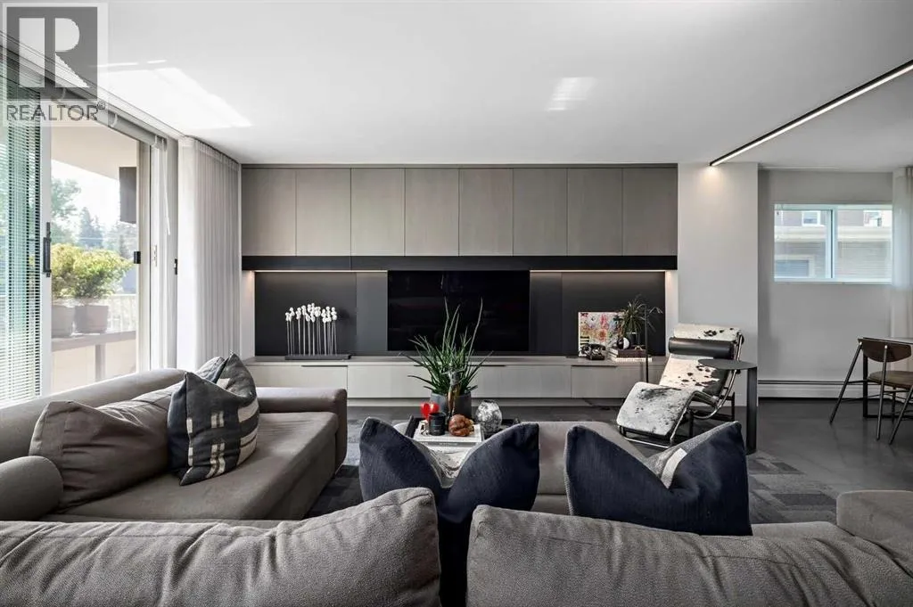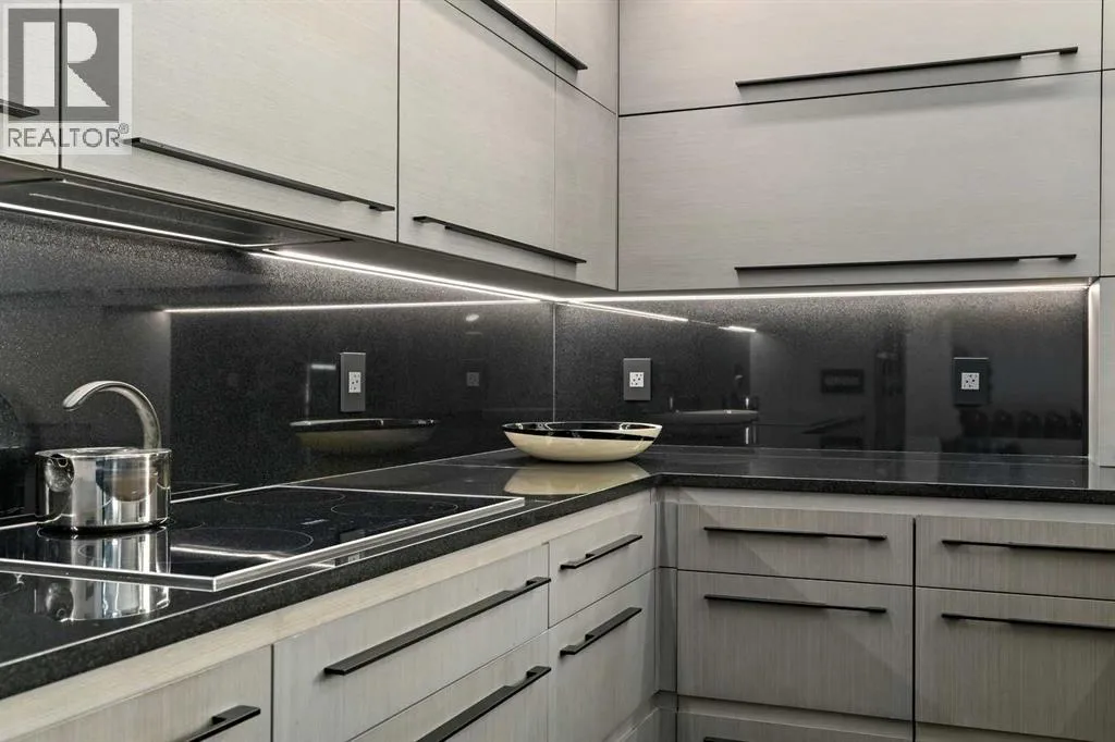 An unprecedented offering in Calgaryâs prestigious Mount Royal. Welcome to Palace Royale â a mid-century modern icon of concrete construction, meticulously revitalized with a new roof, boiler, elevator, and a fully restored exterior envelope. Perfectly poised steps from vibrant shops, galleries, cafés, and the downtown core, this residence fuses architectural pedigree with cosmopolitan living at its finest. Formerly a two-bedroom, the residence has been masterfully reimagined into a grand one-bedroom with an opulent dining salon â a bold design statement that can easily be converted back to 2 bedroom, if desired. Every inch of this 1,009 sq. ft. interior radiates luxury, with more than $300,000 invested in finishes and technology of uncompromising quality. The chefâs kitchen is a triumph of form and function: reconstructed oak millwork, striking black granite surfaces, and a fully integrated Miele ensemble â including built-in coffee station, steam and wall ovens, dishwasher, 32â induction cooktop with concealed Faber hood, and freestanding refrigerator/freezer. This is a kitchen designed not merely for cooking, but for performance. The living space is both dramatic and intimate, defined by architectural millwork, black glass accents, and LED illumination. Hidden at first glance, entertainment unfolds with a motorized 65â drop-down television, James Loudspeakers, subwoofer, and six-zone surround sound â transforming the room into a private cinema. The primary suite is pure indulgence: wall-to-wall wardrobes, a custom platform bed with integrated storage, leather-padded headboard accented with linear LED lighting, and a discreetly incorporated 55â television with Bluesound audio. The ensuite rivals world-class spas with bespoke cabinetry, a sculptural black-glass shower, Kohler fixtures, and a soaring mirror wall. The main bath is equally spectacular, anchored by a double porcelain Lappato tile shower with multiple showerheads encased in glass â an architectural cent erpiece rarely seen even in the cityâs most exclusive residences. Refinements extend throughout: porcelain Lappato flooring, triple-pane Lux windows, Ripplefold drapery with Hunter Douglas blinds, reverse-osmosis water filtration, soft water system, LeGrand lighting controls, and bespoke foyer millwork concealing pantry, coat, and shoe storage. Step outside to the wraparound south- and west-facing balcony, where lush treetop views give way to the glittering downtown skyline. Complete with a built-in Broil King BBQ and elegant lounge area, it is an outdoor sanctuary unlike any other. A private adjacent storage room and secure underground parking stall elevate both convenience and exclusivity. Palace Royale is more than a home â it is theatre, artistry, and refinement. A singular residence for the connoisseur who demands the exceptional, set within one of Calgaryâs most celebrated enclaves. (id:27476)