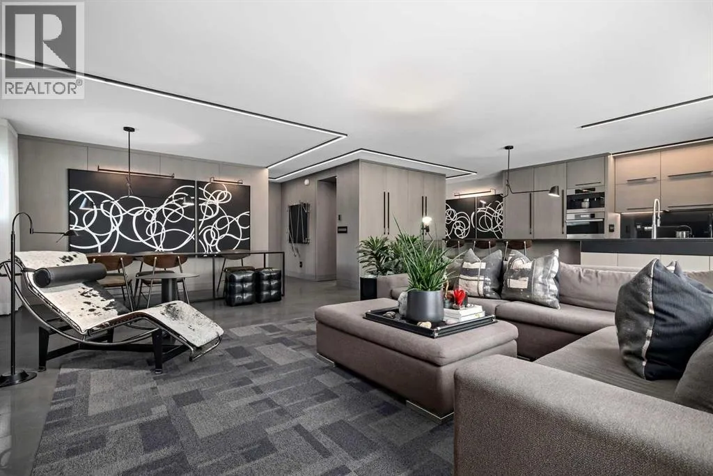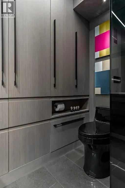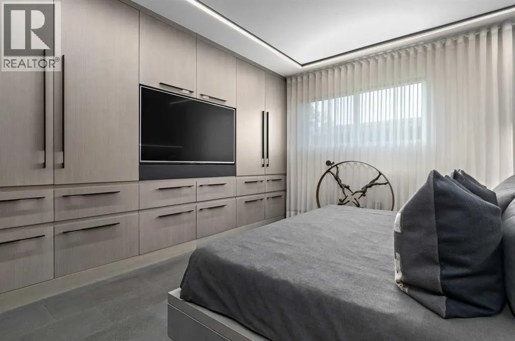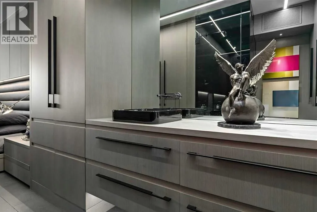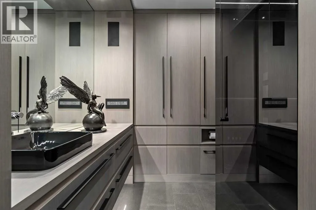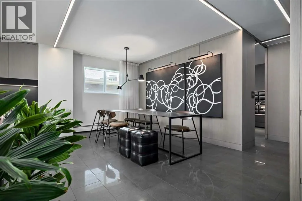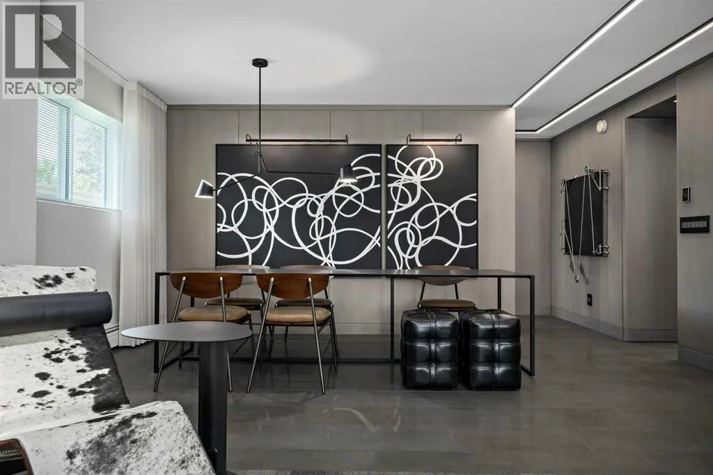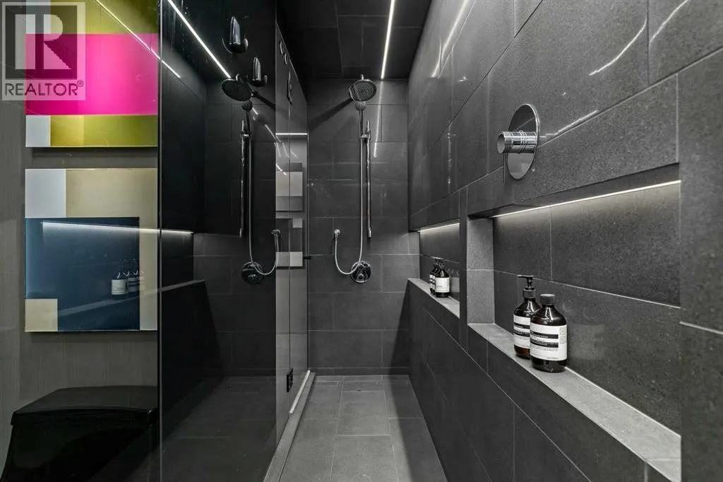 An unprecedented offering in Calgaryâs prestigious Mount Royal. Welcome to Palace Royale â a mid-century modern icon of concrete construction, meticulously revitalized with a new roof, boiler, elevator, and a fully restored exterior envelope. Perfectly poised steps from vibrant shops, galleries, cafés, and the downtown core, this residence fuses architectural pedigree with cosmopolitan living at its finest. Formerly a two-bedroom, the residence has been masterfully reimagined into a grand one-bedroom with an opulent dining salon â a bold design statement that can easily be converted back to 2 bedroom, if desired. Every inch of this 1,009 sq. ft. interior radiates luxury, with more than $300,000 invested in finishes and technology of uncompromising quality. The chefâs kitchen is a triumph of form and function: reconstructed oak millwork, striking black granite surfaces, and a fully integrated Miele ensemble â including built-in coffee station, steam and wall ovens, dishwasher, 32â induction cooktop with concealed Faber hood, and freestanding refrigerator/freezer. This is a kitchen designed not merely for cooking, but for performance. The living space is both dramatic and intimate, defined by architectural millwork, black glass accents, and LED illumination. Hidden at first glance, entertainment unfolds with a motorized 65â drop-down television, James Loudspeakers, subwoofer, and six-zone surround sound â transforming the room into a private cinema. The primary suite is pure indulgence: wall-to-wall wardrobes, a custom platform bed with integrated storage, leather-padded headboard accented with linear LED lighting, and a discreetly incorporated 55â television with Bluesound audio. The ensuite rivals world-class spas with bespoke cabinetry, a sculptural black-glass shower, Kohler fixtures, and a soaring mirror wall. The main bath is equally spectacular, anchored by a double porcelain Lappato tile shower with multiple showerheads encased in glass â an architectural cent erpiece rarely seen even in the cityâs most exclusive residences. Refinements extend throughout: porcelain Lappato flooring, triple-pane Lux windows, Ripplefold drapery with Hunter Douglas blinds, reverse-osmosis water filtration, soft water system, LeGrand lighting controls, and bespoke foyer millwork concealing pantry, coat, and shoe storage. Step outside to the wraparound south- and west-facing balcony, where lush treetop views give way to the glittering downtown skyline. Complete with a built-in Broil King BBQ and elegant lounge area, it is an outdoor sanctuary unlike any other. A private adjacent storage room and secure underground parking stall elevate both convenience and exclusivity. Palace Royale is more than a home â it is theatre, artistry, and refinement. A singular residence for the connoisseur who demands the exceptional, set within one of Calgaryâs most celebrated enclaves. (id:27476)