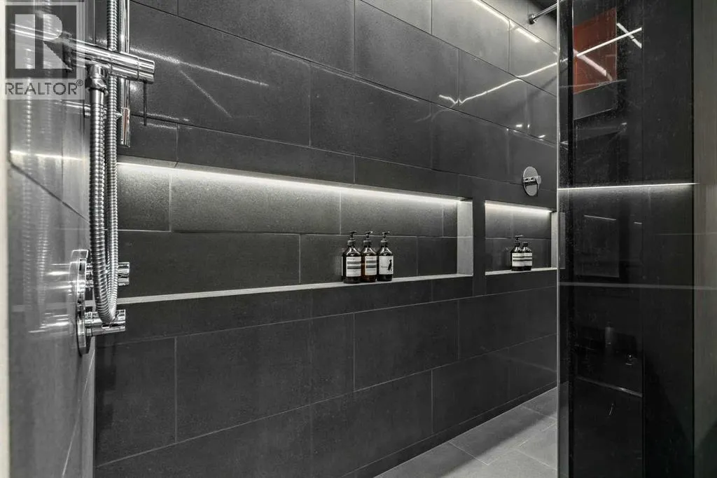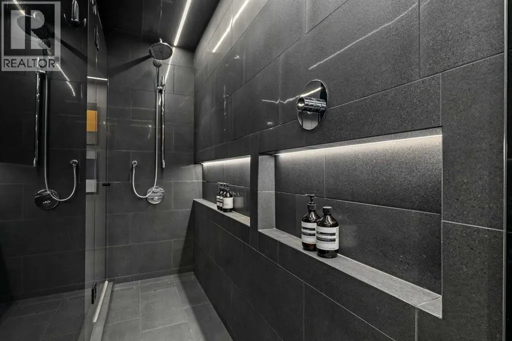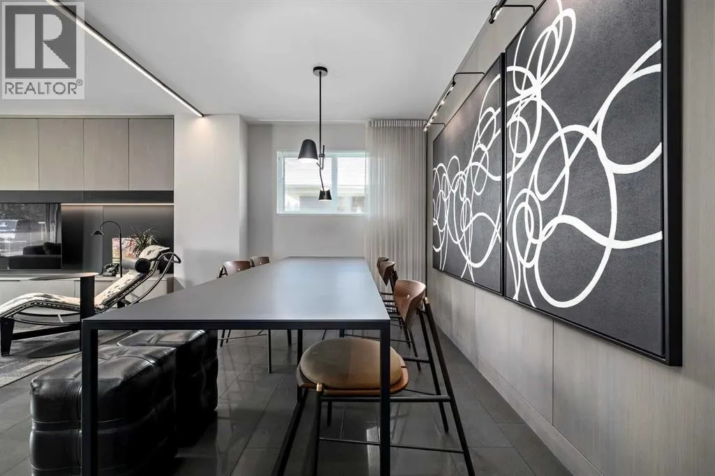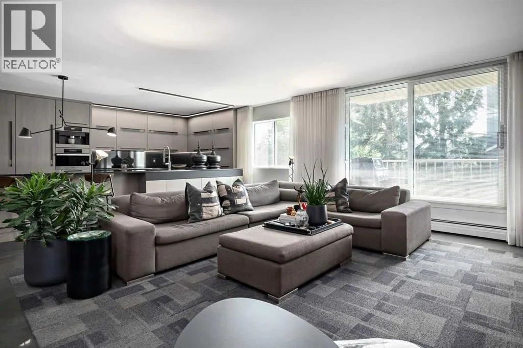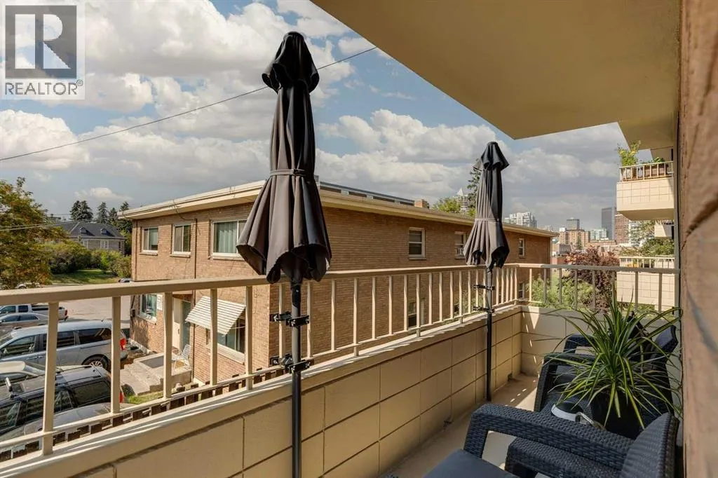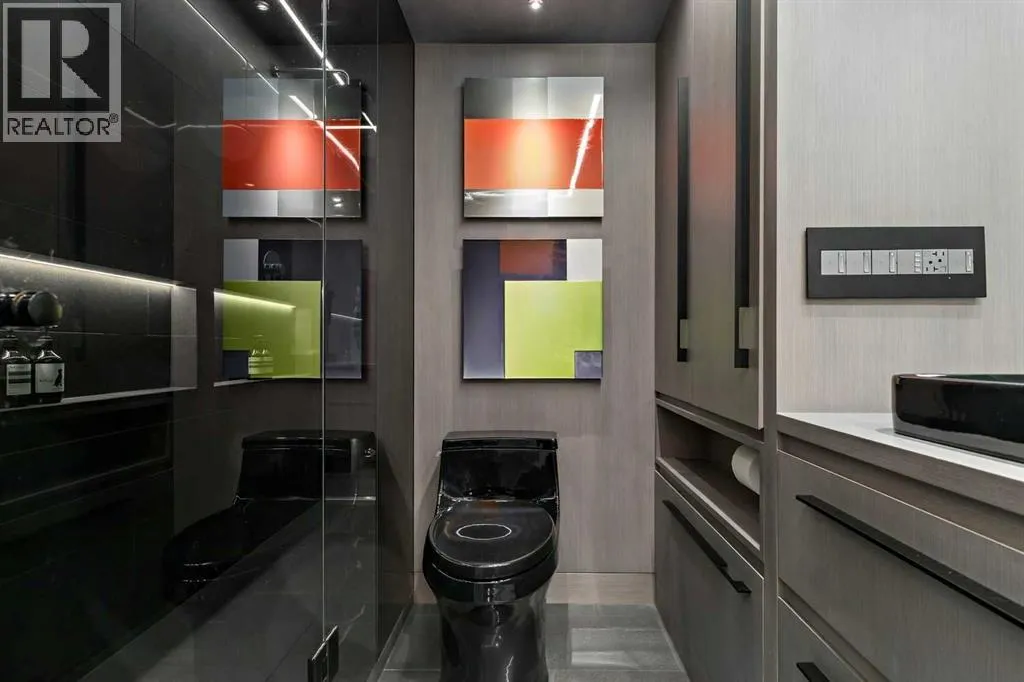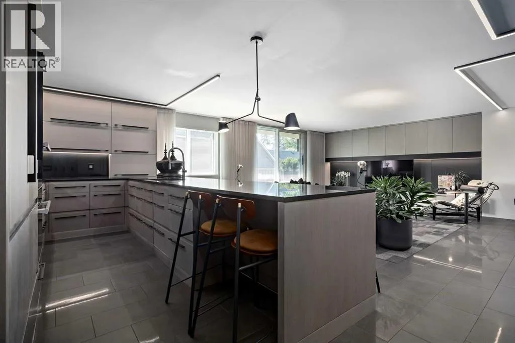 An unprecedented offering in Calgaryâs prestigious Mount Royal. Welcome to Palace Royale â a mid-century modern icon of concrete construction, meticulously revitalized with a new roof, boiler, elevator, and a fully restored exterior envelope. Perfectly poised steps from vibrant shops, galleries, cafés, and the downtown core, this residence fuses architectural pedigree with cosmopolitan living at its finest. Formerly a two-bedroom, the residence has been masterfully reimagined into a grand one-bedroom with an opulent dining salon â a bold design statement that can easily be converted back to 2 bedroom, if desired. Every inch of this 1,009 sq. ft. interior radiates luxury, with more than $300,000 invested in finishes and technology of uncompromising quality. The chefâs kitchen is a triumph of form and function: reconstructed oak millwork, striking black granite surfaces, and a fully integrated Miele ensemble â including built-in coffee station, steam and wall ovens, dishwasher, 32â induction cooktop with concealed Faber hood, and freestanding refrigerator/freezer. This is a kitchen designed not merely for cooking, but for performance. The living space is both dramatic and intimate, defined by architectural millwork, black glass accents, and LED illumination. Hidden at first glance, entertainment unfolds with a motorized 65â drop-down television, James Loudspeakers, subwoofer, and six-zone surround sound â transforming the room into a private cinema. The primary suite is pure indulgence: wall-to-wall wardrobes, a custom platform bed with integrated storage, leather-padded headboard accented with linear LED lighting, and a discreetly incorporated 55â television with Bluesound audio. The ensuite rivals world-class spas with bespoke cabinetry, a sculptural black-glass shower, Kohler fixtures, and a soaring mirror wall. The main bath is equally spectacular, anchored by a double porcelain Lappato tile shower with multiple showerheads encased in glass â an architectural cent erpiece rarely seen even in the cityâs most exclusive residences. Refinements extend throughout: porcelain Lappato flooring, triple-pane Lux windows, Ripplefold drapery with Hunter Douglas blinds, reverse-osmosis water filtration, soft water system, LeGrand lighting controls, and bespoke foyer millwork concealing pantry, coat, and shoe storage. Step outside to the wraparound south- and west-facing balcony, where lush treetop views give way to the glittering downtown skyline. Complete with a built-in Broil King BBQ and elegant lounge area, it is an outdoor sanctuary unlike any other. A private adjacent storage room and secure underground parking stall elevate both convenience and exclusivity. Palace Royale is more than a home â it is theatre, artistry, and refinement. A singular residence for the connoisseur who demands the exceptional, set within one of Calgaryâs most celebrated enclaves. (id:27476)