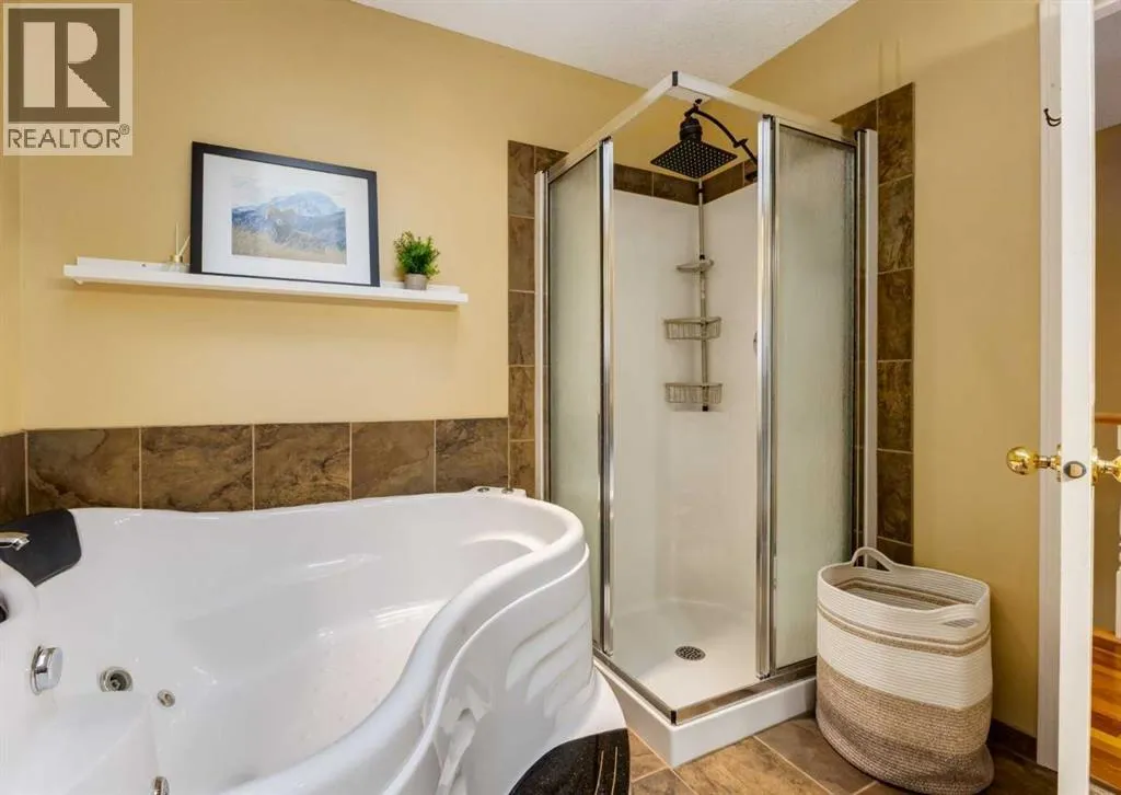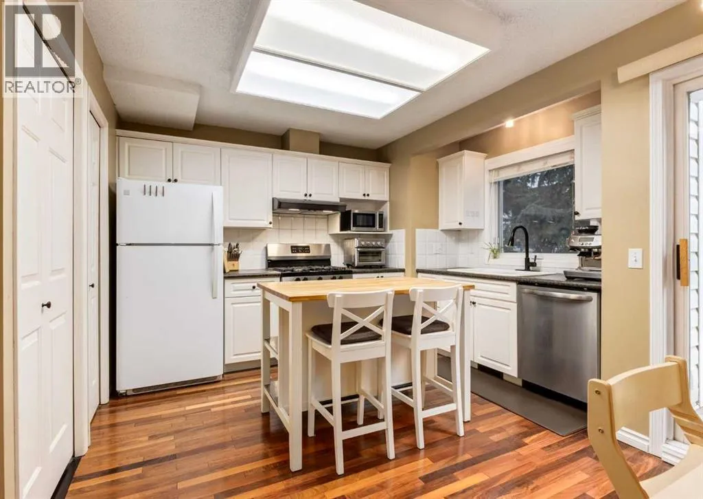 Discover refined urban living nestled in the heart of Tuxedo Parkâone of Calgary's most convenient and charming inner-city neighbourhoods. Enjoy exceptional walkability to trendy shops, diverse restaurants, lush parks, golf courses, and top-rated schools, with seamless access to Highway 1, Deerfoot Trail, downtown Calgary, and the airport. This bright move-in-ready home showcases expansive windows flooding the space with natural light, tasteful neutral colors, and central air conditioning for year-round comfort. Step inside to an inviting main level featuring a spacious living room anchored by a cozy corner gas fireplaceâperfect for relaxing evenings. Flow seamlessly into the dining area and white kitchen, complete with a generous island for casual meals, ample pantry storage, and convenient main-floor laundry. A stylish powder room and direct access to your private balcony complete this entertaining-friendly floor. Ascend to the upper level, where a luxurious spa-like bathroom awaits with dual sinks, a skylight bathing the space in sunlight, an oversized shower, and a jetted soaking tub for ultimate relaxation. Two well-proportioned bedrooms include the serene primary suite with soaring vaulted ceilings and its own exclusive balconyâan ideal retreat. The fully developed lower level offers a versatile third bedroom/den or media room with a full ensuite bath, plus direct entry to the attached single garage for added convenience. Multiple outdoor havens, including upper and lower balconies plus a ground-level deck, make al fresco dining and summer gatherings effortless. This Tuxedo Park treasure perfectly blends sophisticated style, practical design, and an unbeatable locationâurban vibrancy meets tranquil escape. Don't miss this must-see home; check out the video in the media link and schedule your private viewing today! (id:27476)