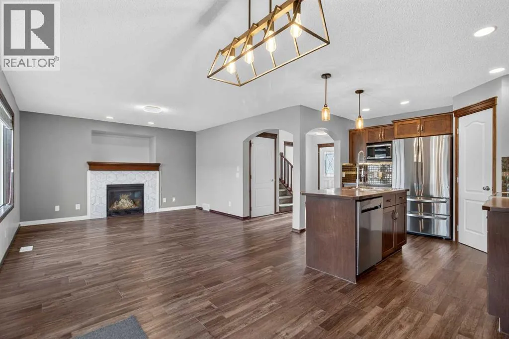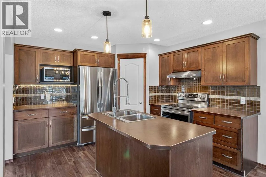 Located in the heart of McKenzie Towne's Elgin Village, this well-maintained two-storey home offers over 2,000 sq ft of fully developed living space and a layout that suits today's lifestyle.The main floor is both welcoming and functional, featuring a dedicated front office or main-floor bedroom, a convenient two-piece bathroom, and an open-concept living area designed for everyday living and entertaining. The kitchen is thoughtfully laid out with a central island, stainless steel appliances, ample cabinetry, and a walk-in pantry, flowing seamlessly into the dining area and bright living room.Upstairs, you will find three bedrooms, including a comfortable primary retreat with a four-piece ensuite and walk-in closet, along with a full main bathroom for the additional bedrooms.The fully developed basement adds exceptional versatility, offering a spacious recreation and theatre room, wet bar, wired surround-sound, a fourth bedroom, and a three-piece bathroom, making it ideal for guests, teens, or movie nights at home.Outside, enjoy a low-maintenance backyard complete with composite deck, artificial turf, and a private hot tub, perfect for relaxing year-round. The oversized heated and insulated detached triple garage (30' x 26') features 9-foot ceilings and a storage loft, providing excellent space for vehicles, hobbies, and additional storage.Additional highlights include central air conditioning, a continuous hot water system, Kinetico water softener, and a dedicated laundry room.Ideally situated within walking distance to McKenzie Highlands School, parks, pathways, and McKenzie Towne Centre, with convenient access to South Health Campus, this home offers a rare combination of space, function, and community living in one of southeast Calgary's most established neighbourhoods. (id:27476)