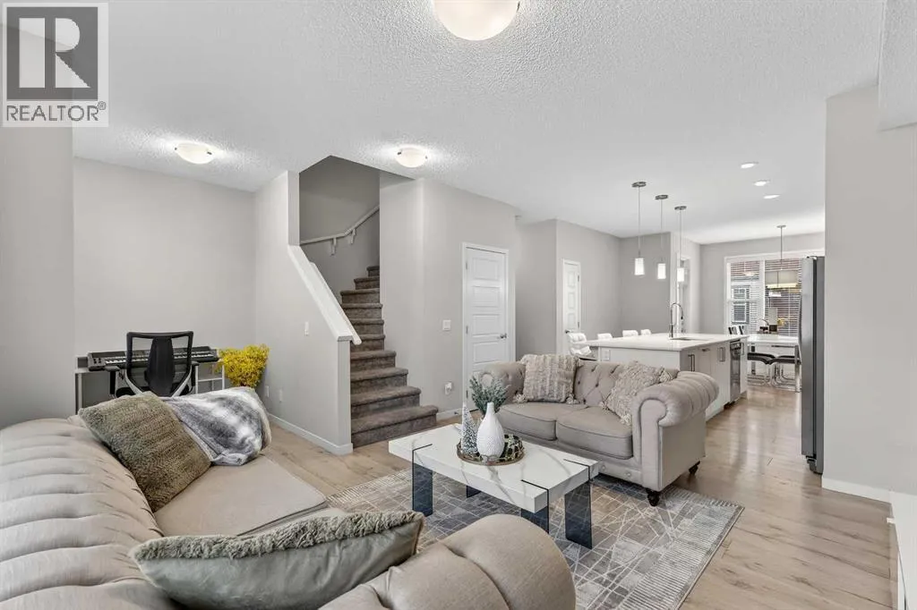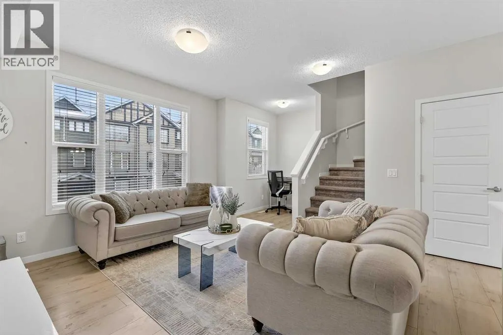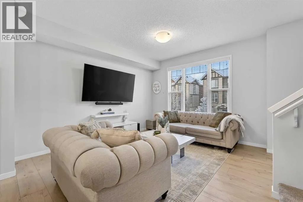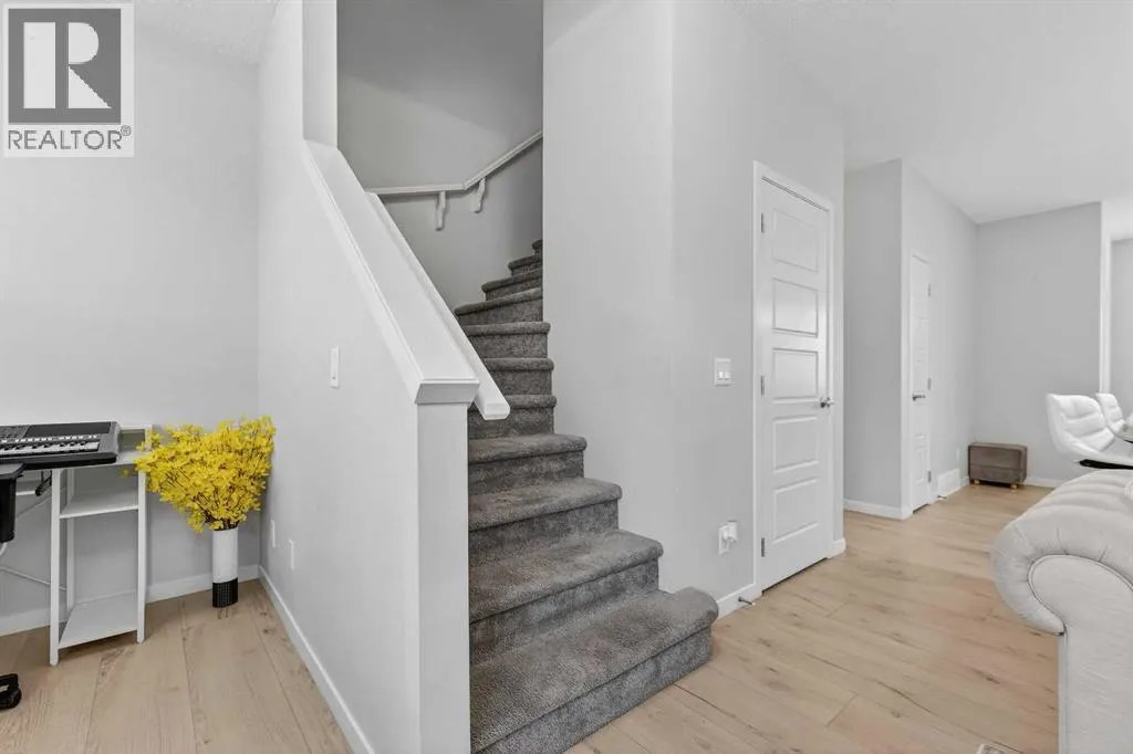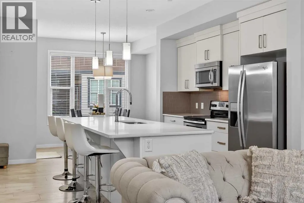 DOUBLE ATTACHED GARAGE with PARKING PAD, and green space. 1600 sq/ft TOWNHOME in the upscale community of New Brighton. The front patio area faces a sunny green space and walkway providing the perfect space for you to sit and relax. Upon entering you are greeted with a LARGE foyer with TONS of storage, a separate laundry room and access to your attached double garage with a full double driveway to allow for extra parking. Upstairs on the second level is a bright airy common space with lofty 9 FT CEILINGS. The spacious bright kitchen features white QUARTZ countertops, full upper cacbinets, a pantry and an OVERSIZED 10 FT ISLAND - perfect for entertaining! The dining area provides ample seating space. while the bright living room flows seamlessly onto the covered balcony with a gas line BBQ hookup. Adjacent to the living area, you'll find a handy office nook. A 2-piece guest bath adds extra convenience. Third level is the Master Bedroom with WALK-IN closet and 3 pce ENSUITE bathroom. Two additional Bedrooms and another 4pce bathroom complete the upstairs. Don't miss this opportunity to live in this beautiful area. This home has everything you or your young family needs. Close to Parks, Schools, South Trail Crossing Shopping, Transit, New Brighton Community Center and Athletic Park with Skating, Water Park, Tennis & more! (id:27476)