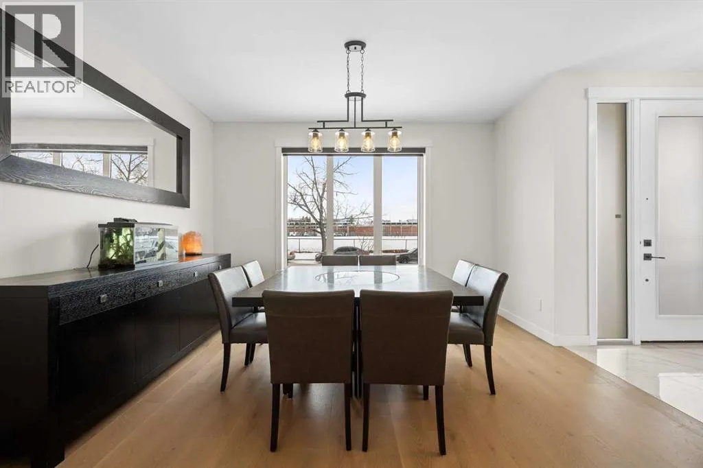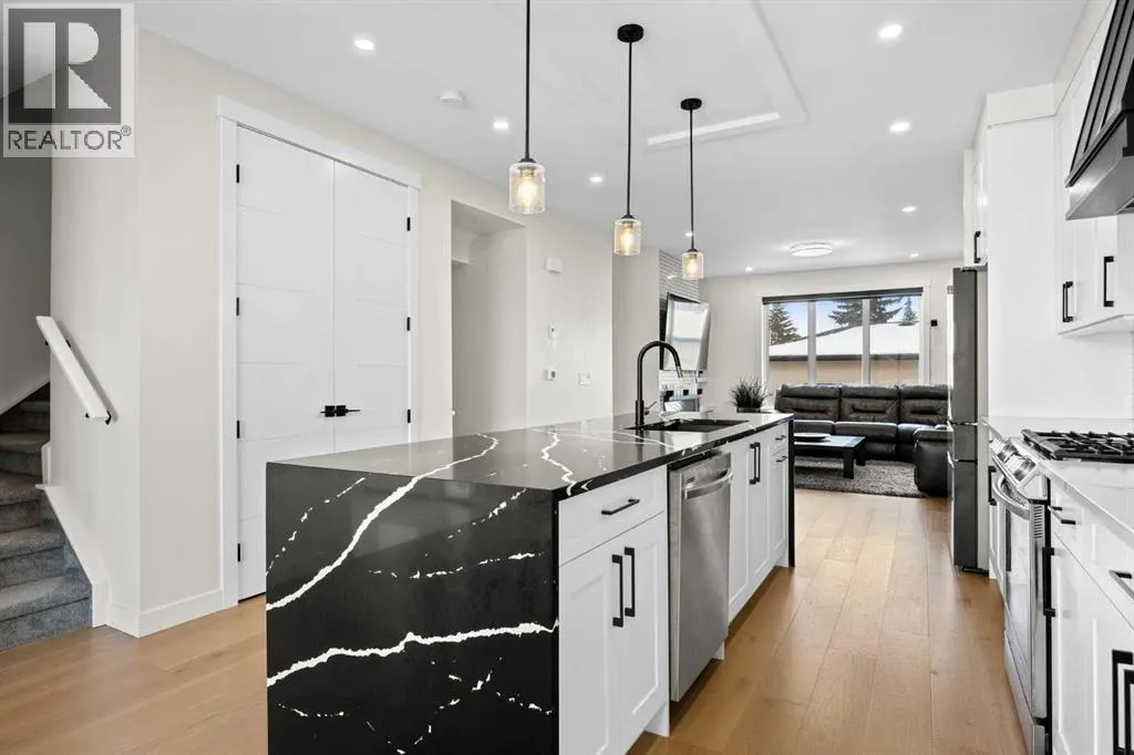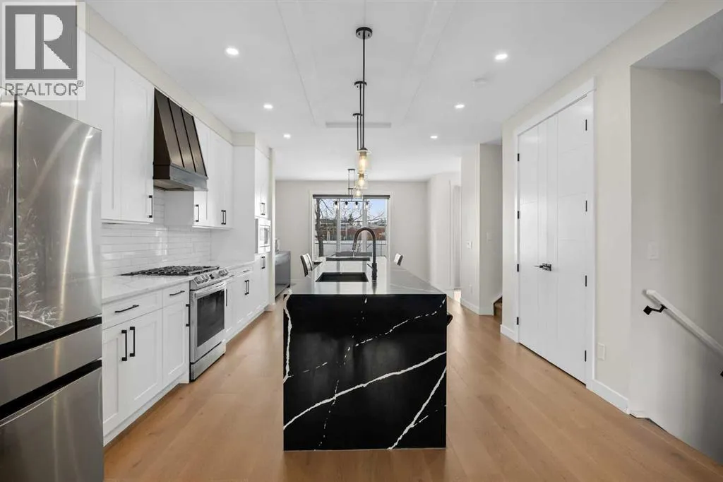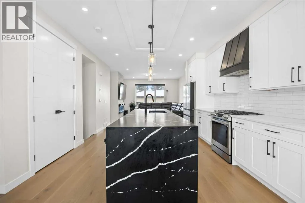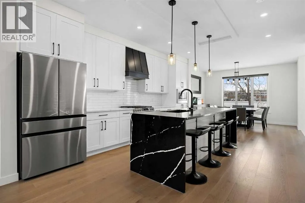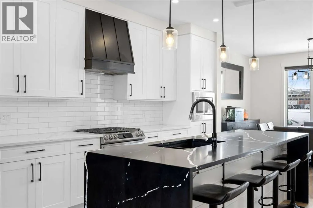 This beautiful 2-storey infill is tucked along a quiet, tree-lined street in the heart of Bowness and offers the perfect blend of style, comfort, and value. With a bright west-facing backyard and easy access to Bowness Park, schools, shops, and major routes, this home delivers everyday convenience in a family-friendly location.Step inside to a thoughtfully designed layout with 9â ceilings on all levels, hardwood flooring, and a kitchen that truly stands out. Sleek black finishes, a striking waterfall-style quartz island, and quartz counters in every bathroom give the home a clean, modern feel. The main floor also features a spacious living room with a fireplace, a dedicated dining area, a convenient mudroom, and a 2-piece bath.Upstairs, youâll find three comfortable bedrooms, including a generous primary suite with a large walk-in closet and a 5-piece ensuite. A full 4-piece bathroom, upper-floor laundry, and a bright bonus loft complete this level.The fully finished basement adds even more functional space with a large rec room, a stylish wet bar with an Arctic King mini fridge, a full bathroom, and a fourth bedroomâideal for guests or extended family.Outside, the west-facing backyard is ready for year-round enjoyment with a deck, patio, BBQ area, and plenty of green spaceâincluding fresh raspberry bushes. A 6-person Cal Spas hot tub sits on a dedicated cement pad with underground electrical tied to the garage and two exterior kill switches. This home also comes loaded with thoughtful extras:⢠MET Blinds throughout, including three motorized blinds with remotes⢠Central vacuum system (Nilfisk Supreme 150 powerhead kit â hospital-grade, allergen-free)⢠Whirlpool Sport white washer & dryer⢠Oversized two-car garage with great storageA beautifully built infill with premium finishes, smart upgrades, and a fantastic locationâoffered at exceptional value. (id:27476)
