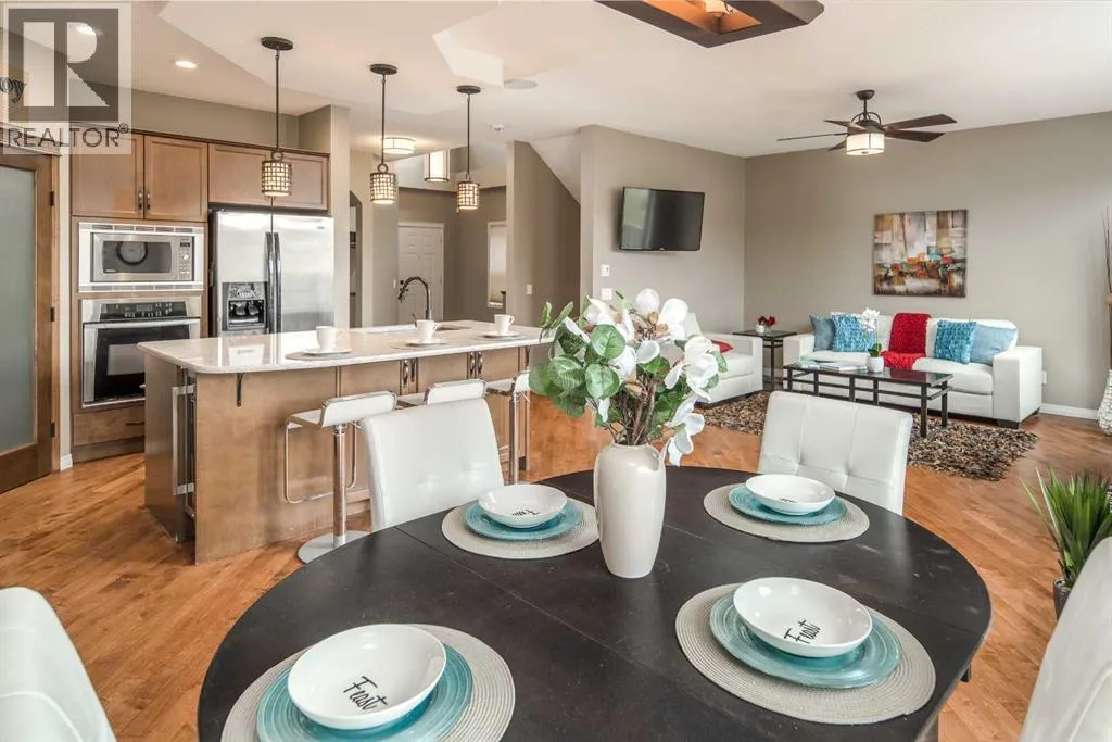 TRIPLE CAR GARAGE | WALKOUT BASEMENT | ASPEN WOODS | TOP-RANKED PUBLIC & PRIVATE SCHOOLS. Welcome to this stunning family home located in the highly sought-after community of Aspen Woods. Offering over 3,350 sq. ft. of developed living space, this exceptional residence features 4 bedrooms, 4 bathrooms, a spacious triple attached garage, and sits on a generous lotâperfect for a growing family. Upon entry, you are greeted by soaring vaulted ceilings that create an immediate sense of space and elegance. The main floor showcases polished maple hardwood flooring and a versatile flex room, ideal for a home office, formal dining area, or playroom. The chef-inspired kitchen is equipped with premium stainless steel appliances, including a Bosch gas cooktop, Bosch dishwasher, built-in oven and microwave, wine cooler, and a massive granite island with seating for five. A cozy breakfast nook and large pantry complete this functional and stylish space. Upstairs, enjoy a spacious vaulted bonus room with a built-in sound system, two generously sized childrenâs bedrooms, and a luxurious primary retreat featuring a jetted tub and separate shower. The walkout basement is flooded with natural light and includes the fourth bedroom, a 3-piece bathroom, a comfortable living area, and a wet barâperfect for an in-law suite, guest quarters, or teenage retreat. Step outside to a beautifully landscaped backyard featuring a covered patio, flower beds, planters, and a freshly painted full-width deck with BBQ gas hookup and stairs leading to the yardâideal for outdoor entertaining. Recent updates include: New quartz countertops in all bathrooms and the wet bar. Fresh paint throughout the main and upper floors. Refinished hardwood floors on the main level. Ideally located within walking distance to Webber Academy, Dr. Robert Bondar School, Guardian Angel School (Kâ6), and Aspen Landing Shopping Centre, and just minutes from Calgary Academy and Ernest Manning High School, this home offers unparall eled access to Calgaryâs top public and private schools, parks, and public transit. A rare opportunity to own a beautifully updated family home in one of Calgaryâs most prestigious communities. (id:27476)