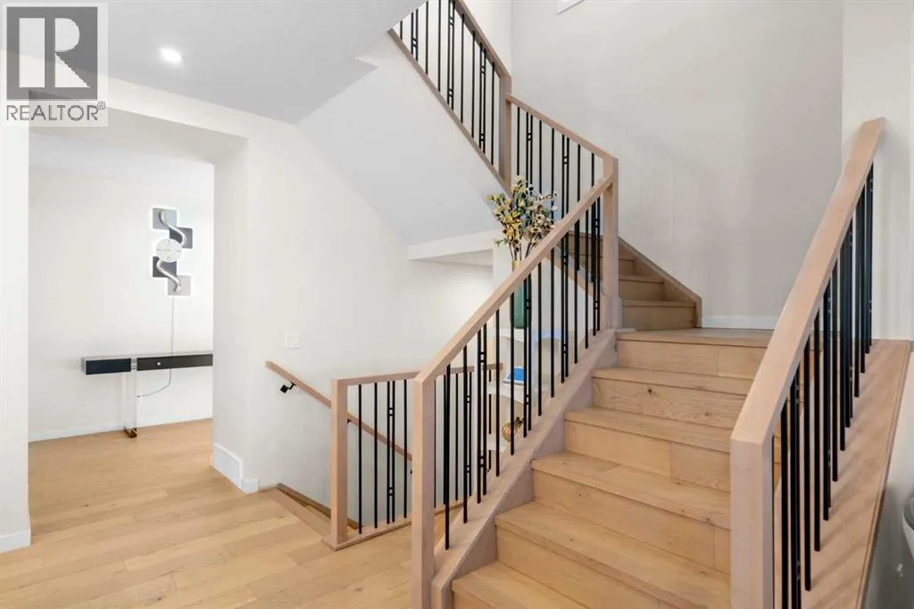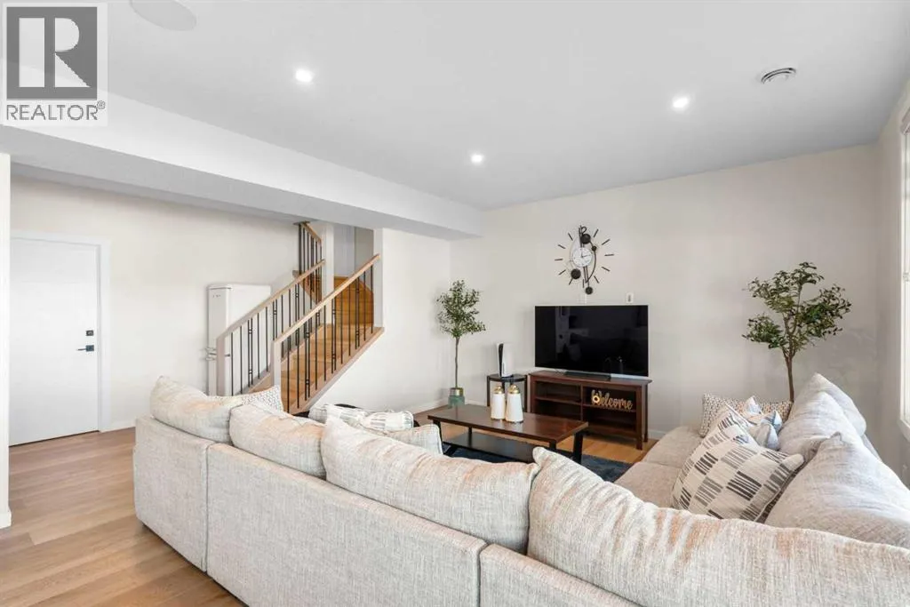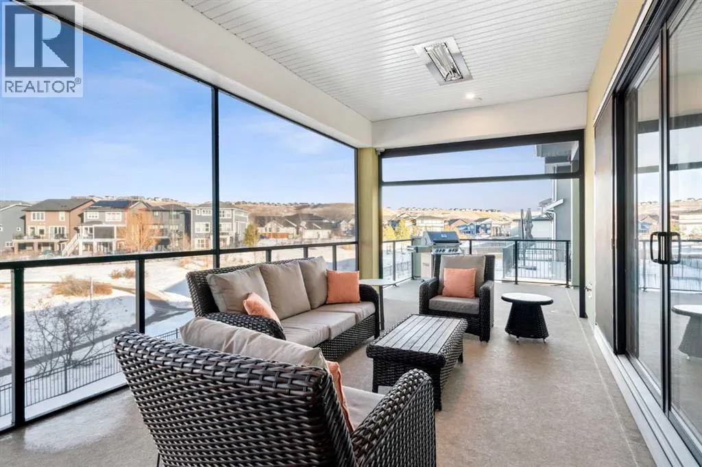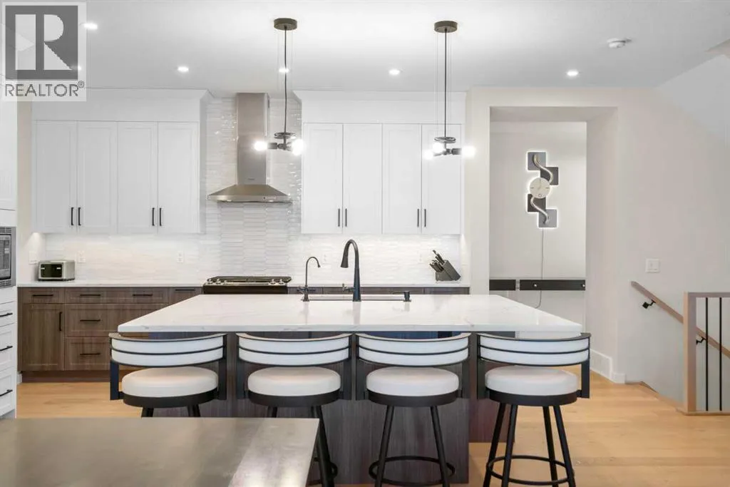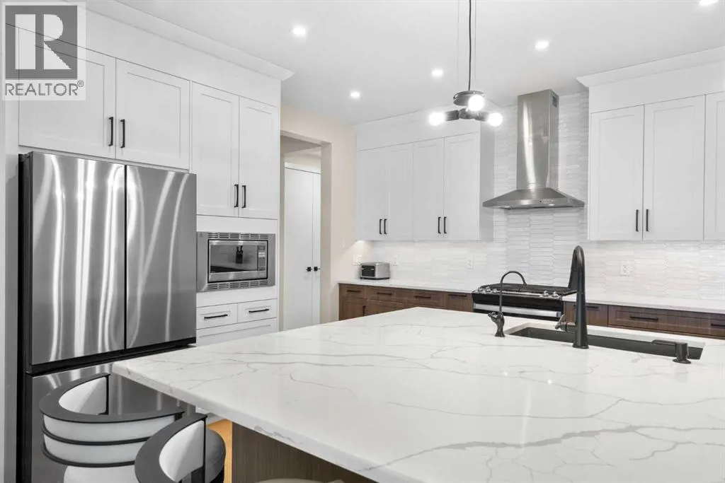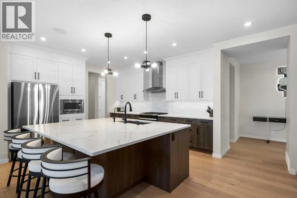 Experience an exceptional standard of living in this architecturally refined 2,973 sq. ft. executive residence. Perfectly positioned on a fully landscaped walkout lot backing directly onto a tranquil pond, the community pathway system, and a natural reserve, this home offers a serene setting with effortless access to the Bow River escarpment. Thoughtfully designed and executed without compromise by Baywest Homes the home delivers a rare blend of luxury, versatility, and income potential.From the moment you arive, the quality is immediately evident. Premium wide-plank engineered hardwood flooring spans both the main and upper levels, complemented by 9-foot ceilings and 8-foot doors throughout. The result is a cohesive, light-filled interior that feels both refined and expansive.The main floor is an entertainerâs showcase, anchored by a professional-grade kitchen and complemented by a private office and elegant powder room. Culinary highlights include a full-size double-door refrigerator and freezer, gas range with hood fan, built-in microwave, bar fridge, and LG dishwasher. A Kinetico K5 reverse-osmosis drinking water system feeds directly into the refrigerator dispenser, ensuring pure, filtered water at all times. Expansive windows flood the space with natural light while framing uninterrupted pond views.Step outside to the signature all-season Dura Deck, designed for year-round enjoyment. Glass railings preserve the view, while a sheltered breeze-in area with remote-controlled screens, two oversized infrared heating panels, and remote blinds creates a seamless indoor-outdoor living experience. Even functional elements have been thoughtfully addressed, with a custom outdoor metal storage enclosure discreetly housing waste bins to maintain the homeâs clean, polished exterior aesthetic.The upper level is perfectly suited for modern family living. The expansive primary suite offers a true retreat, complete with a spa-inspired ensuite and oversized walk-in closet. S econdary bedrooms are equally impressive, including a rare junior suite with private ensuite and an exceptionally large third bedroomâideal as a premium childrenâs retreat or flexible living space. A convenient upper-level LG laundry pair completes the floor.The professionally developed walkout basement functions as a fully self-contained legal suite, offering outstanding flexibility for extended family, executive guests, or a high-performing Airbnb. Featuring a private aggregate stone entrance, two bedrooms, a four-piece bathroom, comfortable sitting area with television, kitchenette (microwave, hot plate, fridge/freezer), stacked washer and dryer, and access to a large private patio, this space delivers privacy, comfort, and exceptional utility.Located just steps from the Bow River pathway system and surrounded by nature, yet only minutes from premier schools, shopping, and major commuter routes, this residence offers executive living without compromise. This is not simply a homeâit is a lifestyle (id:27476)