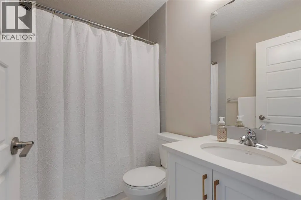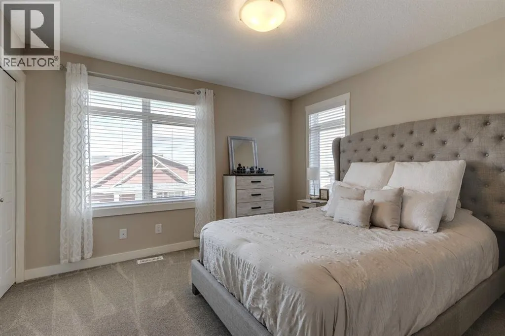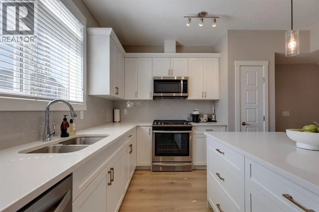With light pouring in from every angle, this impeccably designed 2020 constructed corner-unit townhouse feels fresh, bright and instantly inviting. In collaboration with a professional designer, every finish from the classic white kitchen to the quartz countertops was thoughtfully selected for timeless style and everyday comfort. The open concept main floor offers a spacious living space with room for a desk nook for working from home, a bright dining area for weeknight meals, and plenty of space to relax together. A stylish kitchen with stainless steel appliances including a French door fridge, and a striking tile backsplash beckons you to try out new recipes. Step outside to your private balcony for your morning coffee, evening grilling, or simply enjoying the fresh air, sheltered by a privacy wall. Upstairs, both bedrooms offer double closets and private ensuites, providing comfort and convenience for guests or a roommate. Laundry is neatly tucked into the upper hallway. The attached tandem double garage provides parking plus generous storage space for seasonal gear. With 9â ceilings on the main floor, a neutral colour palette, and meticulous upkeep, this move-in ready home feels airy and welcoming. Located just minutes from the shopping at Cross Iron Mills, as well as grocery stores, restaurants and pubs. Enjoy quick access around the city from Stoney and Deerfoot Trail. There are pathways, parks, and playgrounds nearby to explore. This home blends convenience with lifestyle and is ideal for a first-time buyer, young couple, small family or busy professional. Book your private tour and see why this is the perfect fit. (id:27476)