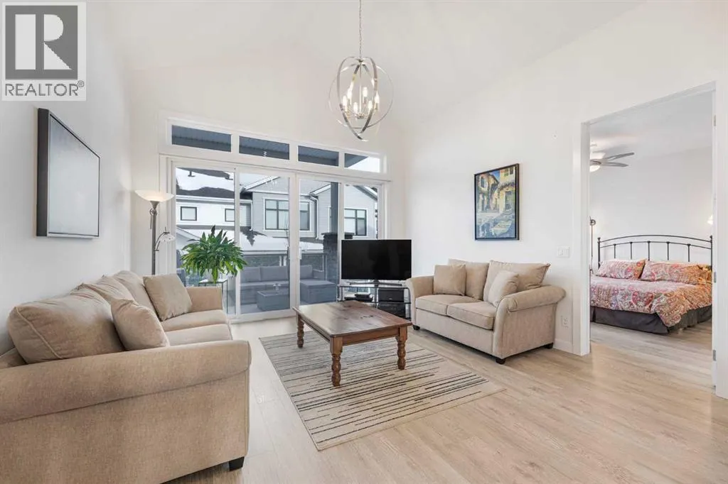 OPEN HOUSE: Sunday, Jan 11th, 11am-1pm! This exceptional villa bungalow combines luxury finishes, thoughtful design, and a bright, open layout that feels both modern and inviting. Meticulously maintained, this home showcases soaring vaulted ceilings and premium upgrades throughout. Discribed by the builder as a âBuilt Greenâ home featuring a on-demand hot water system and heat exchanger, plus triple pane argon filled windows for improved efficiency and lower utility costs.The front entry way leads you into a spacious foyer with room for seating. Just off the entry is a stylish half bath and a custom built-in workstation. The main living area opens up beautifully, anchored by an oversized granite island with bar seating, extra-large Blanco sink, under-cabinet lighting, and upgraded stainless steel appliancesâincluding a built-in gas cooktop and dual ovens, one a Miele steam/convection oven. A large pantry and dining area make this chef's kitchen ideal for modern living. A well-designed laundry area sits at the entrance to the heated garage and includes a built-in bench and coat hooks for added convenience.The warm and inviting living room, with tones of natural light is enhanced by vaulted ceilings and expansive sliding doors that lead to a covered balcony great for entertaining in the summer. A gas line for your BBQ makes life even easier. The large primary bedroom is conveniently located off the living room and offers a two-sided walk-through closet leading to the luxurious ensuite, featuring a marble double vanity, Dietra heated tile floors, private water closet, and an oversized shower with built-in bench seating.The fully finished walkout basement is bright and welcoming. A beautifully appointed wet bar with marble countertops, pantry, and full-size fridge makes this level perfect for guests, entertaining, or multi-generational living. The spacious family room offers plenty of room for relaxation or games, and a separate den with dual pocket doors ad ds flexible living space as a possible home office or gym. A bright lower-level bedroom and a full bathroom with soaker tub make this space ideal for visitors. The lower covered patio provides another private outdoor retreat. Located in desirable Crestmontâ3-minutes to Stoney Trail and the TransCanada Highway for quick access to the mountainsâthis home offers unmatched convenience and lifestyle. (id:27476)