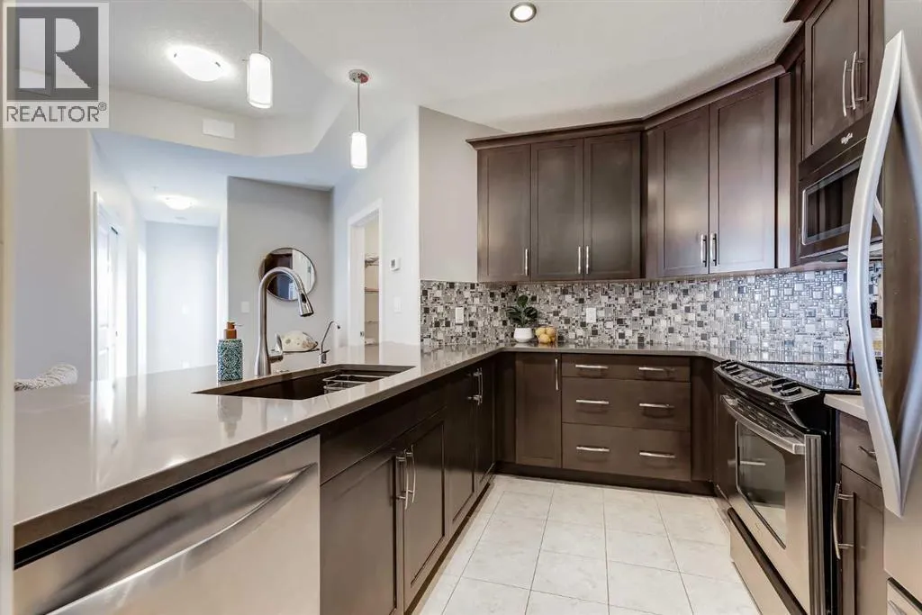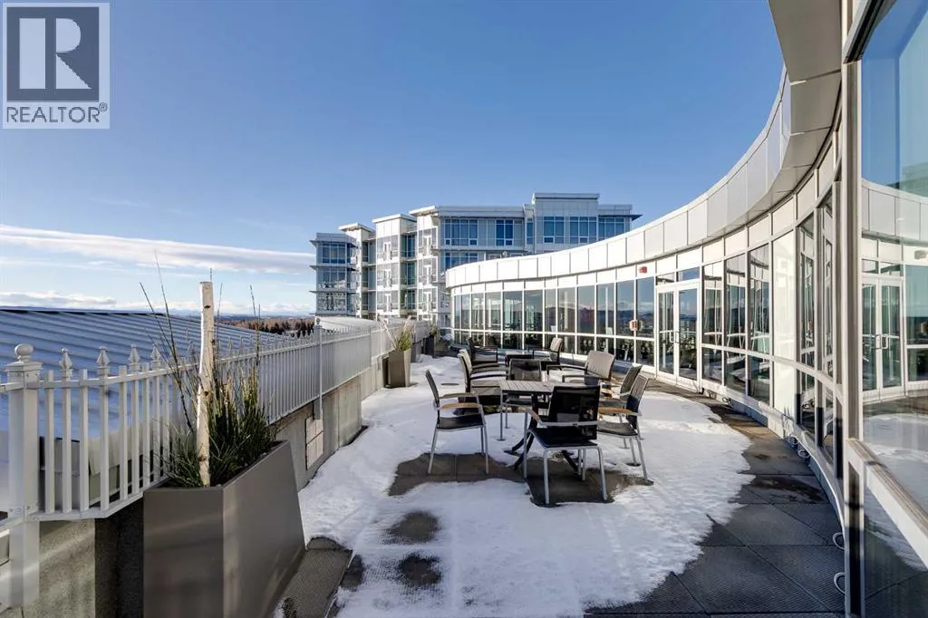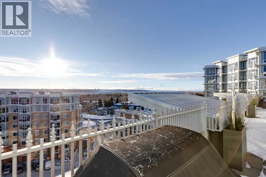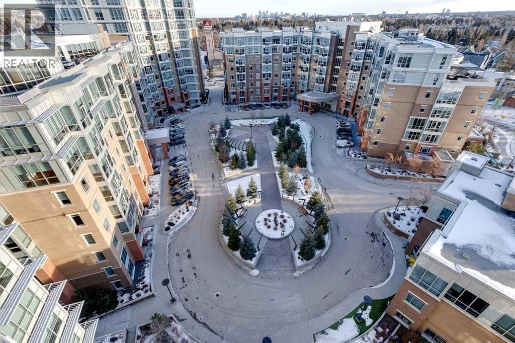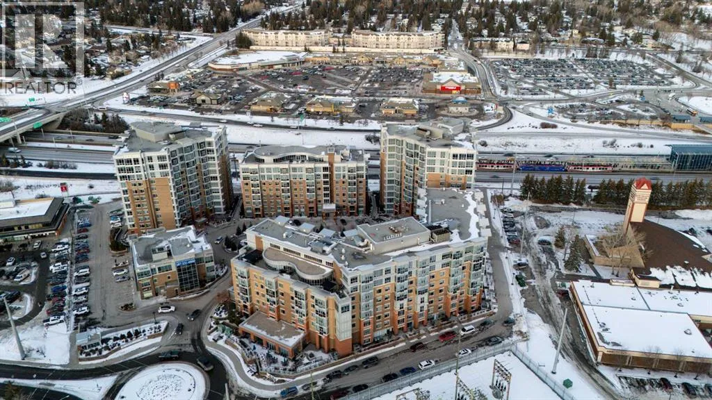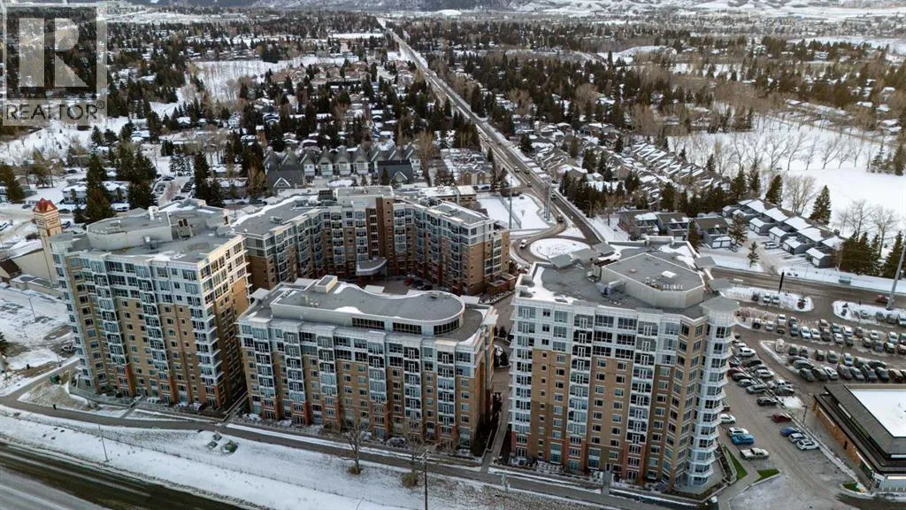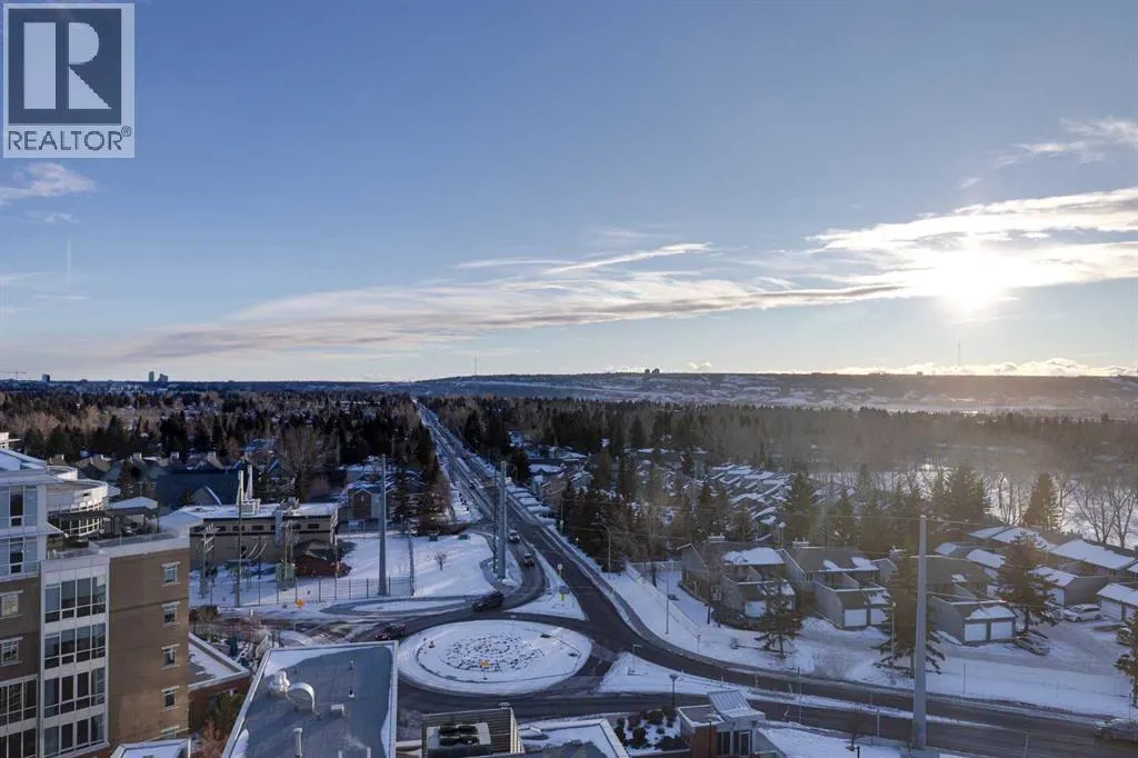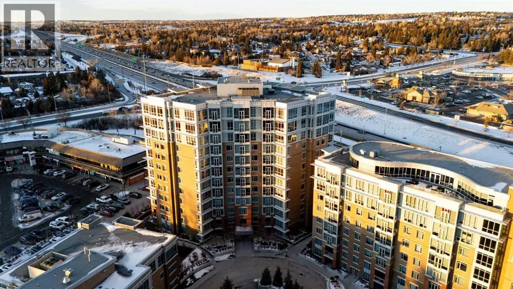 Perched on the 11th floor of the Monterey One building at Groves of Varsity, this thoughtfully designed condominium offers expansive views and a refined living experience in one of Calgaryâs most established luxury complexes. Constructed with concrete and steel, the residence provides a quiet and secure setting. With over 1,000 square feet of developed space, the home features two bedrooms and two bathrooms, balancing comfort with functionality. The interior is defined by 10-foot ceilings and full-height windows that draw in natural light and frame open city and mountain outlooks. Hardwood flooring grounds the living and dining areas, creating a cohesive flow throughout the main living space. The living room is welcoming and well proportioned.. Adjacent to it, the modern kitchen combines style and practicality with tile flooring, rich wood cabinetry, quartz countertops, stainless steel appliances, plenty of cupboard space and a breakfast bar that adds casual seating. The dining area opens to a Juliet balcony and offers views toward downtown, making it a pleasant setting for both daily meals and evening gatherings. The primary bedroom is positioned to take full advantage of the scenery, with outlooks that stretch across the city and toward the mountains. It includes a walk-in closet and cork flooring, leading into a five-piece ensuite designed with a spa-like feel. A soaker tub, standalone shower, dual sinks, and quartz countertops complete the space. The second bedroom is equally versatile, currently functioning as a home office with a Murphy bed and integrated desk, allowing it to adapt easily to changing needs. A three-piece bathroom nearby features an oversized glass-enclosed shower and quartz countertop, offering convenience for guests or additional household members. A dedicated laundry room includes a full-size stacked washer and dryer along with extra storage, while air conditioning ensures comfort during warmer months. The home comes with one titled undergro und heated parking stall and a titled storage locker. Residents of the building have access to a range of shared amenities, including a fitness area, steam rooms, ownersâ lounge, and an outdoor rooftop terrace with BBQs. A professional building nearby adds convenience with services such as medical offices, a pharmacy, and cafés. Short-term rentals are not permitted, and pets are welcome with board approval. The location places you steps from the Dalhousie LRT Station and directly across from the shops, dining, and services of Dalhousie Station. Market Mall, Northland Mall, and Crowfoot Crossing are all minutes away, as are major routes including Crowchild Trail, Stoney Trail, and downtown Calgary. The University of Calgary, SAIT, Silver Springs Golf & Country Club, Bowmont Park and its river pathways, Nose Hill Park, Foothills Hospital, and Alberta Childrenâs Hospital are all within easy reach, making this an ideal setting for both lifestyle and accessibility. Check out the 3D tour and floor plans! (id:27476)