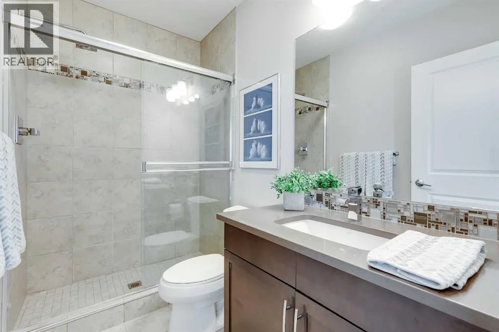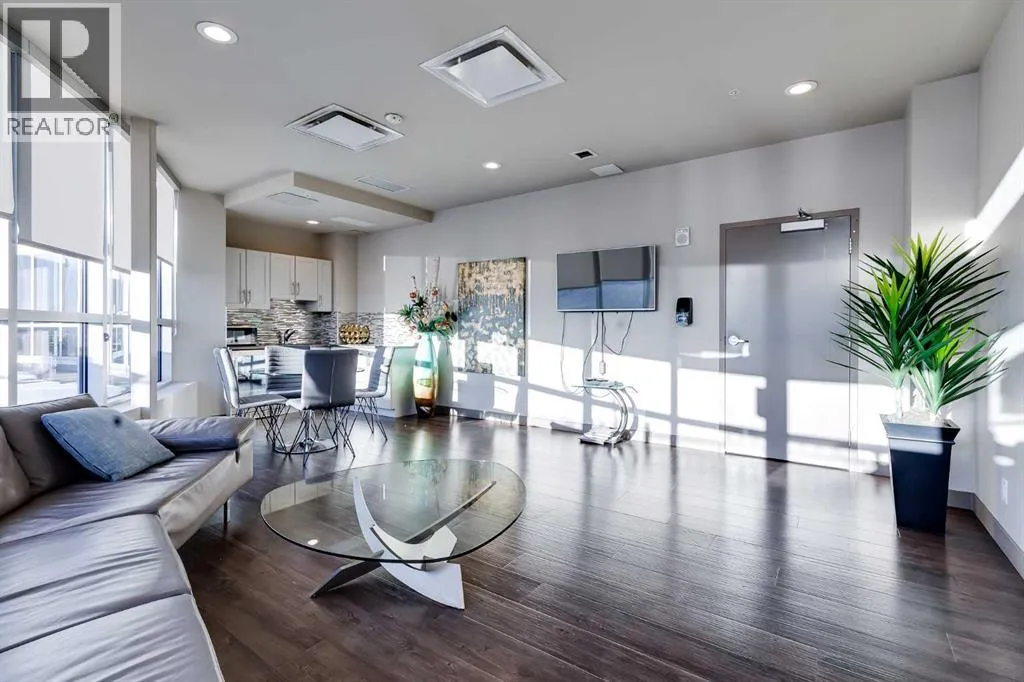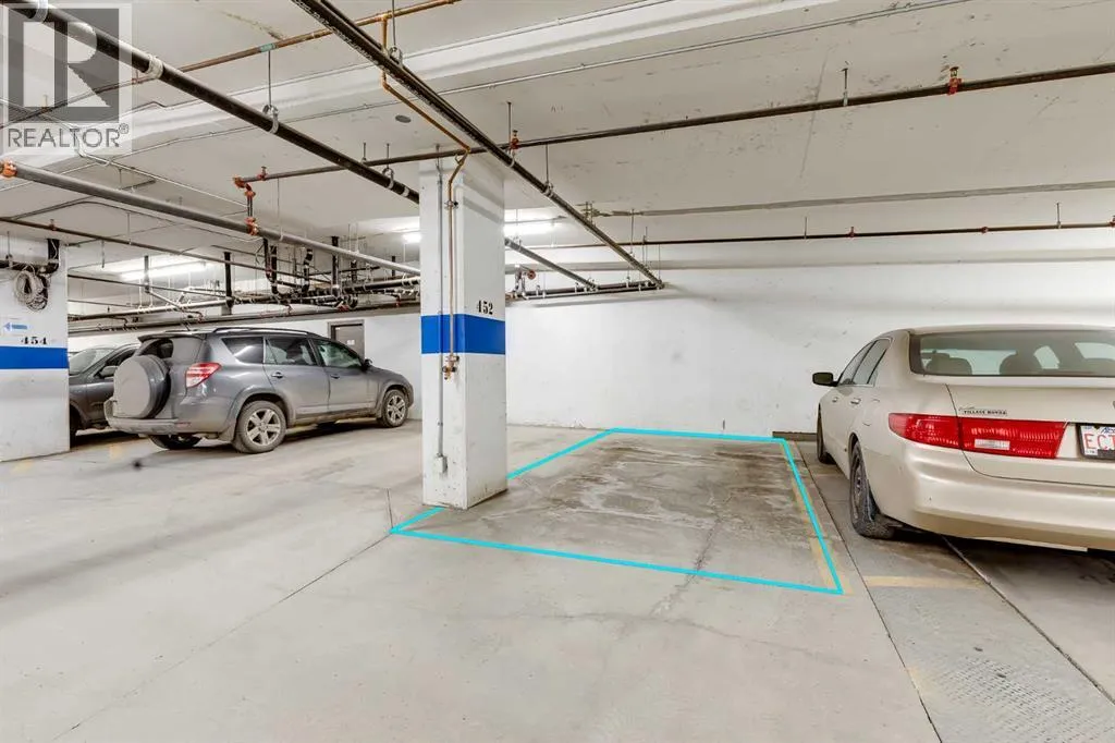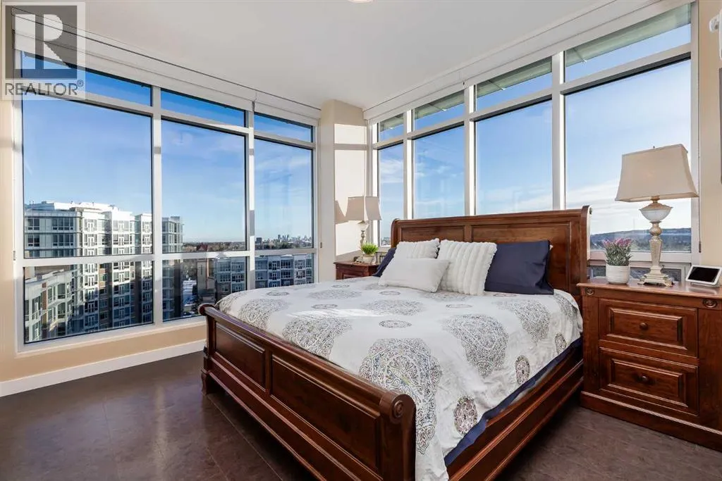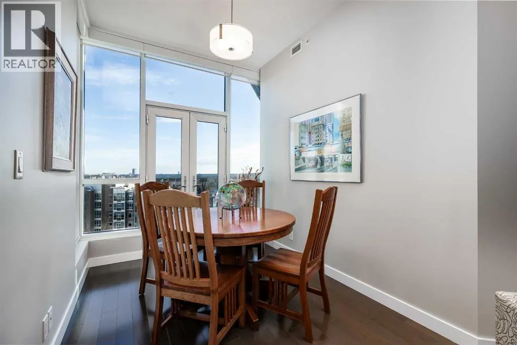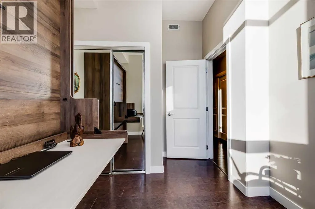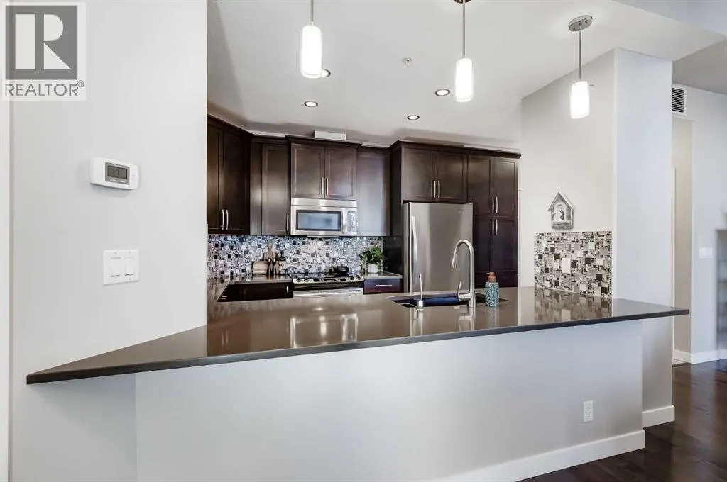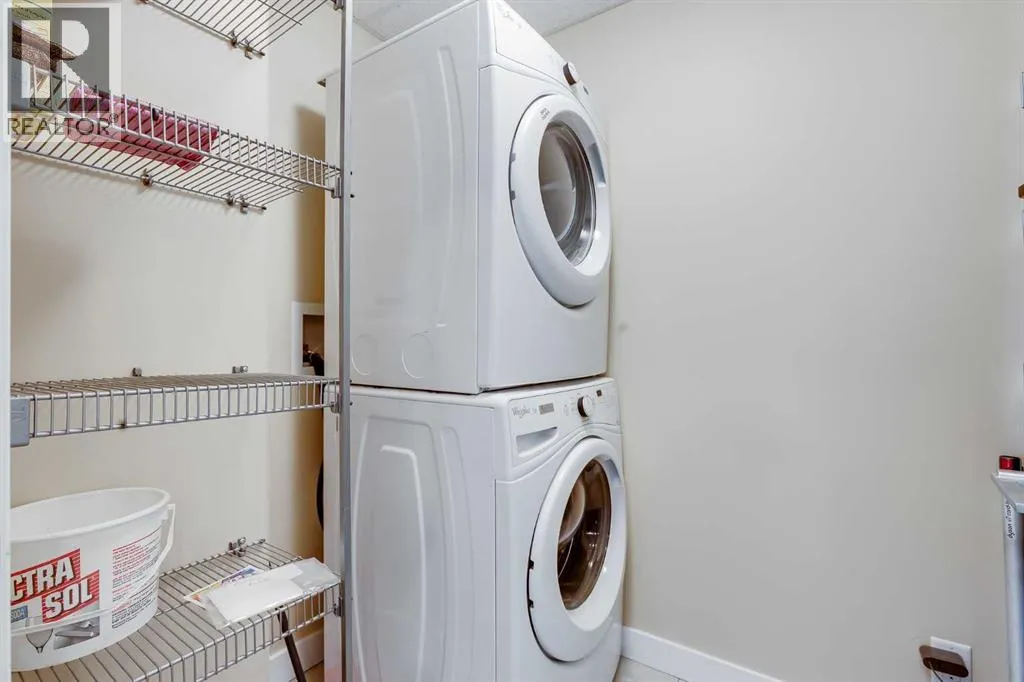 Perched on the 11th floor of the Monterey One building at Groves of Varsity, this thoughtfully designed condominium offers expansive views and a refined living experience in one of Calgaryâs most established luxury complexes. Constructed with concrete and steel, the residence provides a quiet and secure setting. With over 1,000 square feet of developed space, the home features two bedrooms and two bathrooms, balancing comfort with functionality. The interior is defined by 10-foot ceilings and full-height windows that draw in natural light and frame open city and mountain outlooks. Hardwood flooring grounds the living and dining areas, creating a cohesive flow throughout the main living space. The living room is welcoming and well proportioned.. Adjacent to it, the modern kitchen combines style and practicality with tile flooring, rich wood cabinetry, quartz countertops, stainless steel appliances, plenty of cupboard space and a breakfast bar that adds casual seating. The dining area opens to a Juliet balcony and offers views toward downtown, making it a pleasant setting for both daily meals and evening gatherings. The primary bedroom is positioned to take full advantage of the scenery, with outlooks that stretch across the city and toward the mountains. It includes a walk-in closet and cork flooring, leading into a five-piece ensuite designed with a spa-like feel. A soaker tub, standalone shower, dual sinks, and quartz countertops complete the space. The second bedroom is equally versatile, currently functioning as a home office with a Murphy bed and integrated desk, allowing it to adapt easily to changing needs. A three-piece bathroom nearby features an oversized glass-enclosed shower and quartz countertop, offering convenience for guests or additional household members. A dedicated laundry room includes a full-size stacked washer and dryer along with extra storage, while air conditioning ensures comfort during warmer months. The home comes with one titled undergro und heated parking stall and a titled storage locker. Residents of the building have access to a range of shared amenities, including a fitness area, steam rooms, ownersâ lounge, and an outdoor rooftop terrace with BBQs. A professional building nearby adds convenience with services such as medical offices, a pharmacy, and cafés. Short-term rentals are not permitted, and pets are welcome with board approval. The location places you steps from the Dalhousie LRT Station and directly across from the shops, dining, and services of Dalhousie Station. Market Mall, Northland Mall, and Crowfoot Crossing are all minutes away, as are major routes including Crowchild Trail, Stoney Trail, and downtown Calgary. The University of Calgary, SAIT, Silver Springs Golf & Country Club, Bowmont Park and its river pathways, Nose Hill Park, Foothills Hospital, and Alberta Childrenâs Hospital are all within easy reach, making this an ideal setting for both lifestyle and accessibility. Check out the 3D tour and floor plans! (id:27476)