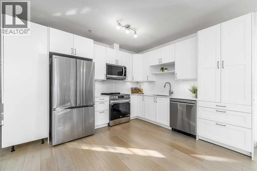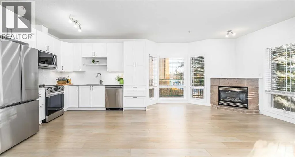 This bright and well-maintained two-bedroom, two-bathroom corner unit is located on the main floor but sits slightly elevated, offering the convenience of easy access while still feeling private and secure. The west-facing balcony adds another layer of separation from ground level and is a great spot to enjoy afternoon sun and evening light.As a corner unit, the home benefits from having only one neighbouring unit on one side, along with beautiful mature trees out front that create a quiet, comfortable setting. Large south- and west-facing windows bring in an abundance of natural light throughout the day, making the space feel open and welcoming and ideal for anyone who enjoys bright living spaces or keeping plants.The layout is spacious and flexible, with high ceilings and an open-concept design that allows for a variety of living, dining, and work-from-home configurations. The kitchen has been fully updated since 2024 and features new cabinetry, quartz countertops, stainless steel appliances, and modern finishes that flow naturally into the main living area.Luxury vinyl plank flooring runs throughout the home, complemented by updated baseboards, trim, door hardware, window coverings, refreshed bathroom vanities and the convenience of in-suite laundry.Comfort is enhanced with in-floor heating, providing consistent warmth during the winter months, along with a fireplace that adds to the cozy feel of the living space.This unit includes two well-sized bedrooms and two full bathrooms, making it a great option for downsizers, an older couple seeking main-floor living, or investors. Its proximity to St. Maryâs University and everyday amenities supports strong rental appeal.Located in the established lake community of Midnapore, residents enjoy access to lake amenities, including swimming, skating, tennis, and year-round use of the clubhouse. Fish Creek Park is nearby, offering easy access to walking and cycling paths, while shopping, transit, and major roadwa ys are all close at hand. The complex is well managed and offers 24-hour security.A bright, comfortable home in a quiet setting with strong lifestyle and investment appeal. (id:27476)
