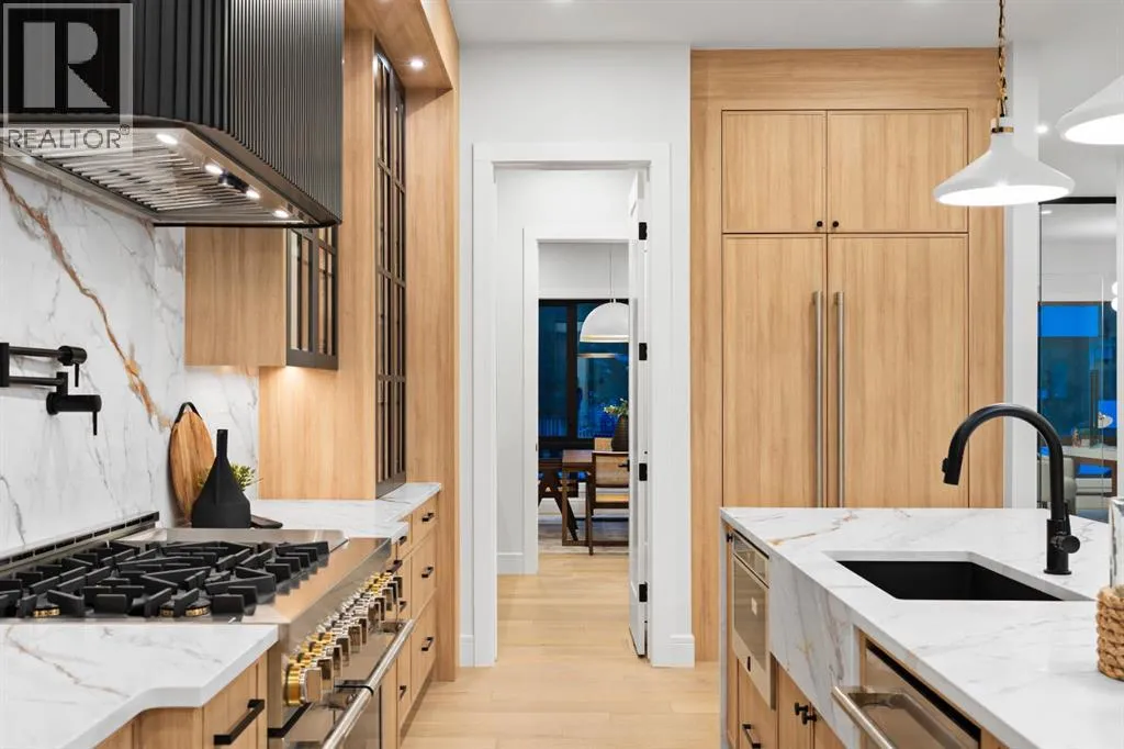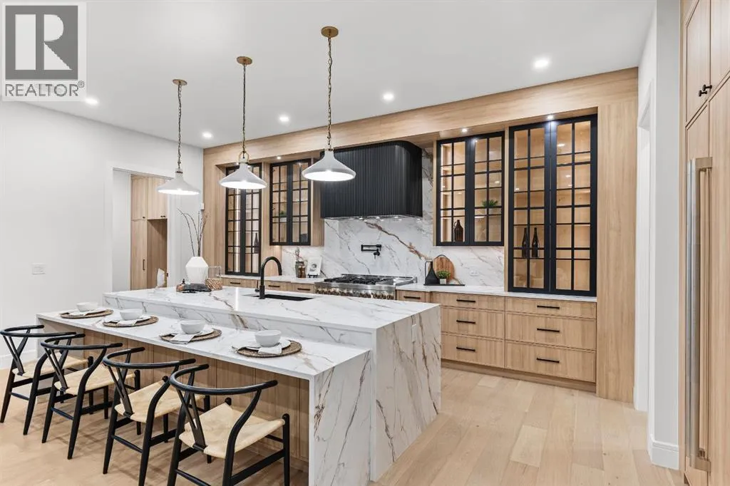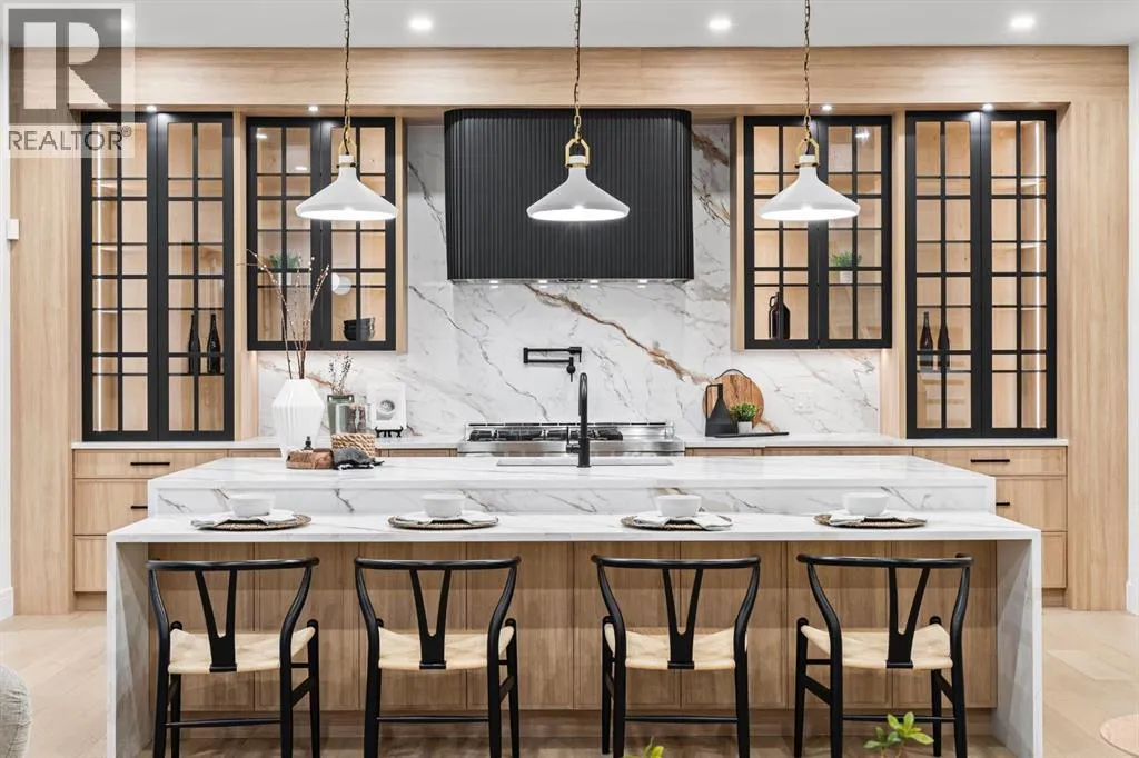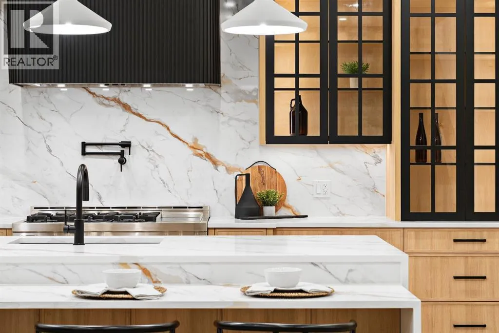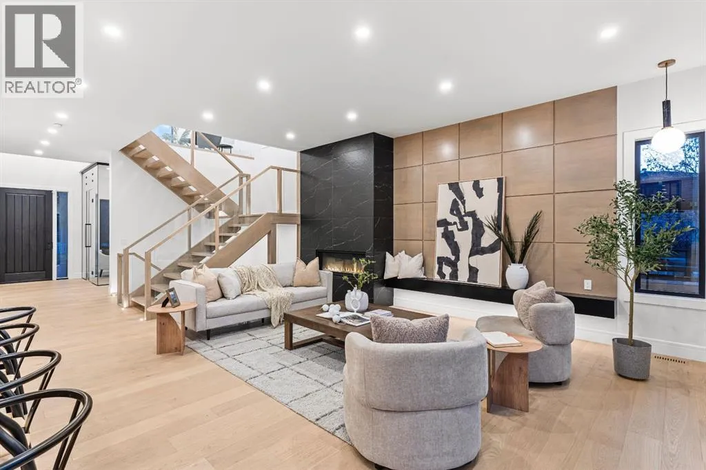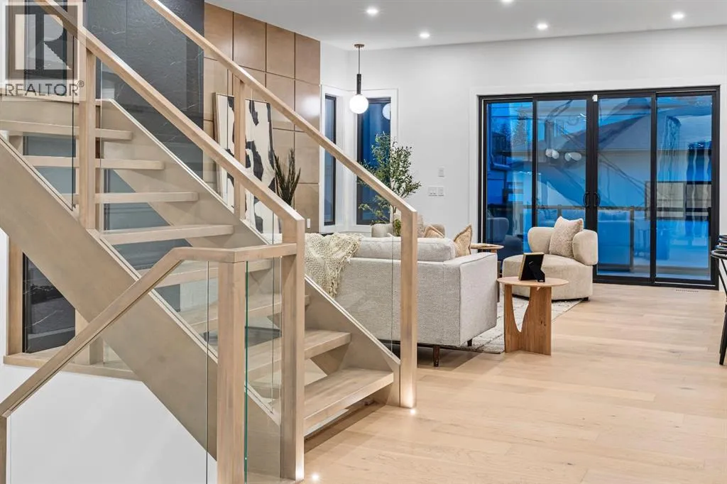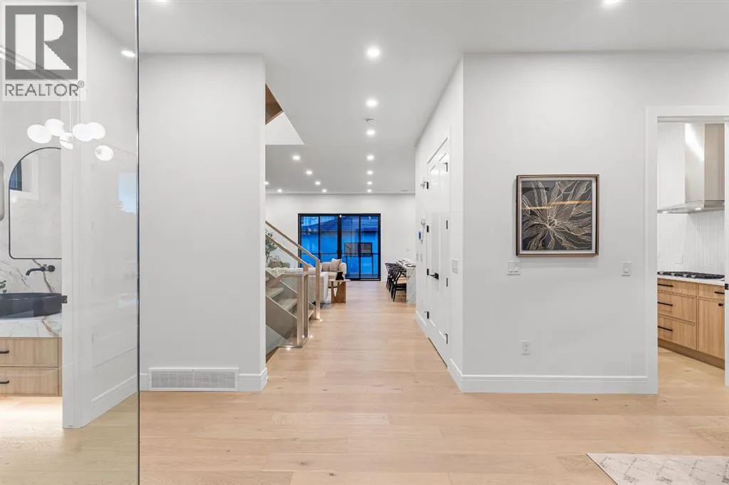 Designed with intention and built with precision, this custom two-storey home in Winston Heights showcases over 3,900 square feet of luxury living where craftsmanship meets modern design. As you enter, the main floor immediately impresses with soaring 10-foot ceilings, open-to-below ceilings, a gorgeous chandelier, wide-plank hardwood, and an abundance of natural light that fills every corner. The front foyer opens into a thoughtfully designed office enclosed by glass walls, with large windows creating a bright and quiet workspace. Just beyond, the formal dining area provides an elegant setting for gatherings, seamlessly connected to a butler's kitchen and full pantry for added storage and prep space. The chefâs kitchen is the centrepiece of the home, featuring Jenn-Air built-in appliances, a 48â 6-burner Jenn-Air stove, an oversized multi-tier quartz island, quartz backsplash, undermount and inside cabinet lighting, and a striking custom range hood. It opens to a spacious living room anchored by a sleek gas fireplace, custom panelled feature wall with wood grid detailing and oversized windows overlooking the deck and backyard. A stylish powder room with custom San Marcopolo Luxury Oro waterproof paint and a large mudroom with built-ins complete the main level. Heading upstairs from the beautiful maple hardwood open riser stairs, a central family room provides a relaxed lounge area with large windows and built-ins separating the bedrooms for added privacy. The primary suite is a retreat of its own, complete with an oversized walk-in closet featuring custom millwork and access to the laundry room. The ensuite is finished to perfection with a freestanding tub, double vanities, a makeup vanity, a steam shower with body jets, and heated floors. Two additional bedrooms offer generous space, each with built-in closets, and share a full bathroom. The fully developed basement extends the living space with a large open recreation room ideal for entertaining, a custom wet bar , a private gym, a full bathroom, and an additional bedroom perfect for guests. Finishes are carried throughout with the same high-quality craftsmanship, lighting, and millwork found upstairs. Outside, the home sits on a landscaped lot with a spacious rear deck and an oversized three-car detached garage offering ample parking and storage. Additional upgrades include rough-ins for built-in interior and exterior speakers, A/C rough-in, and a security system including exterior cameras. The location is exceptional, steps from Winston Golf Club, surrounded by schools, parks, and playgrounds, and just minutes from downtown, and Deerfoot Trail. This home blends refined design, comfort, and convenience in one of Calgaryâs most sought-after inner-city communities. Call today to book your private tour. (id:27476)