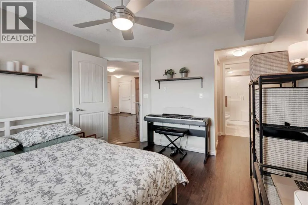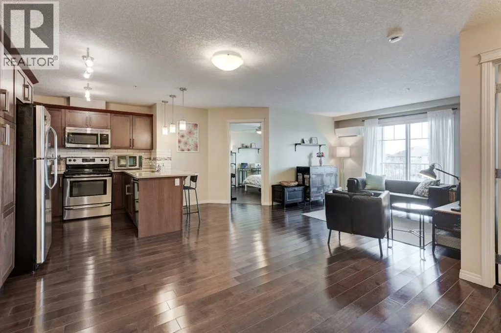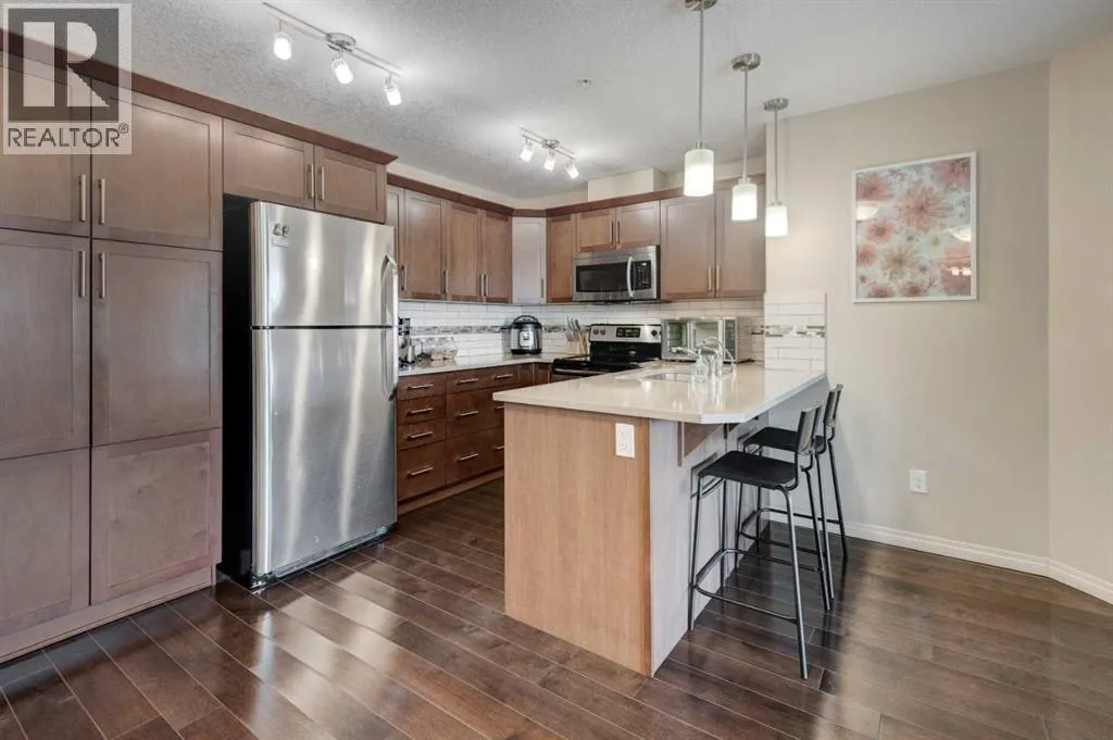 Welcome to the popular community of Cranston Placeâan ideal opportunity for first-time buyers and a smart option for investors. This immaculate, well-designed two-bedroom, two-bathroom condo features central air conditioning, titled underground parking, excellent storage, and a functional layout that appeals to todayâs lifestyle.The stylish kitchen offers extended-height shaker cabinetry with pot drawers, a floor-to-ceiling pantry, breakfast bar, quartz countertops, and a modern subway-tile backsplash with glass accents, all complemented by stainless-steel appliances. The open dining and living areas provide plenty of space to relax or entertain and include a convenient nook that works perfectly as a home office. Wide-plank hardwood flooring enhances the main living area, while sliding patio doors lead to a generous balconyâideal for summer evenings.Both bedrooms are well sized and thoughtfully positioned on opposite sides of the living room for added privacy. Each features durable luxury vinyl plank flooringâperfect for low-maintenance living. The primary bedroom includes a walk-in closet and private ensuite, while the second bedroom is located next to a full bathroom.Additional highlights include a spacious laundry room, coat closet, and a secure storage cage in the parkade. Conveniently located close to shopping, restaurants, Century Hall, Seton Cineplex and YMCA, the South Health Campus, and scenic pathways to the Bow River. A fantastic condo offering comfort, convenience, and long-term value. (id:27476)