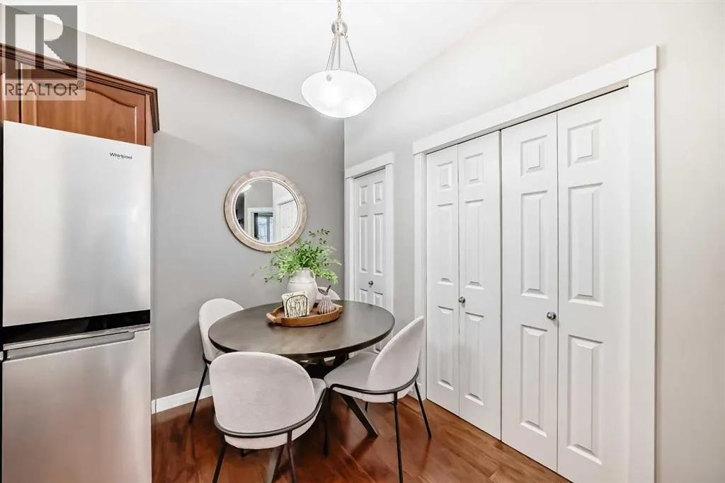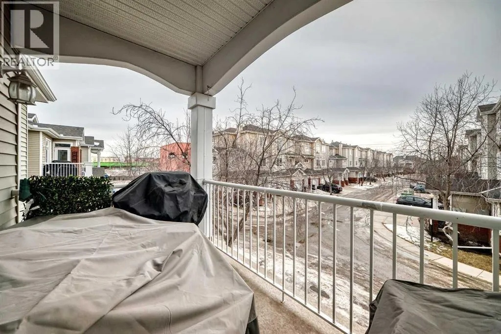Welcome to low-maintenance, lock-and-leave living in the heart of West Springs. This bright upper-level bungalow-style townhome offers over 1,100 sq. ft. of well-designed living space, new hot water tank, 9-foot ceilings, and a rare oversized 27-foot attached garageâa standout feature rarely found in this price range.The open-concept layout is both functional and inviting, featuring engineered hardwood flooring, a spacious living area with gas fireplace, and a well-appointed kitchen with maple cabinetry, new fridge, peninsula island, ample counter space, and a generous pantryâideal for everyday living and entertaining. Large windows and elevated positioning provide excellent natural light and privacy throughout.The primary bedroom includes a walk-in closet and private ensuite, while the second bedroom and full bathroom offer flexibility for guests, a home office, suitable for a new couple just starting out, or downsizing buyers who still want space. Step outside to your private covered balcony, perfect for morning coffee or evening relaxation. The monthly condo fee includes insurance, professional management, reserve fund contributions, snow removal, water, and common-area maintenance, providing predictable ownership costs and peace of mindâespecially appealing for professionals, downsizers, or buyers seeking convenience without sacrificing location.Ideally situated steps from shopping, dining, transit, parks, and top-rated schools, and just minutes to do wntown, this home delivers comfort, practicality, and long-term value in one of Calgaryâs most sought-after southwest communities.An excellent opportunity for buyers who want quick possession, space, an oversized garage, and hassle-free living in West Springsâwithout compromise. (id:27476)