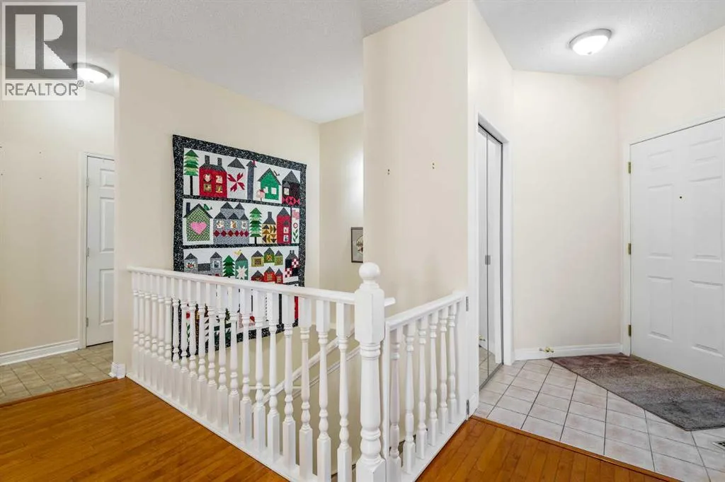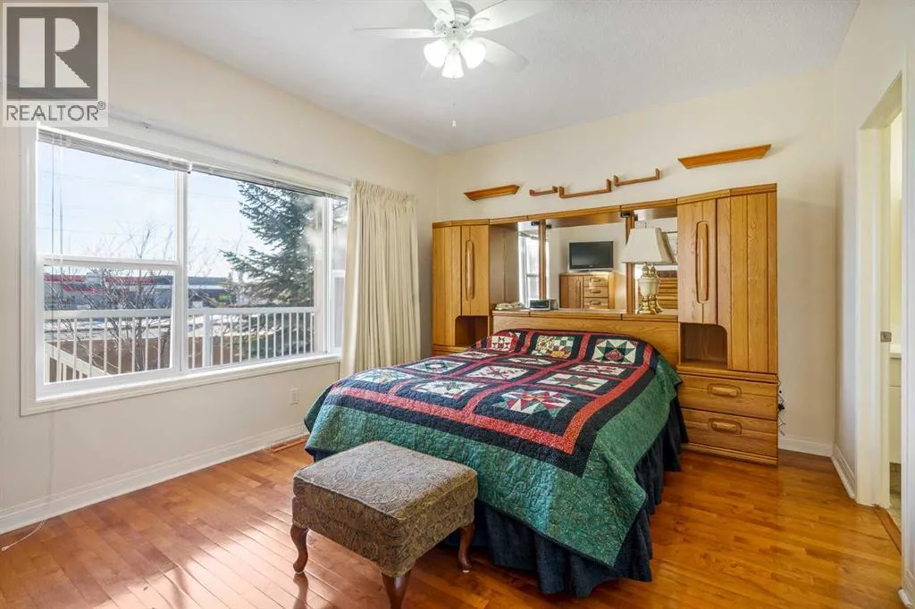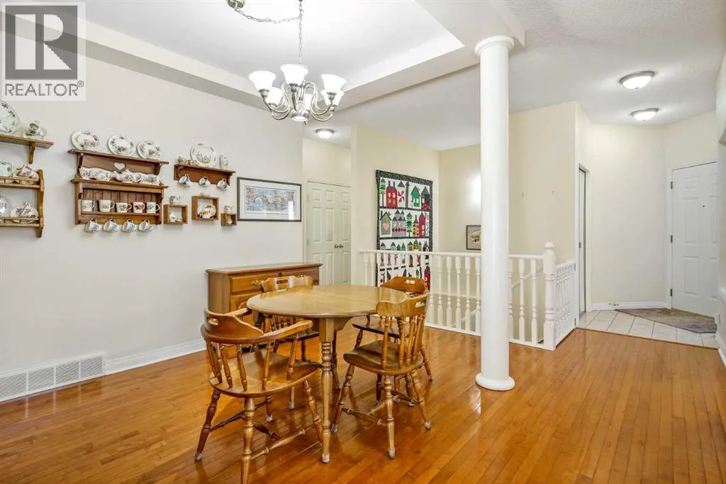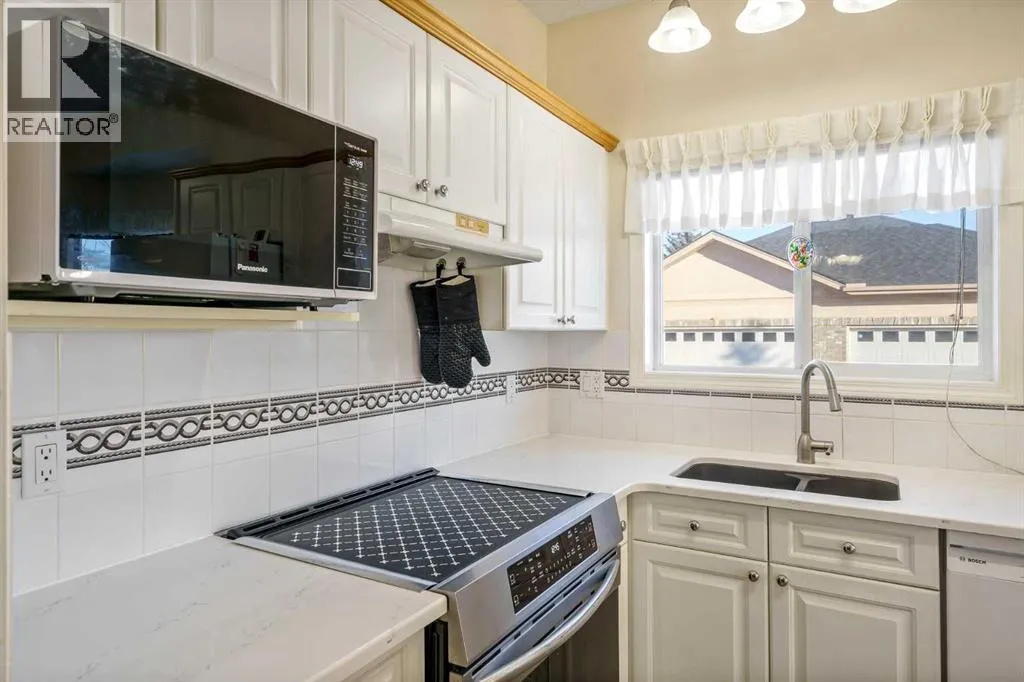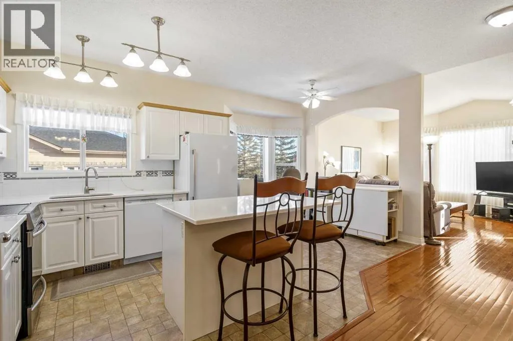 Welcome to the sought-after neighbourhood of Panorama Hills in NW Calgary. This townhome/bungalow in the adult (+18) community of Emerald Park is an ideal fit both location and convenience-wise for those with busy lifestyles. With 2,500sq. ft. of living space, a fully developed lower level, 4 bedrooms, 3 bathrooms, a front-facing insulated attached double garage, and numerous upgrades, this is the ideal home. The main level is an open floor plan and boasts warm, solid hardwood floors throughout with linoleum in the kitchen. Adjacent and to the left of the foyer is a bedroom which could be utilized as a home office. The dining room is sizeable and highlights a tray ceiling. Down the hall is the cozy, well-windowed (bow window) living room with a charming, tiled gas fireplace. The kitchen is a study in efficiency. Sleek, white cabinets and pantry, matching tiled backsplash, white quartz countertops, Blanco double sink newer white appliances, an island/breakfast bar and an induction range with convection oven. The breakfast nook also features a bow window flooding the main level with tons of natural light. The roomy primary bedroom has a good-sized closet and a handy 4-pc. ensuite with quartz countertop. The main level is completed with a 3-pc. bath and a laundry room cleverly hidden behind fitted doors. Moving to the fully finished, carpeted and well-designed lower level, enter a large and comfy rec room and two additional large bedrooms, both with substantial closet space. A 4-pc. bath, utility room and storage space finish the lower level. Admittance to the rear, railed, and very private (no neighbours in the back) deck is via the living room. The deck is ready for barbeque season with the benefit of a gas line. Access to everything is an understatement regarding location. At the junction of Panorama Hills and Country Hills Boulevard and the numerous shopping centers and restaurants, close to Stoney Trail, various schools, day homes and churches, Nose Creek Park, Co untry Hills Golf Club, Cross Iron Mills and Calgary International Airport. Take note of how well this home has been cared for and the many upgrades and improvements, i.e. the kitchen, new garage door, water softener and heater, new furnace and the valuable additions of central air conditioning and central vac. Also consider the convenience of common area maintenance by a professional property manager. Do call for your private tour to avoid missing out on this great opportunity. (id:27476)