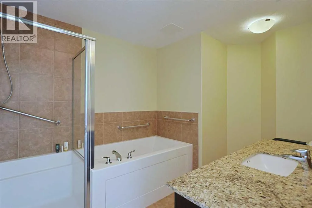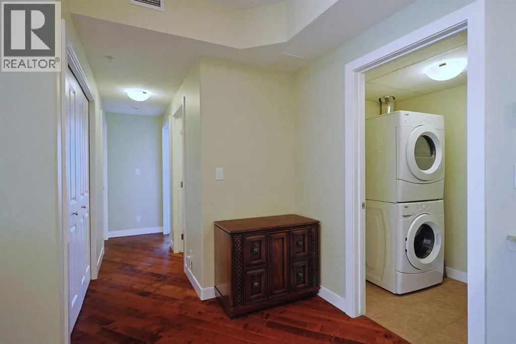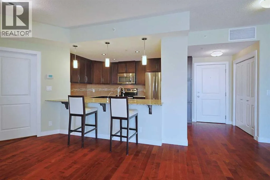 Available for quick possession is this fantastic 2 bedroom condo in Statesmanâs THE GROVES OF VARSITY, located on the 6th floor of the MONTEREY ONE tower of this exclusive concrete & steel project in Varsity. Bathed in warm & sunny natural light, this wonderful home enjoys engineered hardwood floors & high ceilings throughout, 2 full bathrooms, titled underground parking stall & dynamite residents' amenities including fitness centre & rooftop terrace. With its sunny South-facing exposure, youâll just love the open concept design with its great-sized living & dining rooms, sunroom/office with an expanse of windows & maple kitchen with granite counters & Whirlpool stainless steel appliances. The 2 bedrooms are tucked away from the rest of the condo giving you that added privacy; the primary bedroom has a walk-in closet & soaker tub ensuite with separate shower. Convenient insuite laundry/storage room with Whirlpool stacking washer & dryer. Additional features include unit-controlled heating & central air, roller blinds & assigned separate storage locker in the parkade. Monthly condo fees cover your heat & water-sewer, as well as giving you access to the world-class amenitiesâ¦fitness centre & steam rooms, meeting room & wraparound rooftop terrace with views of the mountains, Canada Olympic Park & Nose Hill Park. There is an onsite medical centre with pharmacy & walk-in clinic. The best in maintenance-free living here in this premier location in one of Northwest Calgaryâs most desirable communities, walking distance to Dalhousie Station shopping & LRT, only a few short minutes to the University of Calgary & University District, hospitals (Foothills Medical Centre, Alberta Children's & Arthur J.E. Child Cancer Centre), Bowmont Park, major retail centers, highly-rated schools & downtown. (id:27476)