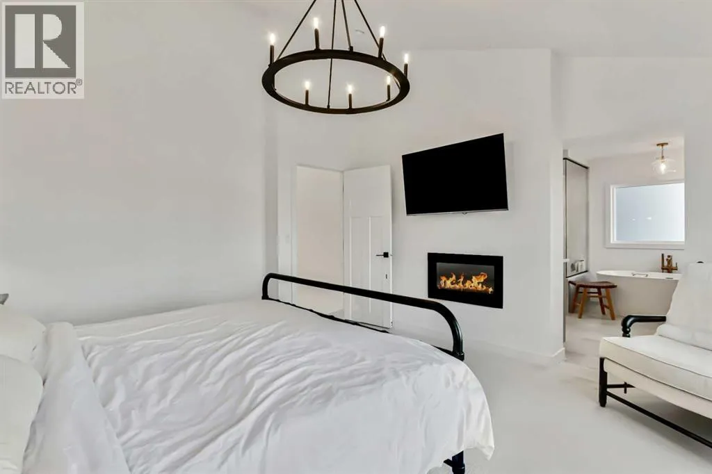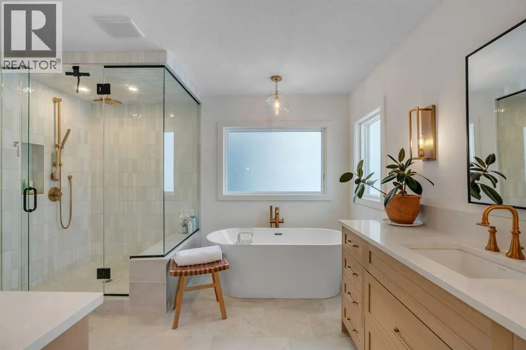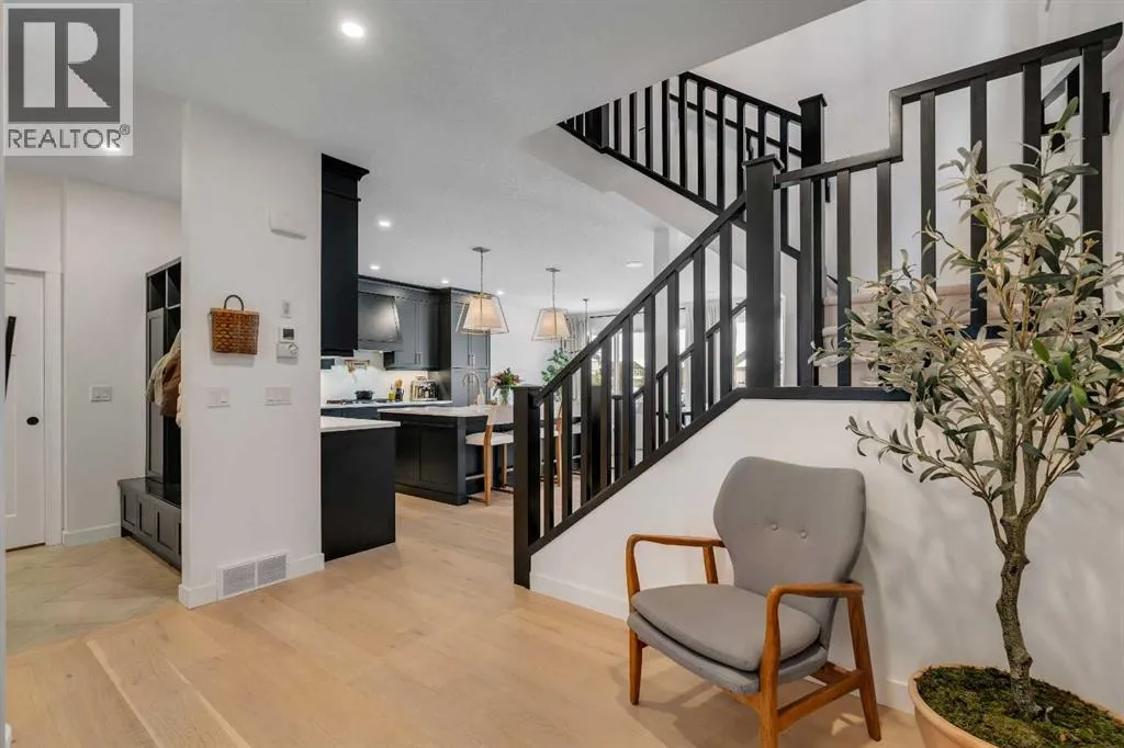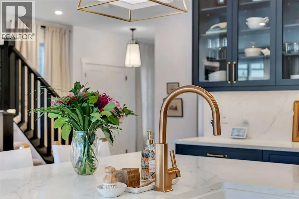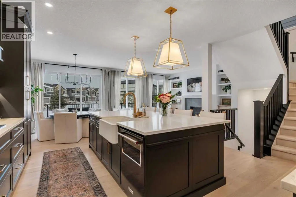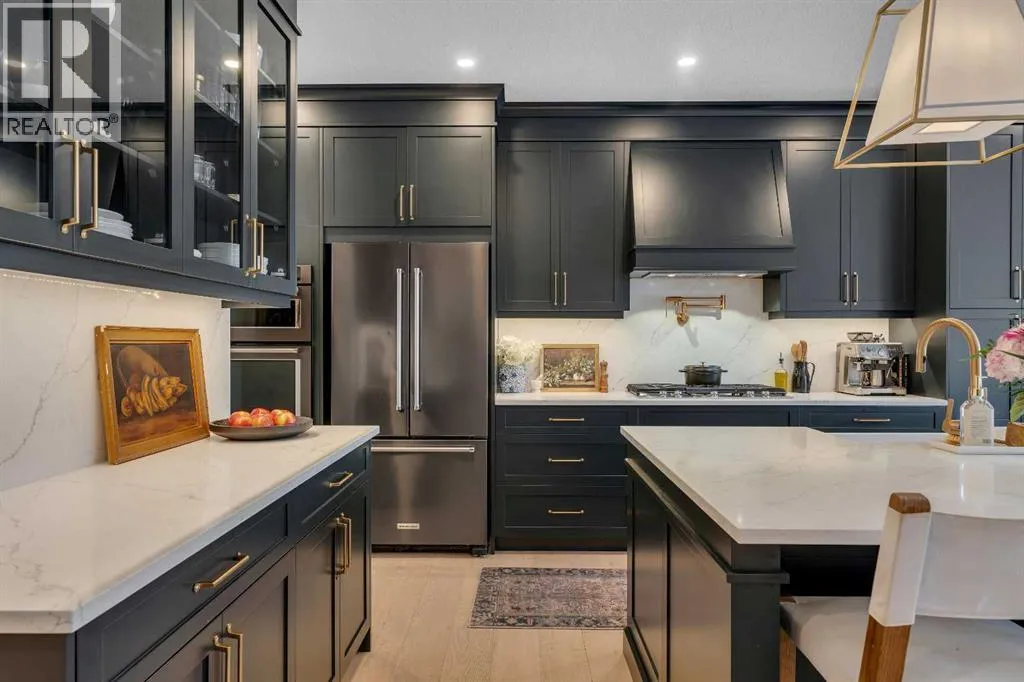 Welcome to this stunning, fully upgraded 4 bedroom, 3.5 bath home in the highly sought after community of Cranstonâs Riverstone. Perfectly positioned backing onto green space and just steps from the river, walking paths and the pond, this 2,402 sq.ft home blends luxury finishes with thoughtful design. The main floor offers an elongated entryway leading to an open concept living area flooded with natural light, a beautiful gas fireplace surrounded by custom built ins, a gourmet kitchen with quartz counters and backsplash, upgraded KitchenAid black stainless steel appliances, gas range with pot filler, custom hood fan, farmhouse sink, dining room, large walk in pantry and designer lighting. A custom mudroom with built in lockers adds everyday convenience. Upstairs features three bedrooms and two full baths, including a secondary bath with double vanities - perfect for sharing. The primary bedroom impresses with vaulted ceilings, a spa like ensuite, complete with a freestanding tub, rain shower with marble and zellige style tile, separate vanities and a large walk in closet connected to a convenient laundry room. A spacious vaulted bonus room completes the upper level. Downstairs, the fully finished basement includes a fourth bedroom, office space, full bath, wet bar with quartz counters/sconces and a cozy living area with an electric fireplace - ideal for entertaining. With over 100k in premium upgrades, including heated floors, custom cabinetry, built in speakers, smart lighting and rough ins for A/C and central vac, this home offers modern comfort and timeless style in a beautiful natural setting. (id:27476)