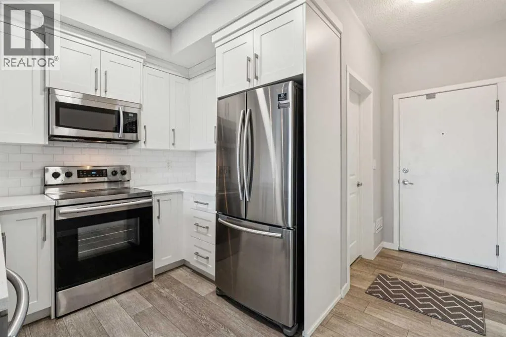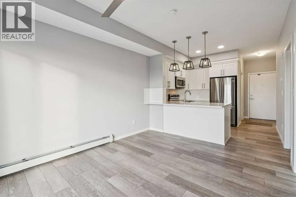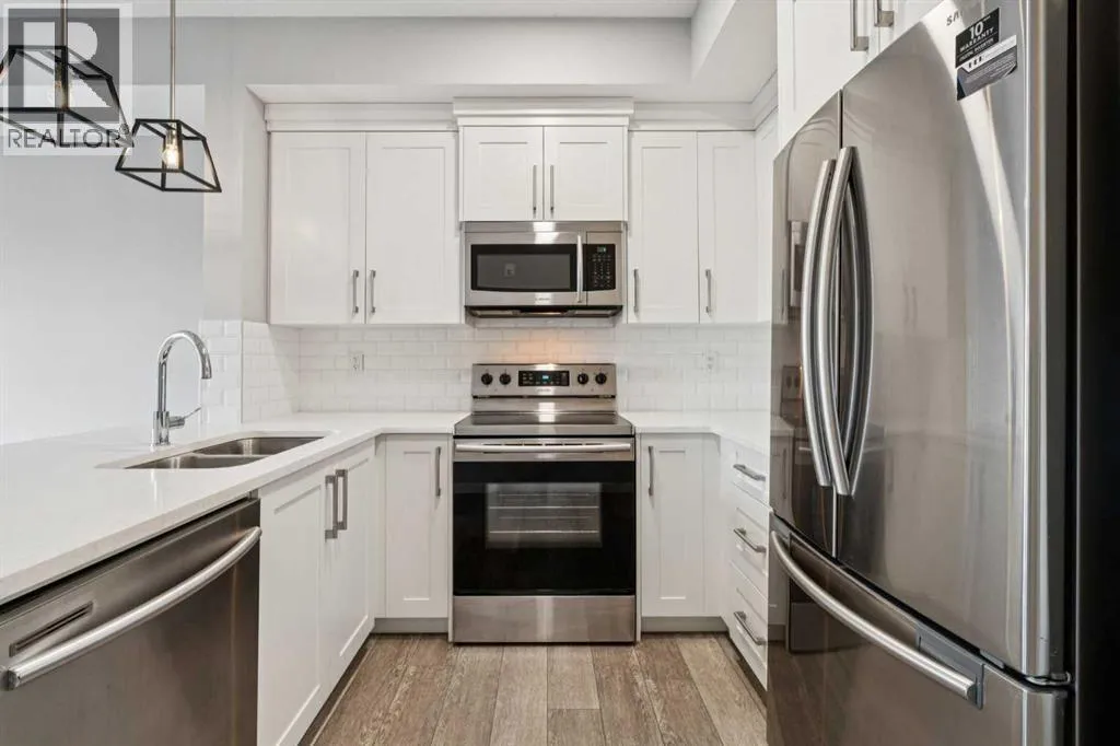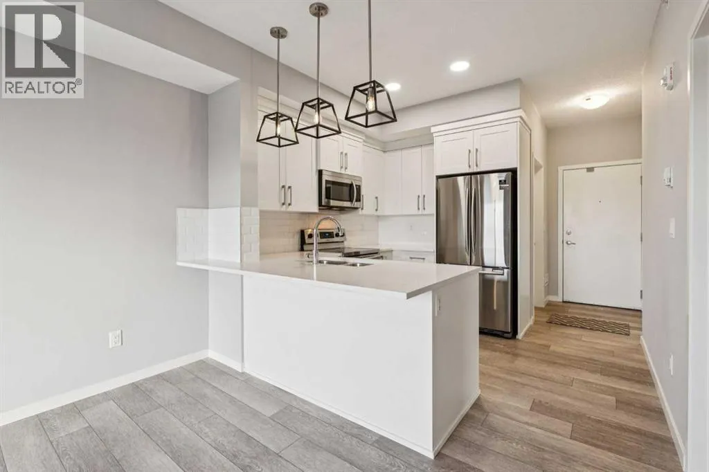 Welcome to The Riseâthis bright, top-floor 2-bedroom, 1-bathroom condo offers move-in ready living. Freshly painted with new carpet, the open-concept layout is filled with natural light and complemented by vinyl plank flooring. The sleek kitchen is a standout, featuring quartz countertops, stainless steel appliances, full-height cabinetry, and a classic subway tile backsplashâperfect for everyday living and entertaining. The sunny living area opens to a west-facing balcony with a gas line for summer BBQs overlooking the courtyard. The spacious primary bedroom features a bright west-facing window and a closet, while the second bedroom is ideal for guests, a home office, or a nursery. A 4-piece bathroom and a convenient laundry/storage room complete this fantastic unit. Additional features include a TITLED outdoor parking stall, visitor parking, and plenty of street parking. Enjoy a pet-friendly community with ample outdoor activities including parks and walking paths, plus unbeatable access to Deerfoot and Stoney Trail, the airport, shopping, restaurants, schools, and entertainment. All you need is the key! (id:27476)