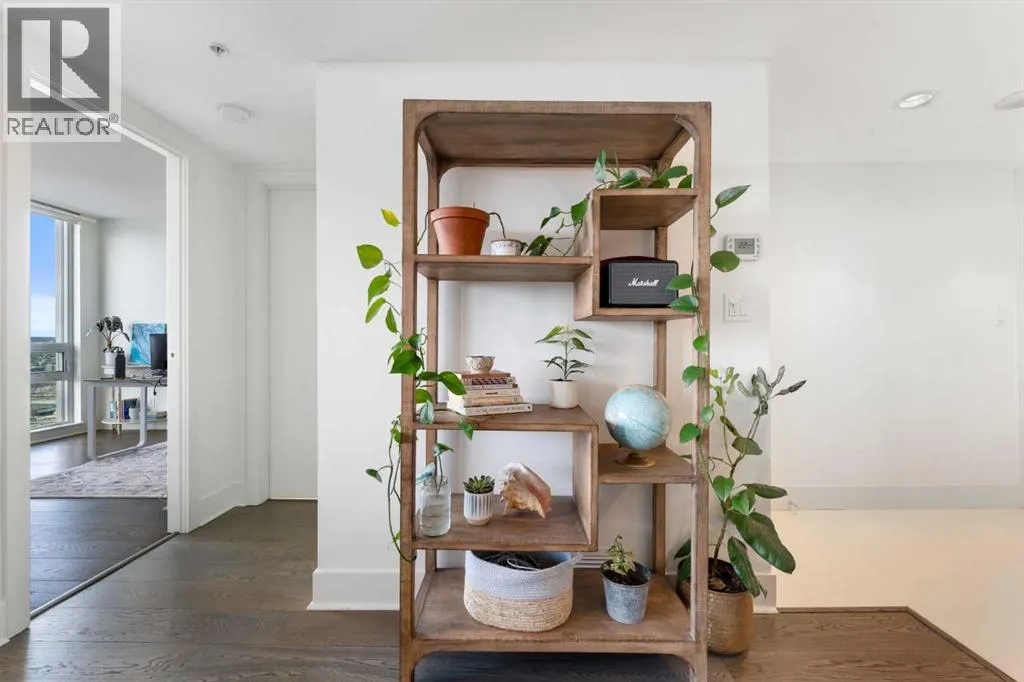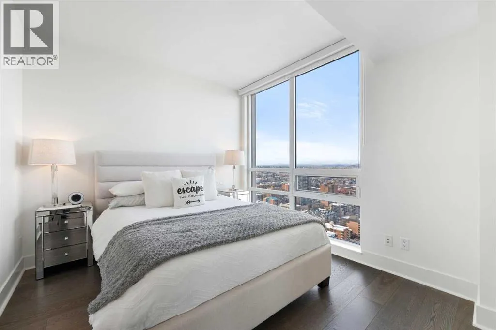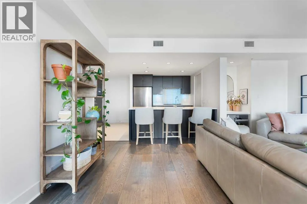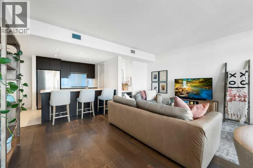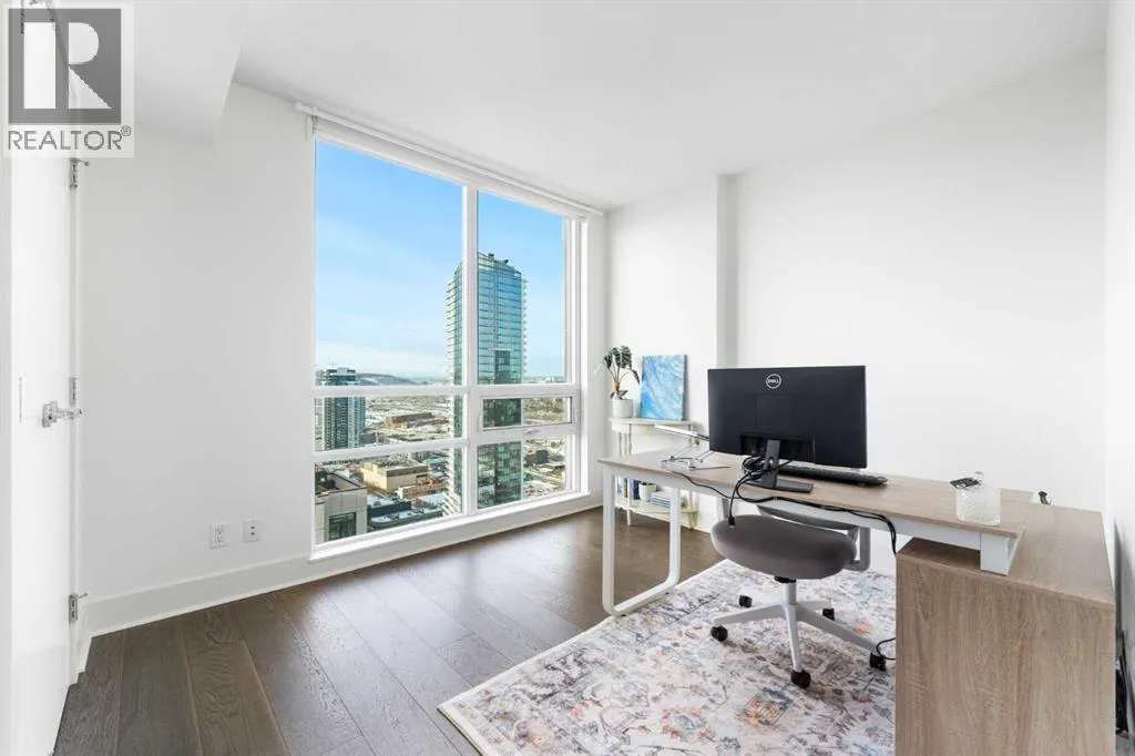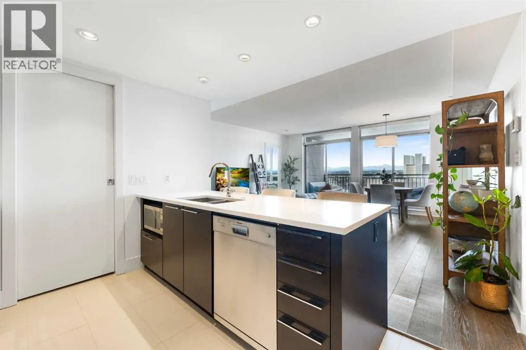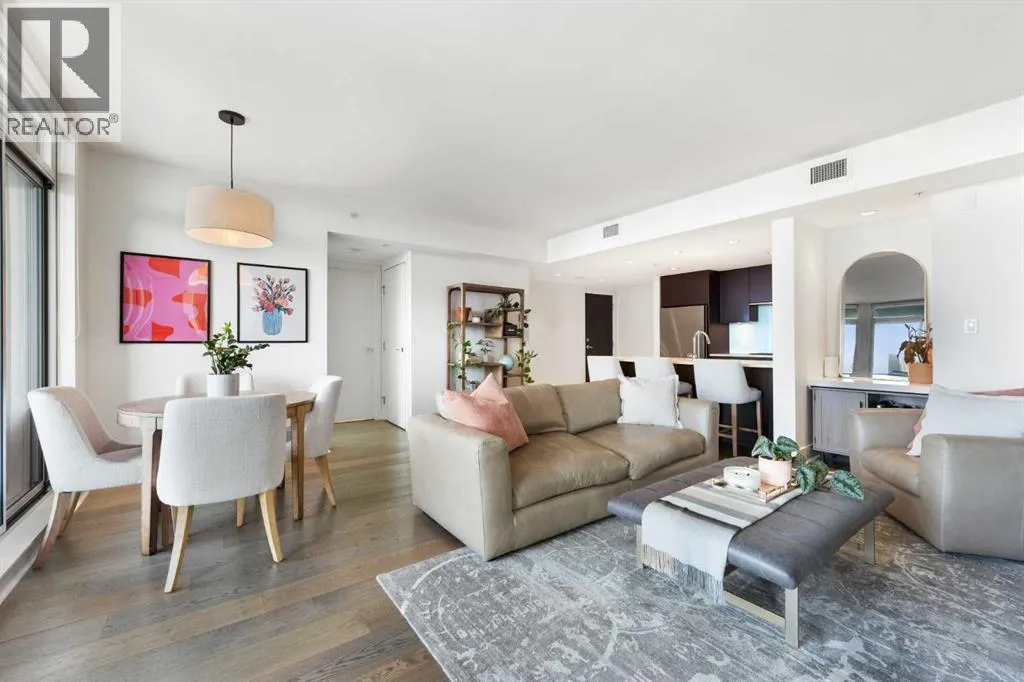 29 storeys above the city, this west-facing sub-penthouse offers a commanding perspective over the Bow River and Rocky Mountains â a front-row seat to Calgaryâs most breathtaking sunsets.This bright and beautifully laid-out two-bedroom, two-bathroom residence features a functional split-bedroom design, ideal for professionals, guests, or those working from home. A generous entryway welcomes you into an open-concept living space where the kitchen, dining, and living areas flow seamlessly together â all positioned to fully capture the view.The gourmet kitchen overlooks the main living area and offers excellent storage, a large pantry, and a dining space comfortably seating six. The living room is thoughtfully designed with room for a built-in desk or coffee bar â perfect for modern city living.The primary suite is a private retreat with a walk-in closet and a spa-inspired ensuite featuring dual vanities and a deep soaker tub. The second bedroom is well-proportioned with generous closet space and easy access to the second full bathroom.Floor-to-ceiling windows and hardwood flooring throughout enhance the natural light and elevate the space, while in-suite laundry and air conditioning add everyday comfort. Step outside through double sliding doors to your private patio â the ideal place to unwind and enjoy Calgaryâs most dramatic sunsets.Included are a titled parking stall on P1 and a separate storage locker.Residents of Luna enjoy concierge and security services, a state-of-the-art fitness centre, yoga studio, steam rooms, ownerâs lounge with fireplace and kitchen, pool table, and an expansive outdoor terrace. (id:27476)