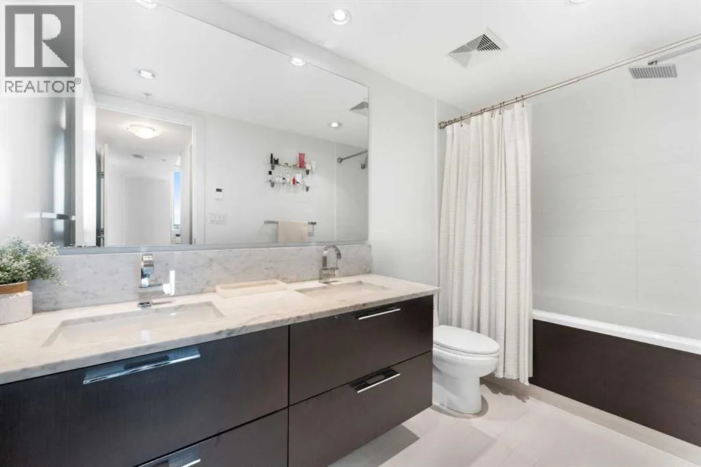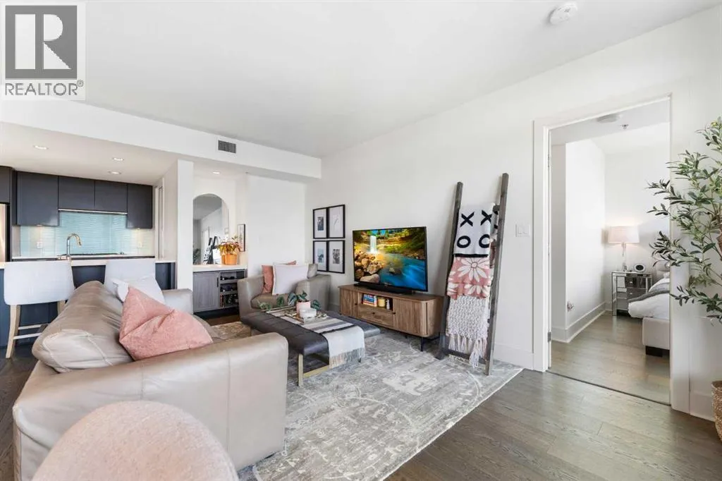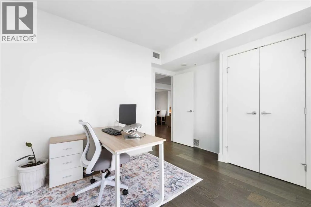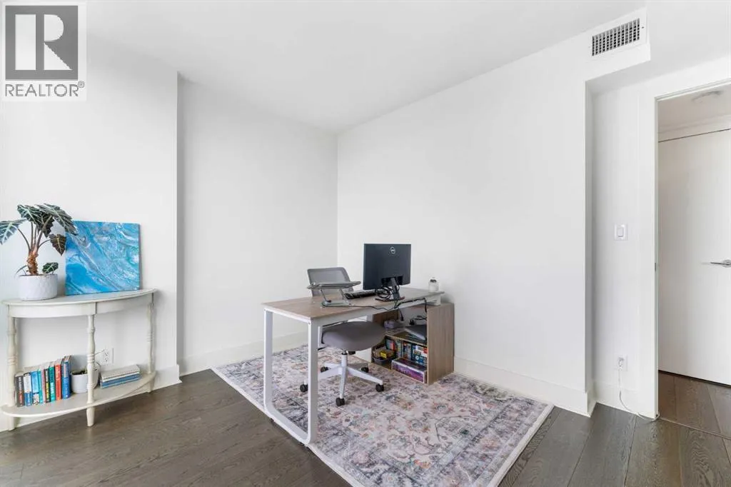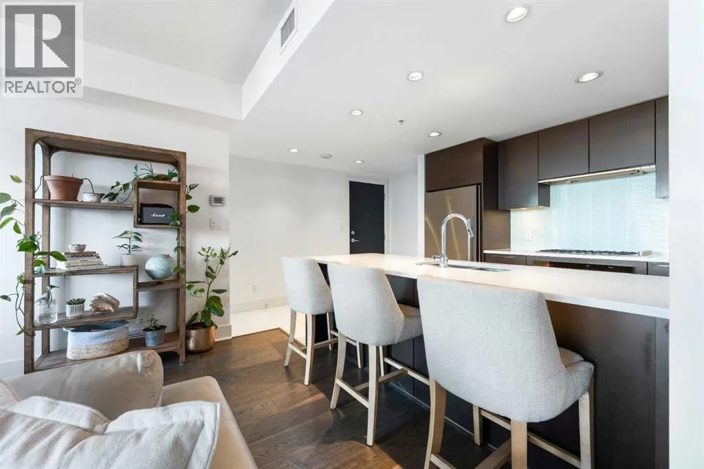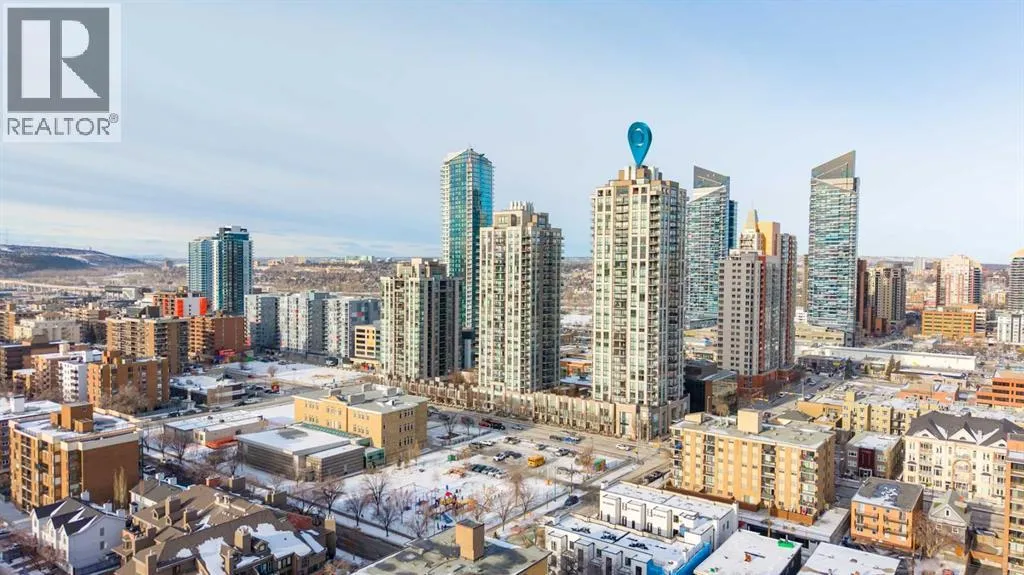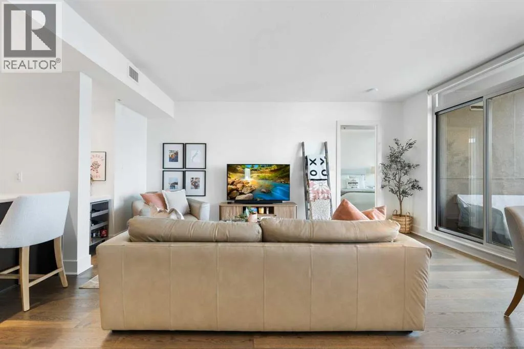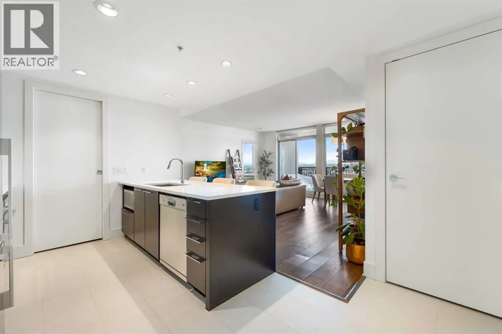 29 storeys above the city, this west-facing sub-penthouse offers a commanding perspective over the Bow River and Rocky Mountains â a front-row seat to Calgaryâs most breathtaking sunsets.This bright and beautifully laid-out two-bedroom, two-bathroom residence features a functional split-bedroom design, ideal for professionals, guests, or those working from home. A generous entryway welcomes you into an open-concept living space where the kitchen, dining, and living areas flow seamlessly together â all positioned to fully capture the view.The gourmet kitchen overlooks the main living area and offers excellent storage, a large pantry, and a dining space comfortably seating six. The living room is thoughtfully designed with room for a built-in desk or coffee bar â perfect for modern city living.The primary suite is a private retreat with a walk-in closet and a spa-inspired ensuite featuring dual vanities and a deep soaker tub. The second bedroom is well-proportioned with generous closet space and easy access to the second full bathroom.Floor-to-ceiling windows and hardwood flooring throughout enhance the natural light and elevate the space, while in-suite laundry and air conditioning add everyday comfort. Step outside through double sliding doors to your private patio â the ideal place to unwind and enjoy Calgaryâs most dramatic sunsets.Included are a titled parking stall on P1 and a separate storage locker.Residents of Luna enjoy concierge and security services, a state-of-the-art fitness centre, yoga studio, steam rooms, ownerâs lounge with fireplace and kitchen, pool table, and an expansive outdoor terrace. (id:27476)
