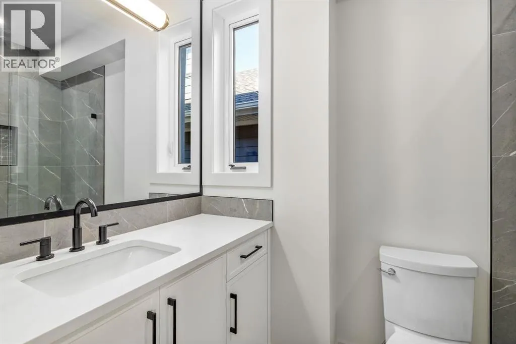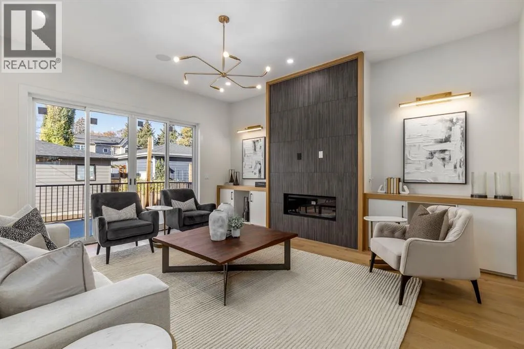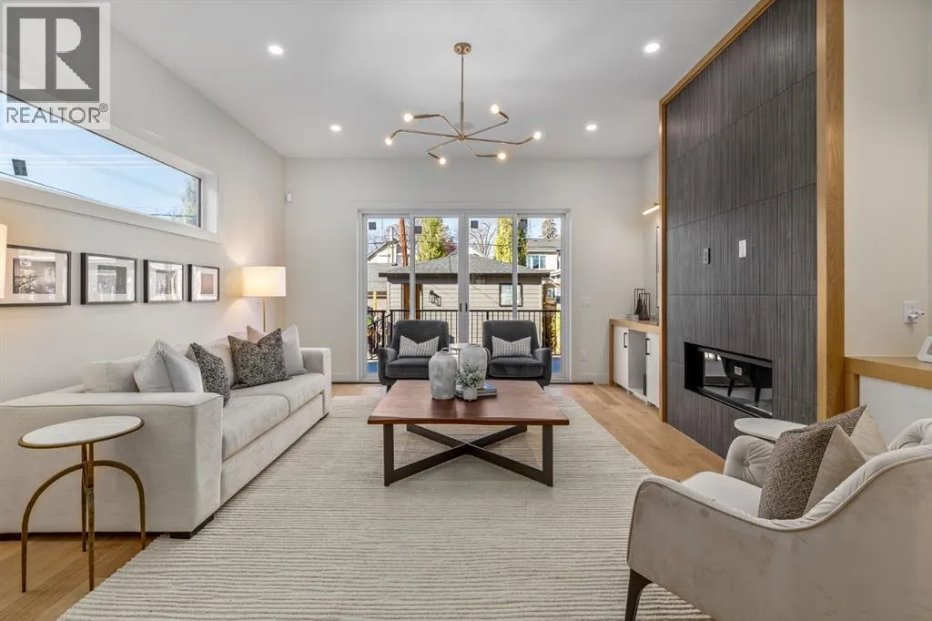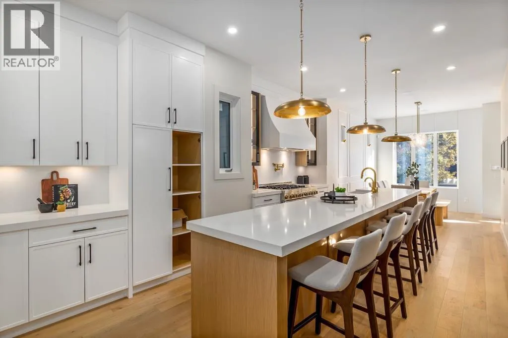 OPEN HOUSE Sunday Feb 15th 1-4PM! Experience elevated inner-city living with this impeccably designed, brand-new home nestled in one of Calgaryâs most sought-after neighbourhoods: Hillhurst. Constructed by a trusted local builder known for craftsmanship, functionality, and aesthetic excellence, this 2-storey residence offers 2,224 SF above grade, with a fully developed basement, 4 bedrooms, and 4.5 bathroomsâa perfect blend of modern luxury and thoughtful detail. From the striking brick facade to the high-end engineered wide plank oak hardwood, every inch of this home exudes quality. The main floor welcomes you with a built-in entry feature and a front formal dining area, accented by elegant wall mouldings, white and gold sconces, and a designer chandelier. At the other end, an open-concept living room is a showstopper, featuring a large-format textured tile fireplace, custom built-ins with display lighting, and massive patio sliders leading to a west-facing, 135-ft deep backyard with a raised patio and gas lineâideal for indoor-outdoor entertaining. The chefâs kitchen is nothing short of stunning, complete with a 2.5" thick quartz island, panel-ready fridge/freezer with knurled handles, sleek quartz countertops, a gas range with pot filler, and backlit display cabinets framing the custom hood fan. Youâll also find a farmhouse sink, full slab backsplash, hidden coffee/appliance nook, built-in pantry, and a drawer-style microwaveâeach designed to inspire culinary creativity. Tucked behind a barn-style sliding door, the den offers a quiet workspace with a built-in desk, shelving, and bright window. The mudroom, also with a barn door, features tiled flooring, a built-in bench, and a large closet for seamless organization. Upstairs, each of the three spacious bedrooms come with walk-in closets and custom built-ins, along with private ensuites. The primary is sure to impress with vaulted ceilings, a LED-lit feature wall, statement gold light fixture, and a spa-inspired ensuite that boasts a steam shower, dual vanities, and a standalone soaker tub with dramatic black and white tile wall backdrop. A nearby laundry room offers convenience with a sink, folding station, shelving, and tile backsplash. The fully finished, carpeted basement, with 9-ft ceilings, is roughed in for in-floor heating and designed for comfort and versatilityâfeaturing a spacious rec area, a TV wall with built-in components, a wet bar with lit display shelves and tile flooring, a full bath, and a large fourth bedroom with built-ins including a desk. An efficient mechanical room completes the lower level, with additional upgrades including solid core doors and built-in speakers throughout the entire home. Perfectly situated just steps from shops along 14 St NW and walking distance to Kensington Village, Calgaryâs extensive river pathways, and the Downtown Coreâthis is urban luxury at its finest. Act now and make this exceptional Hillhurst property your forever home. (id:27476)
