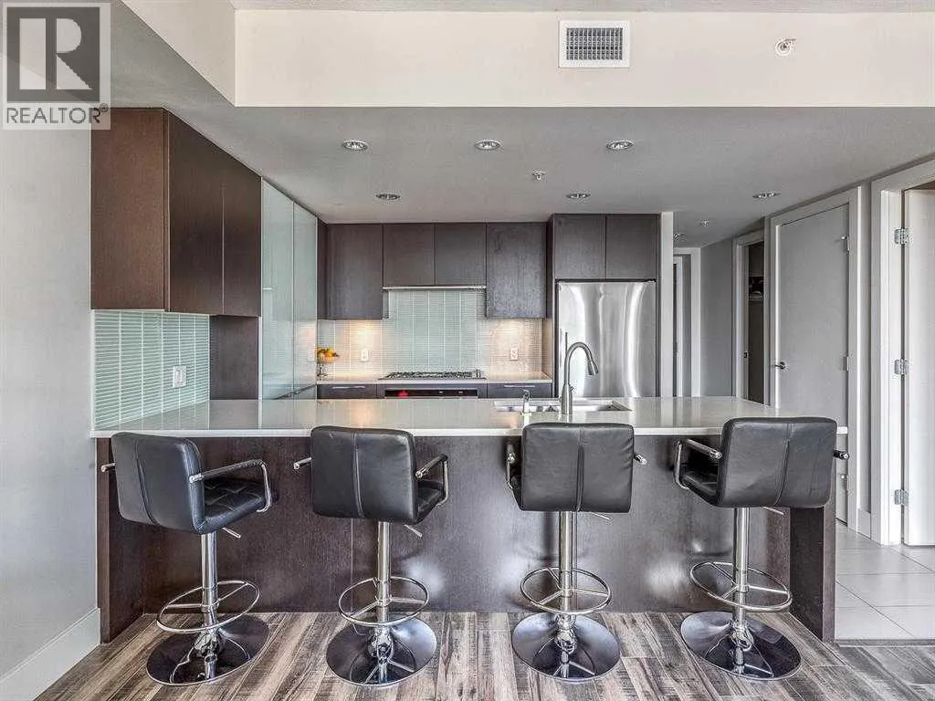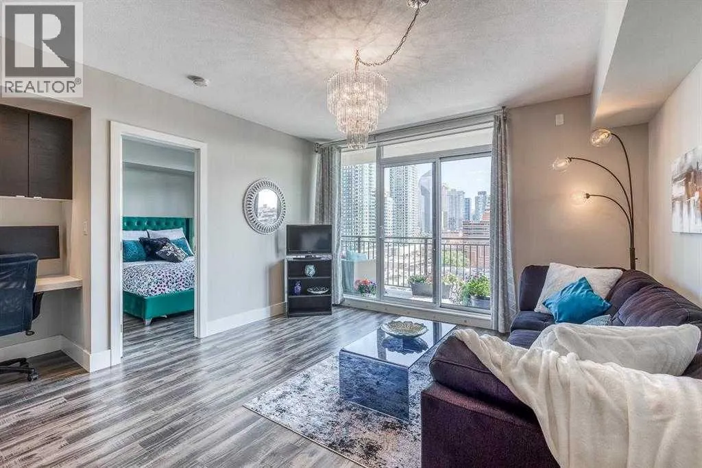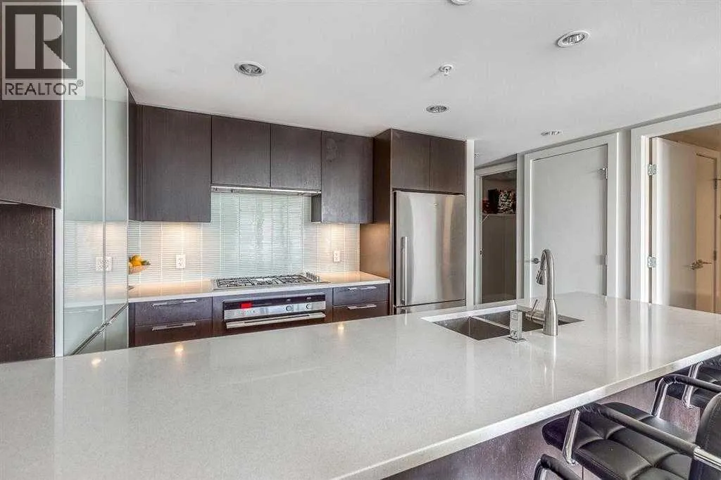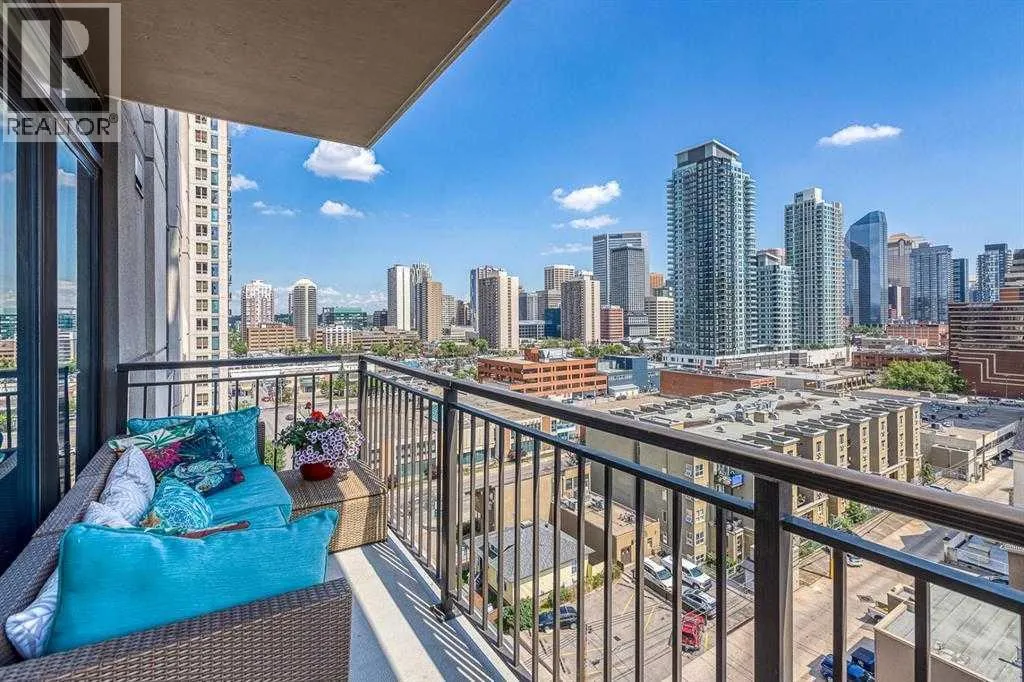 WELCOME TO LUNA â 1-BED/1-BATH W/ UNOBSTRUCTED 180-DEGREE DOWNTOWN VIEWS & FULL-SERVICE AMENITIES! Set in the popular LUNA building in the heart of the Beltline, this 1-bedroom, 1-bath condo offers one of the best layouts in the building, great storage, and open views of Calgaryâs downtown skyline. Walking in, youâre welcomed by a spacious foyer and walk-in shoe closet, giving you plenty of room to unload shoes, coats, and daily gear. The open-concept kitchen is sure to impress, featuring Quartz countertops, flat-panel walnut & glass cabinetry, matching glass backsplash, stainless steel appliances, a gas cooktop, and a large island with seating for 4. The living and dining area easily fits a full sectional and TV setup, with direct access to the balcony. Step outside to enjoy a relaxing morning coffee while taking in the East-facing views of the Calgary skyline. Back inside, a built-in desk area provides a convenient work-from-home setup without taking over the living space. The bedroom fits a queen bed comfortably and connects to the balcony, with a walk-through closet leading into the 4-piece bathroom. The bathroom includes a soaker tub, a separate glass shower, and clean, modern finishes. This unit also includes in-suite laundry, central A/C, a separate in-unit storage room (a rare bonus in a one-bedroom), and a titled parking stall in the heated underground parkade. LUNA is a concrete building with concierge service and strong amenities, including a full fitness centre, yoga studio, ownerâs lounge with fireplace and games area, guest suites, and secure underground parking. The building is well managed and known for its modern feel and unbeatable location. Situated in the heart of the Beltline, LUNA is surrounded by Calgaryâs top dining, shopping, and lifestyle amenities. Enjoy walkability to 17th Ave, Safeway, fitness studios, cafés, restaurants and more. Plus, get easy access to the rest of the downtown core and city through nearby LRT train station with free f are when traveling within downtown. Jumping in the car: Airport is a 19 min drive (17.5KM), & Banff is a 1 hr 27 min drive (126KM). (id:27476)