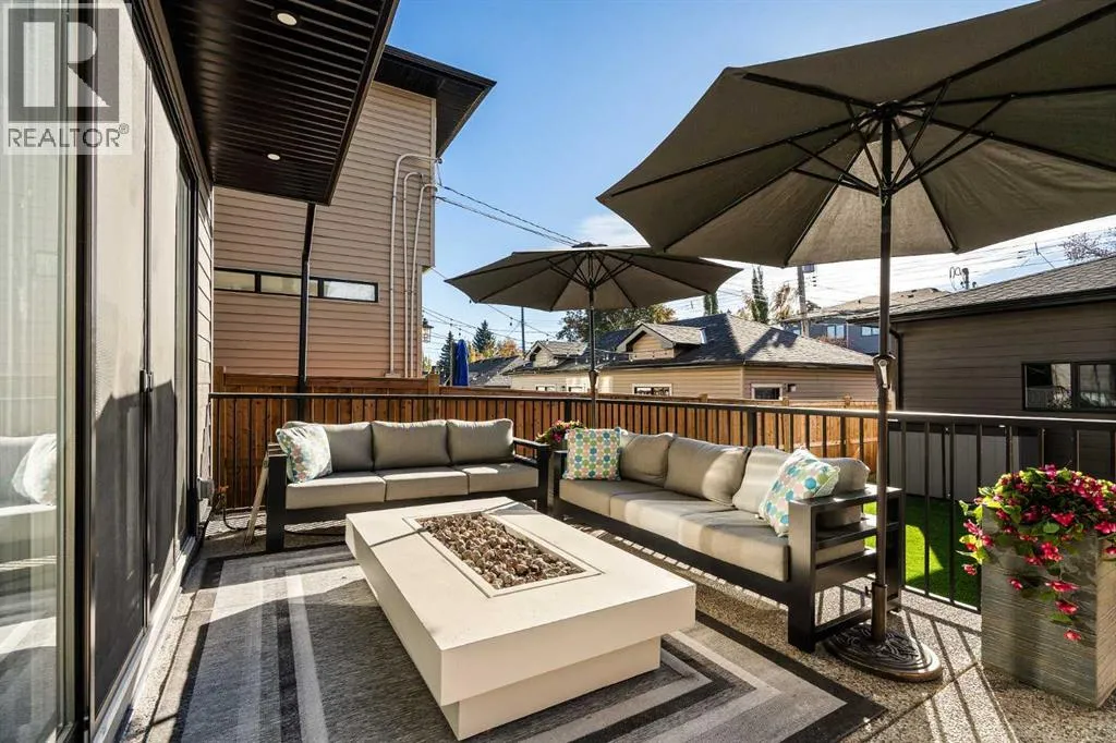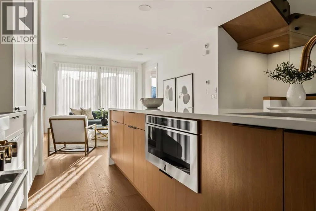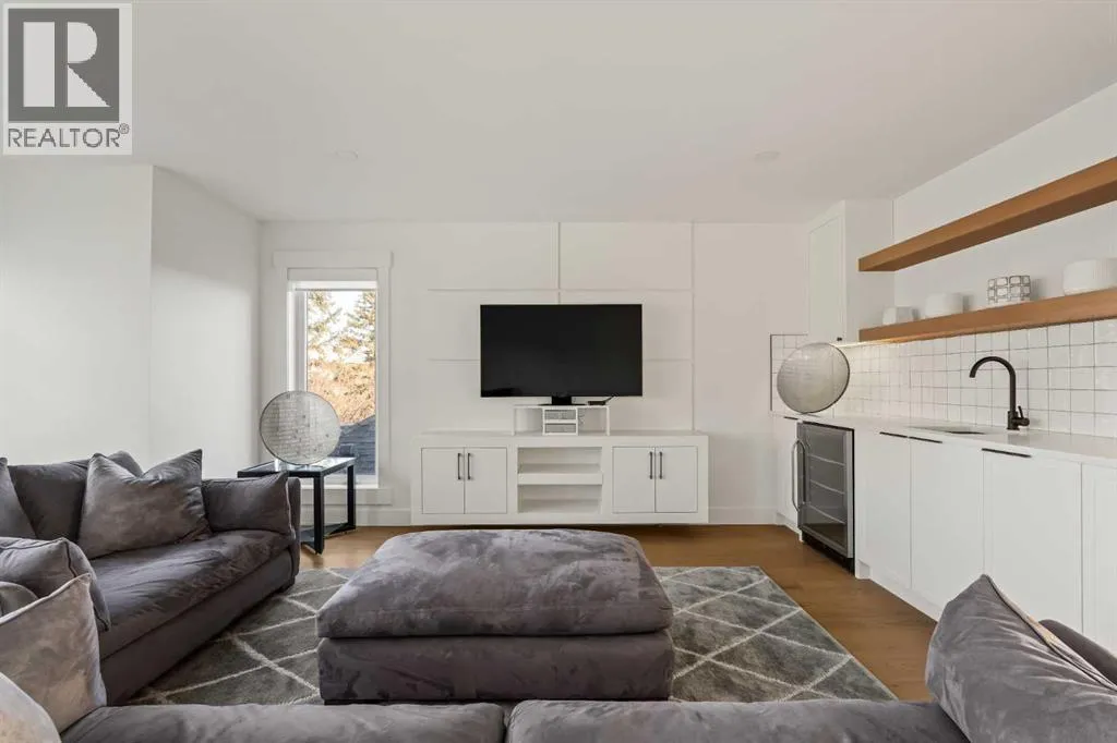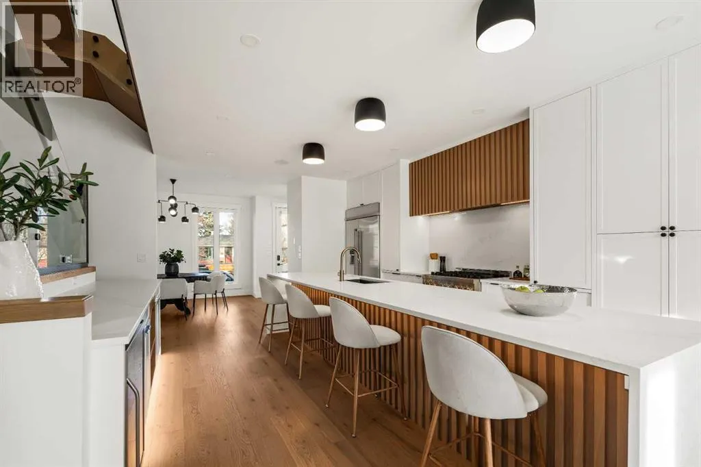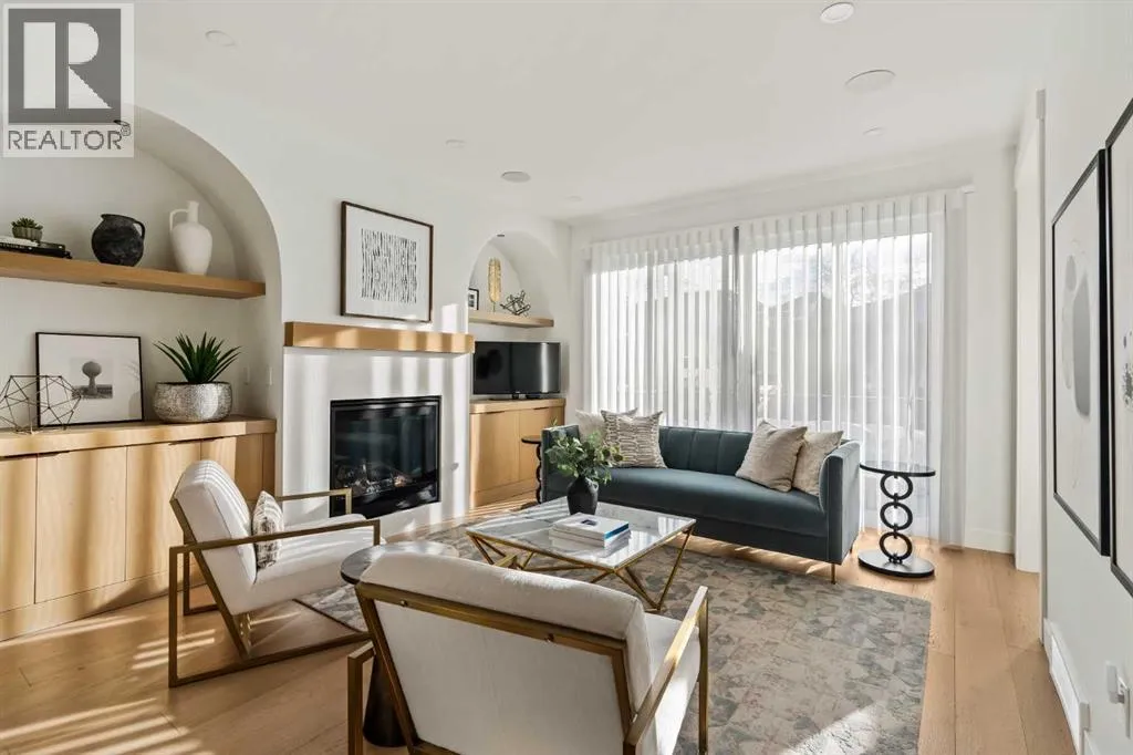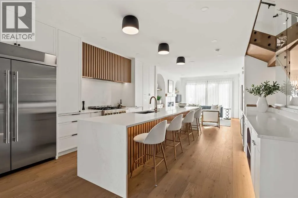 Stunning luxury 3-storey semi-detached residence offering 4 bedrooms, 4.5 bathrooms, a private south-facing backyard, fully air conditioned & ideally located in the heart of highly sought-after Altadore. Showcasing exceptional curb appeal with a gorgeous front elevation, this modern home is filled with natural light from expansive windows & features, thoughtful design & high-end upgrades throughout.The inviting front entry is both stylish & functional, complete with a built-in bench, coat hooks, & smart shoe storage. A front dining room sets the stage for elegant entertaining, while the heart of the home is the extensively upgraded central kitchen, anchored by a large waterfall island. Highlights include full-height cabinetry, deep lower drawers, soft-close hardware, a built-in pantry, & custom hood fan. Premium JennAir stainless steel appliances include a French-door refrigerator, gas range, built-in microwave, garburator & dishwasher. Across from the island, additional built-in cabinetry & counter space feature a beverage cooler.The rear living room is warm & refined, centred around a gas fireplace with recessed built-ins & custom millwork. Ten-foot-wide sliding patio doors open onto a south-facing exposed aggregate deck, seamlessly blending indoor & outdoor living. A spacious rear mudroom offers a closet, bench, & coat hooks, along with a private powder room featuring a vessel sink & sleek linear mirror.The second level includes the primary retreat featuring a generous bedroom & a spa-inspired 5-piece ensuite with a freestanding soaker tub surrounded by floor-to-ceiling tile, heated floors, a custom walk-in glass steam shower with rainfall shower head & built-in bench, dual vanity, & a walk-in closet with custom organizers, drawers, and a full-height mirror. Two additional bedrooms, complemented by a beautiful 4-piece bathroom & a thoughtfully designed laundry room with abundant cabinetry, counter space, & sink.The third level offers incredible flexibility wi th a bright loft-style bonus room featuring a built-in media centre & wet bar with beverage cooler, a separate home office, a full four-piece bathroom, & access to a private south-facing balcony. This level can also easily function as a studio-style 5th bedroom.The fully developed lower level is equally impressive, featuring a family room with wet bar & custom cabinetry, a 10-foot-wide glass-enclosed home gym with rubber flooring, a 4th bedroom, & a 3-piece bathroom. This level is roughed-in for in-floor heating. Built-in speakers are installed throughout the home & centrally wired to the mechanical room, & the property is also roughed-in for a central vacuum system.Outside, the backyard has been upgraded with turf for low-maintenance living, while the deck offers the perfect space for outdoor furniture. Altadore remains one of Calgaryâs most desirable inner-city communities, offering quick access to Glenmore Athletic Park, Marda Loop, River Park off-leash, Sandy Beach, schools and more! (id:27476)