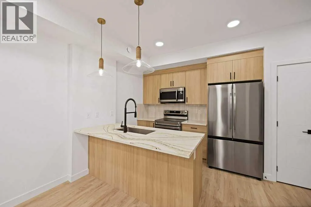Welcome to this brand-new stacked townhouse by ROHIT Homes, available for quick possession in one of Setonâs most amenity-rich communities. Enjoy unparalleled convenience with easy access to the South Health Campus, Cineplex, shopping, schools, restaurants, and major highways. This thoughtfully designed unit is ideal for first-time home buyers or investors. The entry opens to a bright, open-concept layout featuring gleaming vinyl plank flooring throughout the main living areas and ceramic tile in the bathroom. Large windows fill the spacious living room with natural light, while the dedicated dining area flows seamlessly into a modern kitchen equipped with an island and stainless steel appliances. The generous bedroom offers his-and-hers closets, accompanied by a well-appointed 4-piece bathroom. A separate laundry space with a stacked washer and dryer completes the convenient main-floor plan. (id:27476)