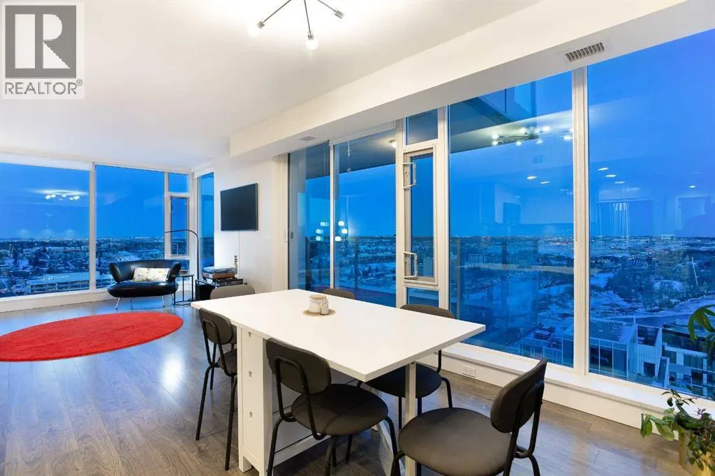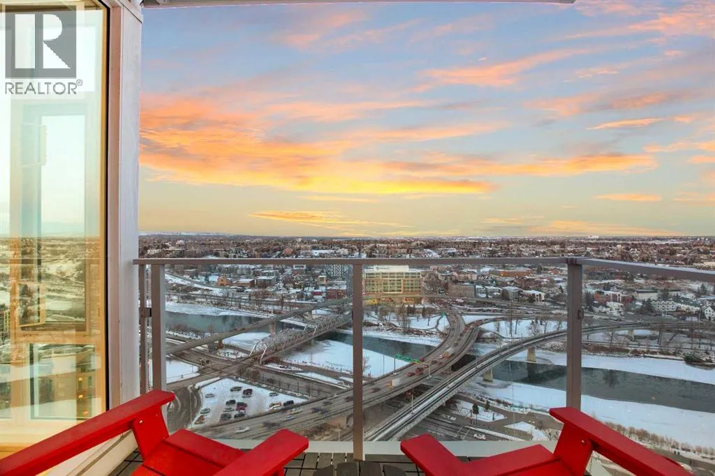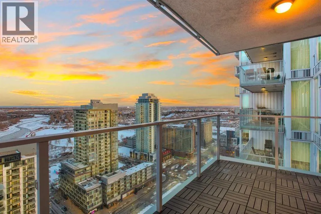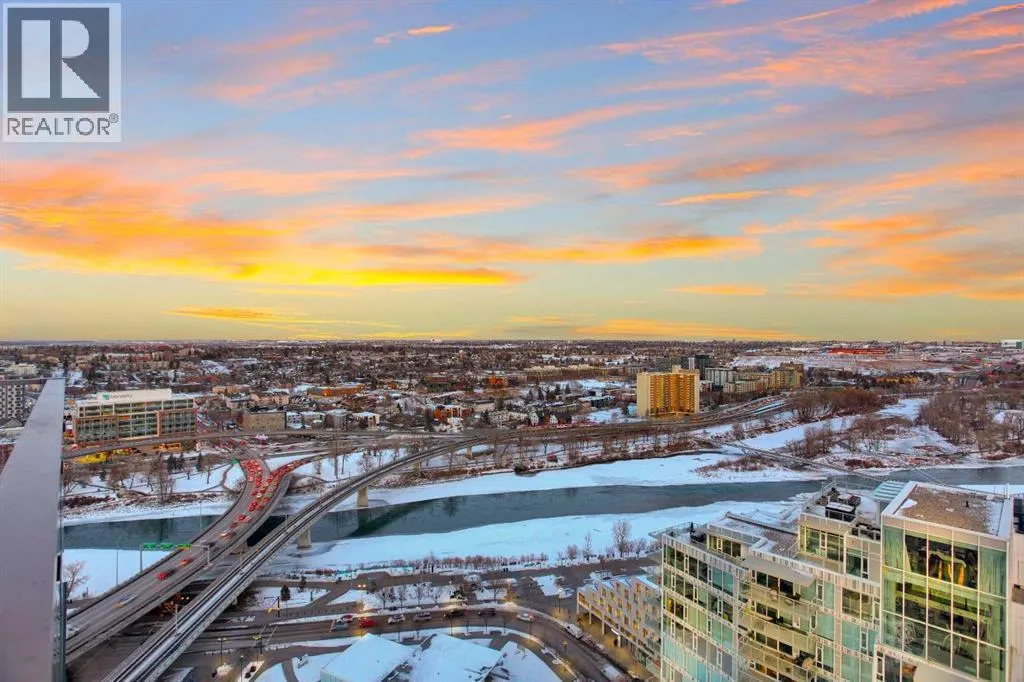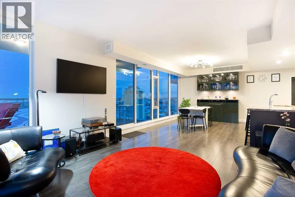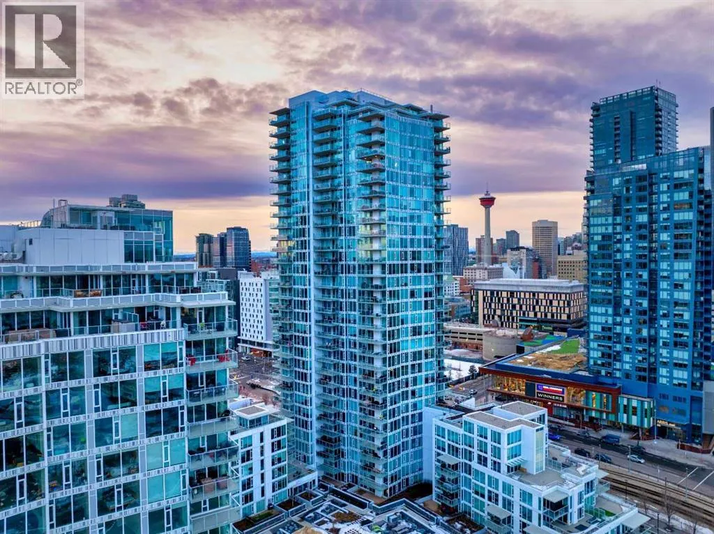 Experience refined urban living with breathtaking panoramic views from this luxurious 27th-floor residence in the coveted Evolution tower, located in Calgaryâs dynamic East Village. Offering over 1,100 sq. ft. of impeccably designed living space, this elegant home is bathed in natural light through floor-to-ceiling windows that frame sweeping city, river, and skyline views from the northwest to the southeast. The chef-inspired kitchen features granite countertops, premium stainless steel appliances, and a gas range, seamlessly flowing into the open living and dining areasâideal for both everyday living and sophisticated entertaining. The primary retreat showcases stunning Bow River views, a walk-through closet, and a spa-like 5-piece ensuite. A spacious second bedroom, full bathroom, private office/den, ensuite laundry, and two titled parking stalls complete the residence. Residents enjoy an exceptional lifestyle with 24-hour concierge, fitness centre with sauna and steam room, and an exclusive rooftop patio with BBQ. Just steps from the RiverWalk, St. Patrickâs Island, Central Library, and the cityâs finest cultural attractions, this is downtown luxury at its finestâwhere you drift off beneath the stars and awaken to the glow of the rising sun. (id:27476)