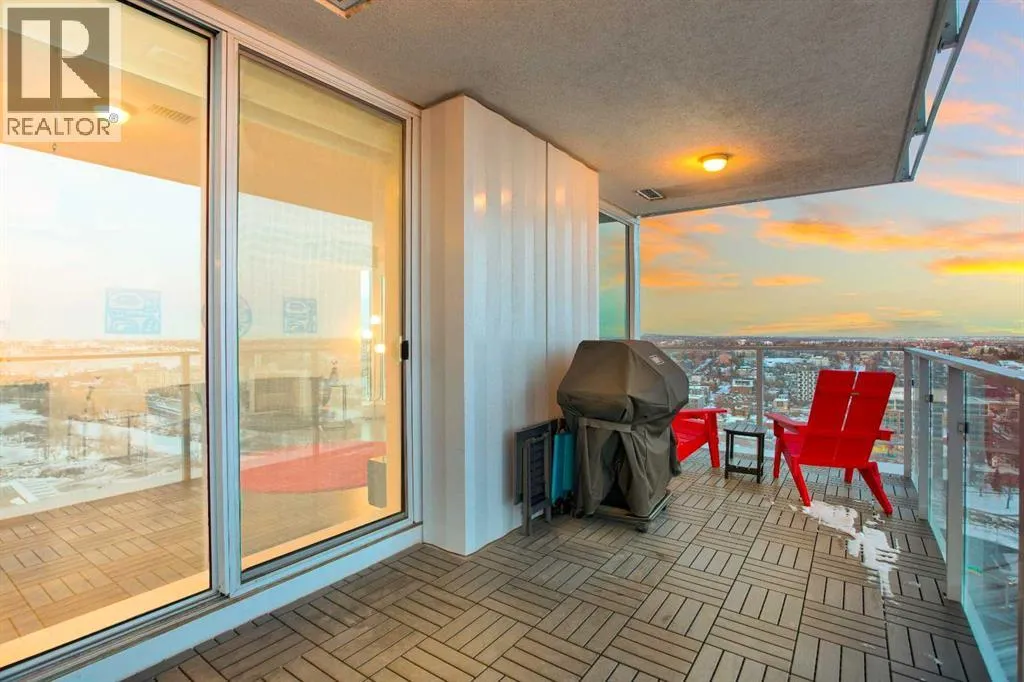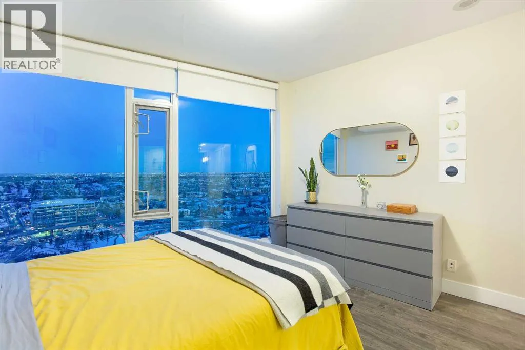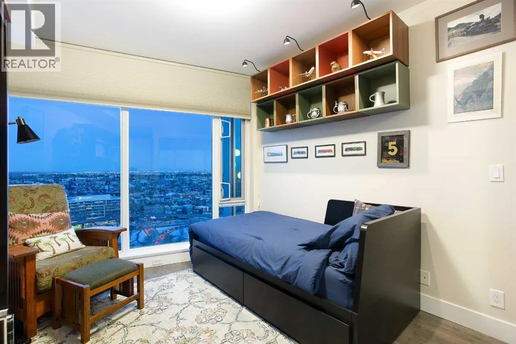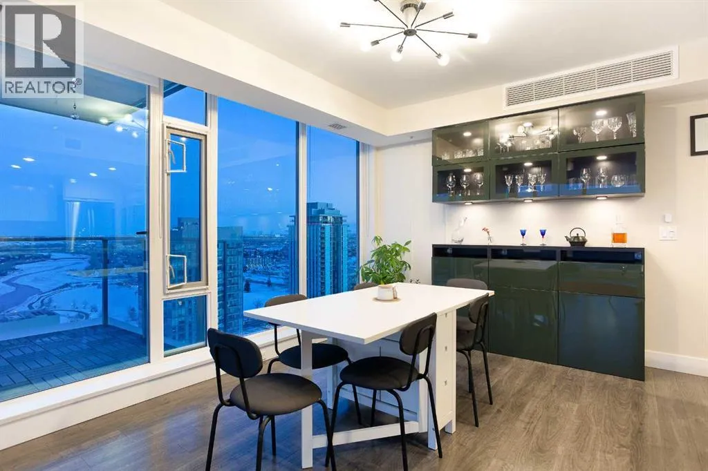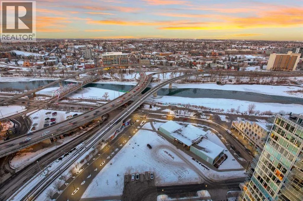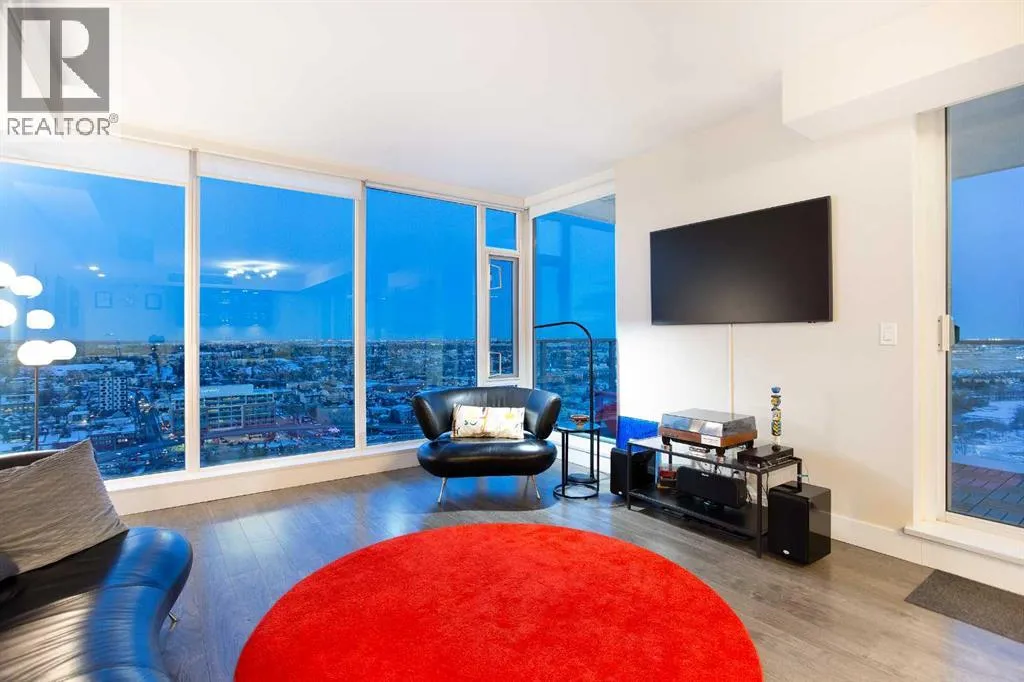 Experience refined urban living with breathtaking panoramic views from this luxurious 27th-floor residence in the coveted Evolution tower, located in Calgaryâs dynamic East Village. Offering over 1,100 sq. ft. of impeccably designed living space, this elegant home is bathed in natural light through floor-to-ceiling windows that frame sweeping city, river, and skyline views from the northwest to the southeast. The chef-inspired kitchen features granite countertops, premium stainless steel appliances, and a gas range, seamlessly flowing into the open living and dining areasâideal for both everyday living and sophisticated entertaining. The primary retreat showcases stunning Bow River views, a walk-through closet, and a spa-like 5-piece ensuite. A spacious second bedroom, full bathroom, private office/den, ensuite laundry, and two titled parking stalls complete the residence. Residents enjoy an exceptional lifestyle with 24-hour concierge, fitness centre with sauna and steam room, and an exclusive rooftop patio with BBQ. Just steps from the RiverWalk, St. Patrickâs Island, Central Library, and the cityâs finest cultural attractions, this is downtown luxury at its finestâwhere you drift off beneath the stars and awaken to the glow of the rising sun. (id:27476)