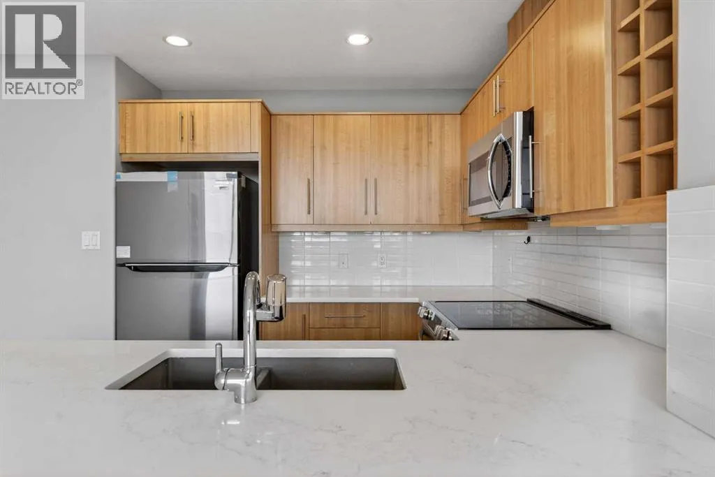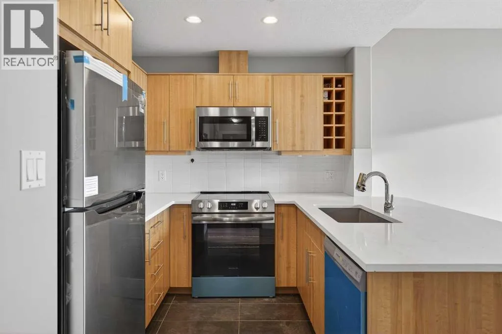 Welcome to this beautifully updated and meticulously maintained 2-bedroom, 2-bathroom condo featuring breathtaking southwest exposure and unobstructed mountain views from both the living room and primary bedroom. Flooded with natural light, this home offers the perfect blend of comfort, style, and convenience in one of Calgaryâs most connected west-side locations. The home has been tastefully upgraded with brand-new quartz countertops in both the kitchen and bathrooms, new modern faucets, and brand-new stainless steel appliances, giving the space a fresh, contemporary feel and true move-in-ready appeal. The bright and spacious open-concept layout is perfect for both everyday living and entertaining, while large windows frame spectacular views and stunning sunsets. Strategically located just 10 minutes from downtown, this unbeatable location offers direct access to bike paths leading to the Bow River and city core. Westbrook Mall, Walmart, shops, cafés, restaurants, and the Westbrook LRT station are literally steps from your door, making commuting and daily errands effortless. Shaganappi Golf Course is right next door for outdoor enthusiasts. Residents enjoy resort-style amenities including a fitness centre, indoor swimming pool, hot tub, and bookable conference rooms. The unit also includes a titled heated underground parking stall and an assigned storage locker for added convenience. Perfect for professionals, down-sizers, or investors, this is a rare opportunity to own a bright, upgraded, view-oriented home in an unbeatable location. (id:27476)