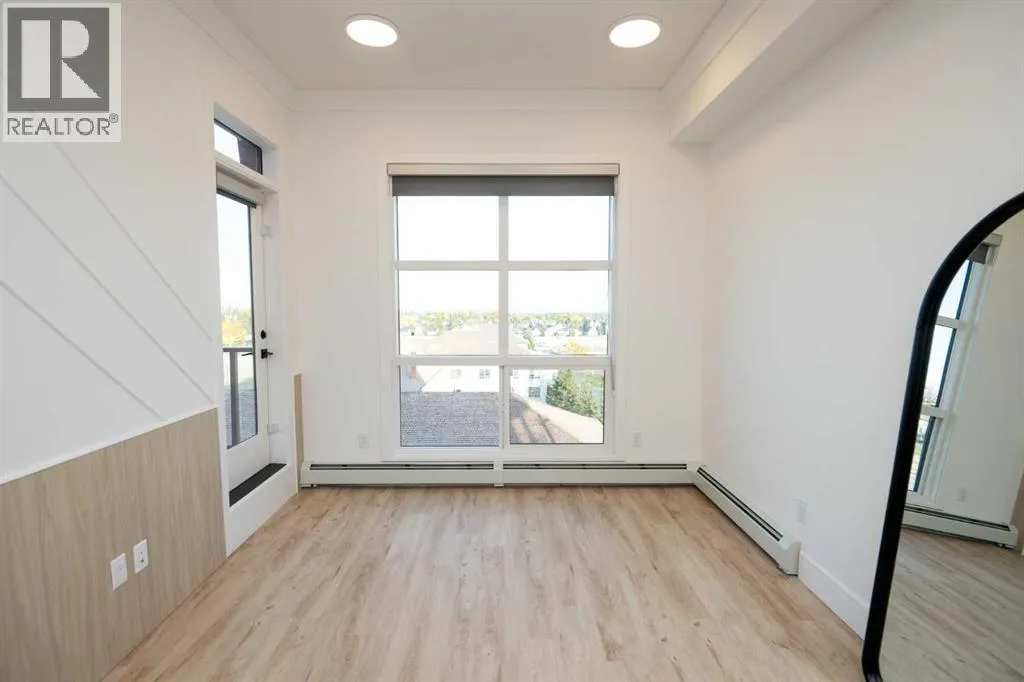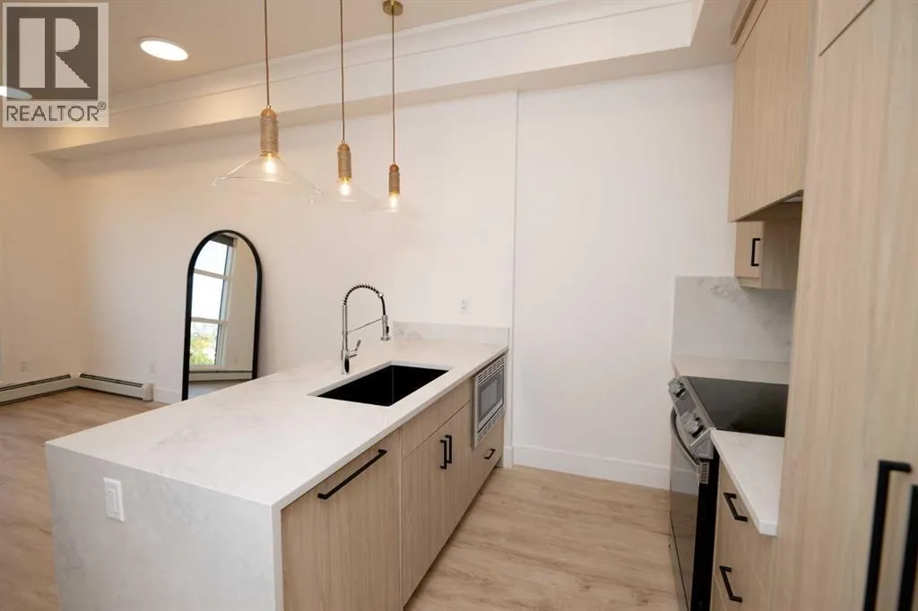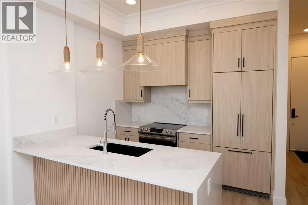 Welcome to the "Verde" floorplan by Rohit Homesâan inspired 1-bedroom, 1-bathroom home with a flexible den, designed to elevate your lifestyle. Perfectly positioned in the sought-after Quesnay at Currie Barracks, this west-facing unit is drenched in afternoon sunlight, offering a bright and welcoming living space. Complemented by the serene Ethereal Zen color palette, this home is a modern sanctuary with a calming atmosphere. The Verde floorplan blends elegance and functionality with carefully chosen details like 9' ceilings, quartz countertops with a stunning waterfall edge, a matching quartz backsplash, full-height cabinetry, stainless steel appliances, designer light fixtures, and tasteful window coverings. The open layout connects the kitchen, dining, and living areas seamlessly, providing an effortless space for entertaining or relaxation. The primary bedroom is thoughtfully designed as a peaceful retreat, while the den offers endless possibilitiesâwhether you need a workspace, a reading nook, or extra storage. The luxurious bathroom is highlighted by fully tiled walls, refined finishes, and a spa-inspired tub/shower combo. A private west-facing balcony completes the home, making it the perfect spot to take in glowing sunsets or unwind after a busy day. In this pet-friendly, AIRBNB-approved building, you'll enjoy titled heated underground parking, visitor spaces, and unmatched convenience. Located minutes from downtown, Mount Royal University, and the vibrant offerings of 17th Ave and Marda Loop, the Verde floorplan is an unbeatable opportunity for modern living. Act fastâthis west-facing gem won't be available for long! **Photos are taken from existing buildings of the same models. Not of the exact unit ** (id:27476)