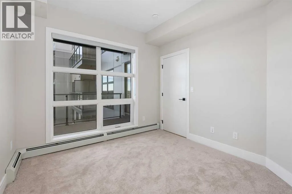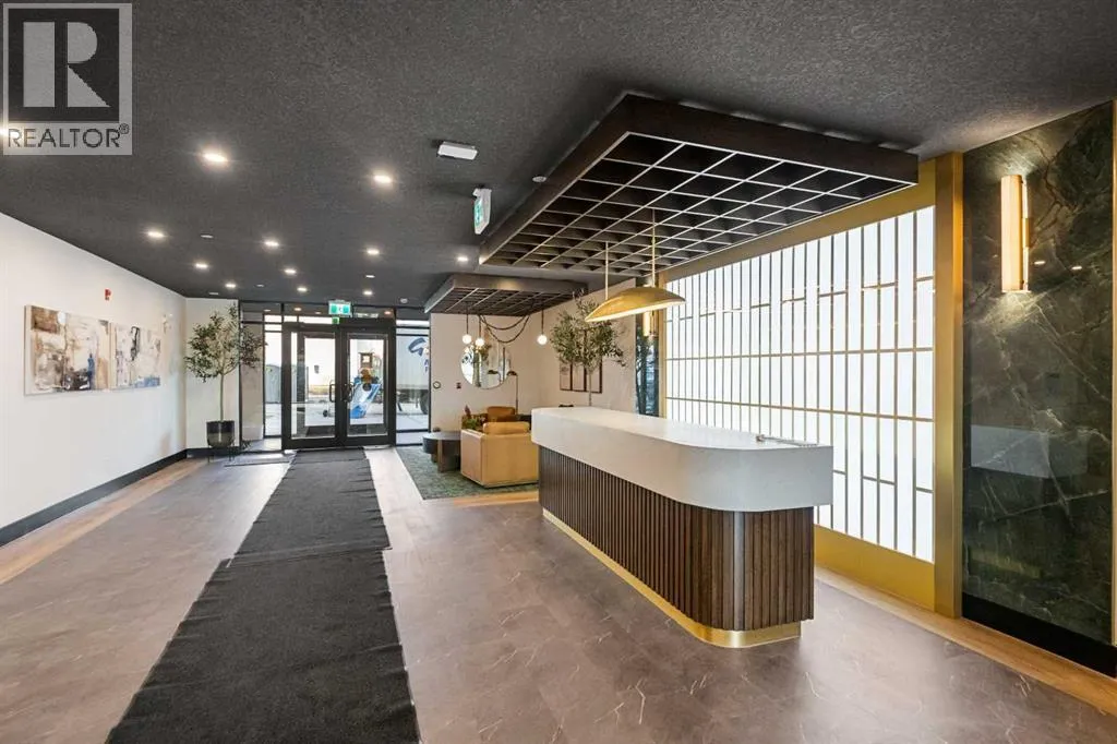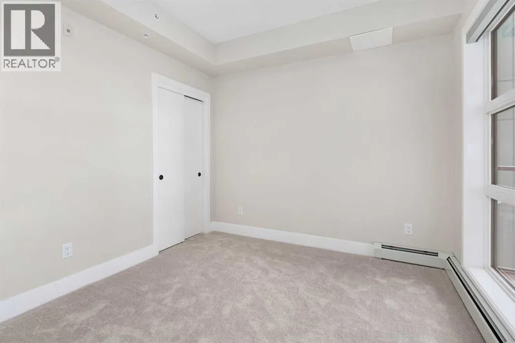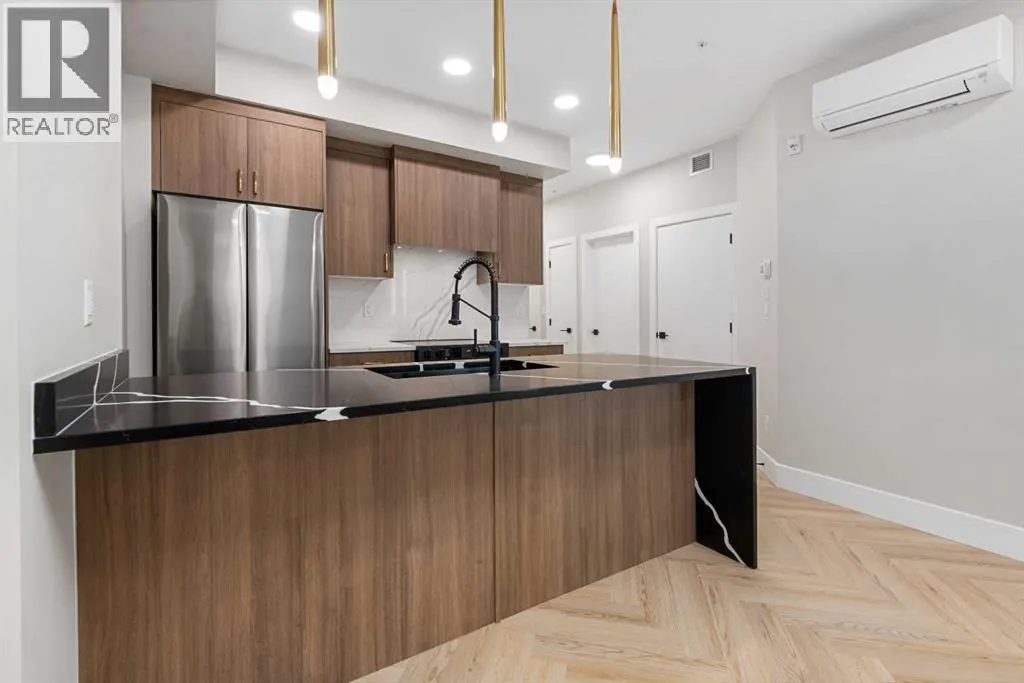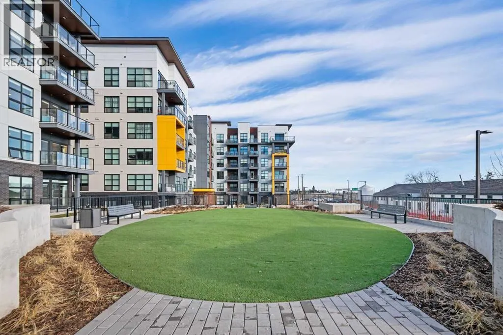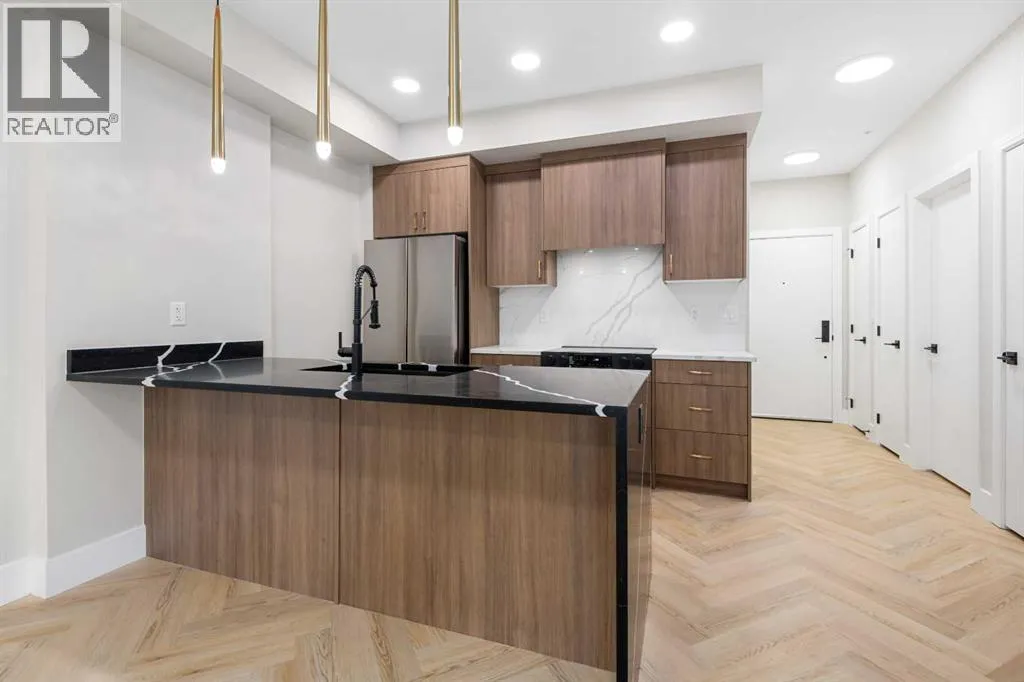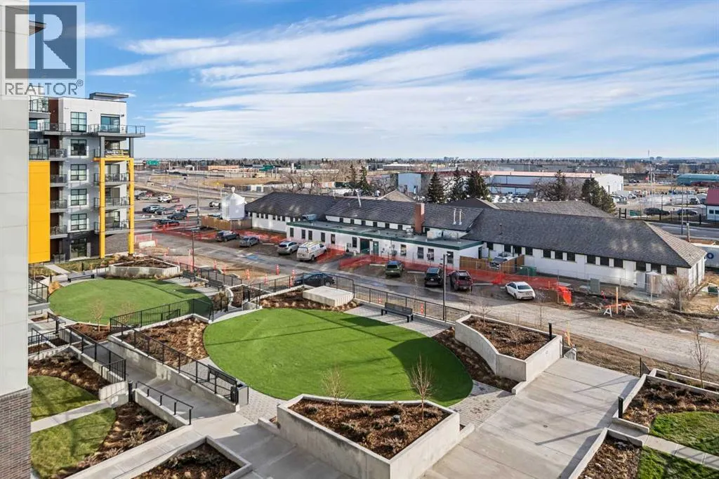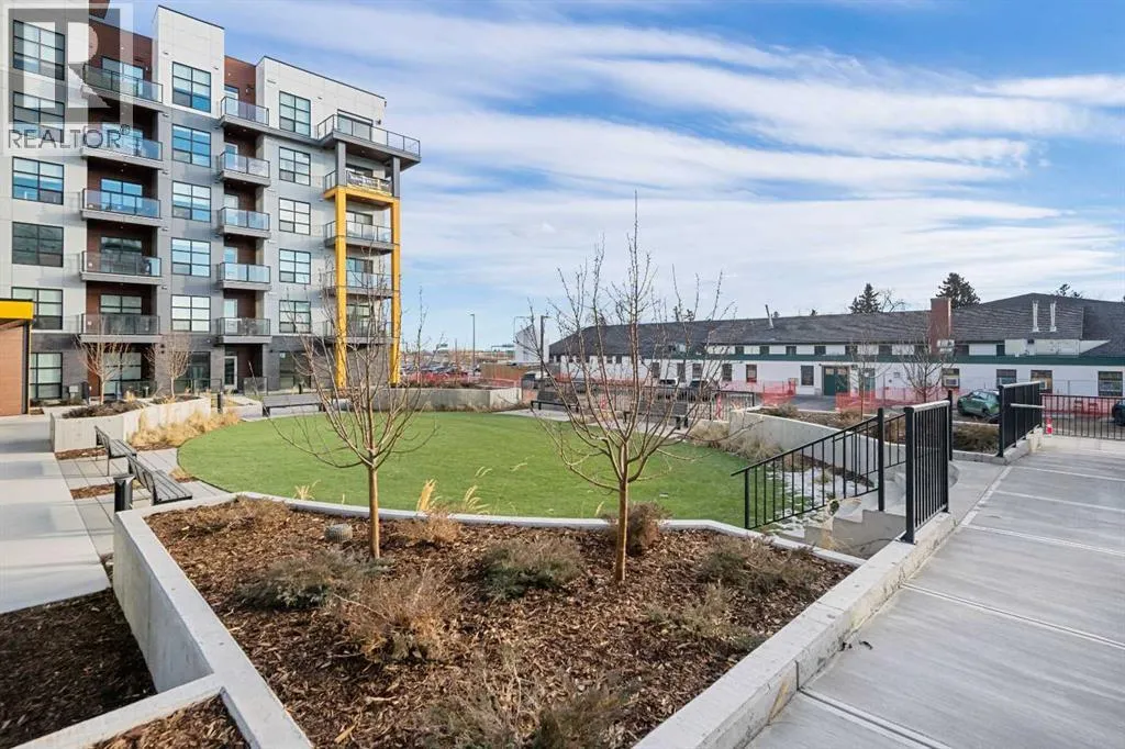 Welcome to the âAzzuroâ floorplan by Rohit Homes Calgary, a thoughtfully designed 1-bedroom + den, 1-bathroom residence that blends timeless style with modern functionality. Located on the 4th floor of the highly sought-after Quesnay at Currie Barracks, this south-facing unit enjoys excellent natural light throughout the day and offers the added convenience of being situated near the elevatorâideal for everyday ease and accessibility.Finished in the elegant Neoclassical design palette, the Azzuro delivers a refined aesthetic with warm tones, clean lines, and elevated detailing. This smart layout features 9â ceilings, quartz countertops with a waterfall edge, a coordinating quartz backsplash, full-height cabinetry, stainless steel appliances, designer lighting, and window coverings. The open-concept kitchen, dining, and living areas flow seamlessly together, creating a welcoming and efficient space for both relaxing and entertaining.The primary bedroom provides a comfortable retreat, while the versatile den is perfect for a home office, study, or additional storageâone of the most sought-after features of this floorplan. The spa-inspired bathroom includes fully tiled walls, polished finishes, and a tub/shower combination for a hotel-like feel. Step out onto your private south-facing balcony to enjoy sunshine and courtyard views.This pet-friendly and AIRBNB-friendly building includes titled heated underground parking and ample visitor parking. Ideally located just minutes from downtown Calgary, Mount Royal University, and the vibrant shops and restaurants of 17th Ave and Marda Loop, this home offers both convenience and lifestyle.The Azzuro is a popular and well-loved floorplan - Donât miss your opportunity to own in one of Calgaryâs most exciting inner-city communities. (id:27476)