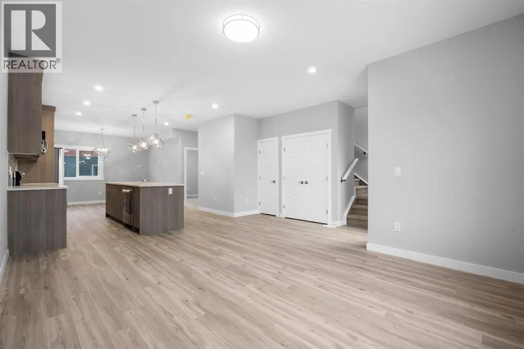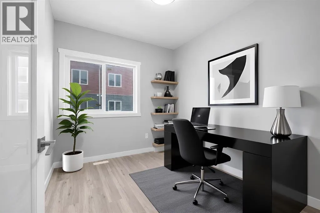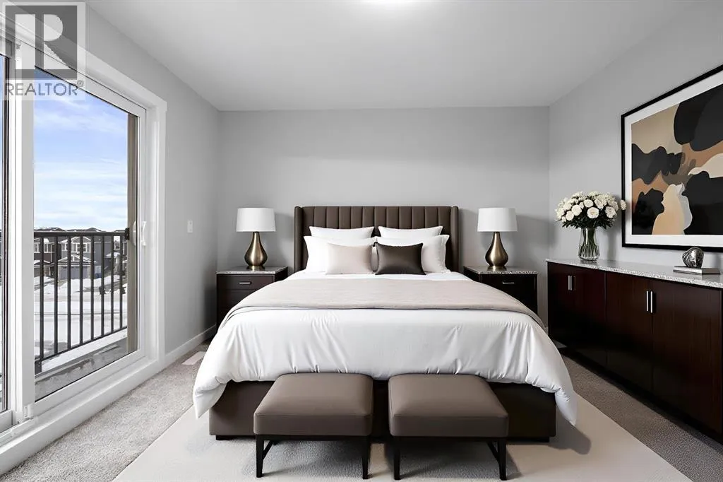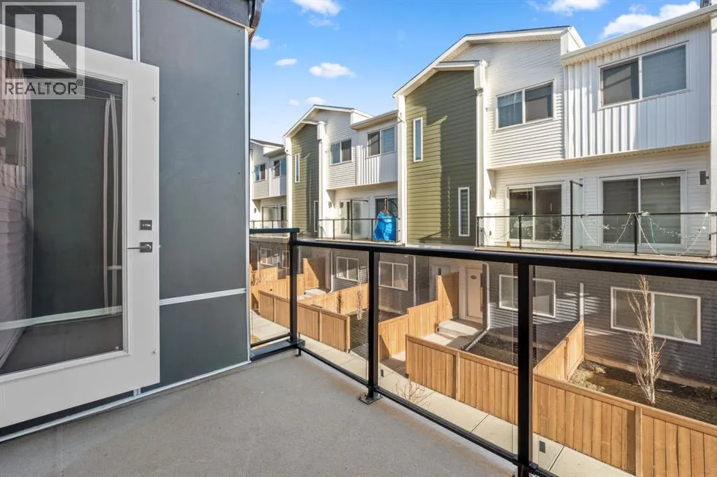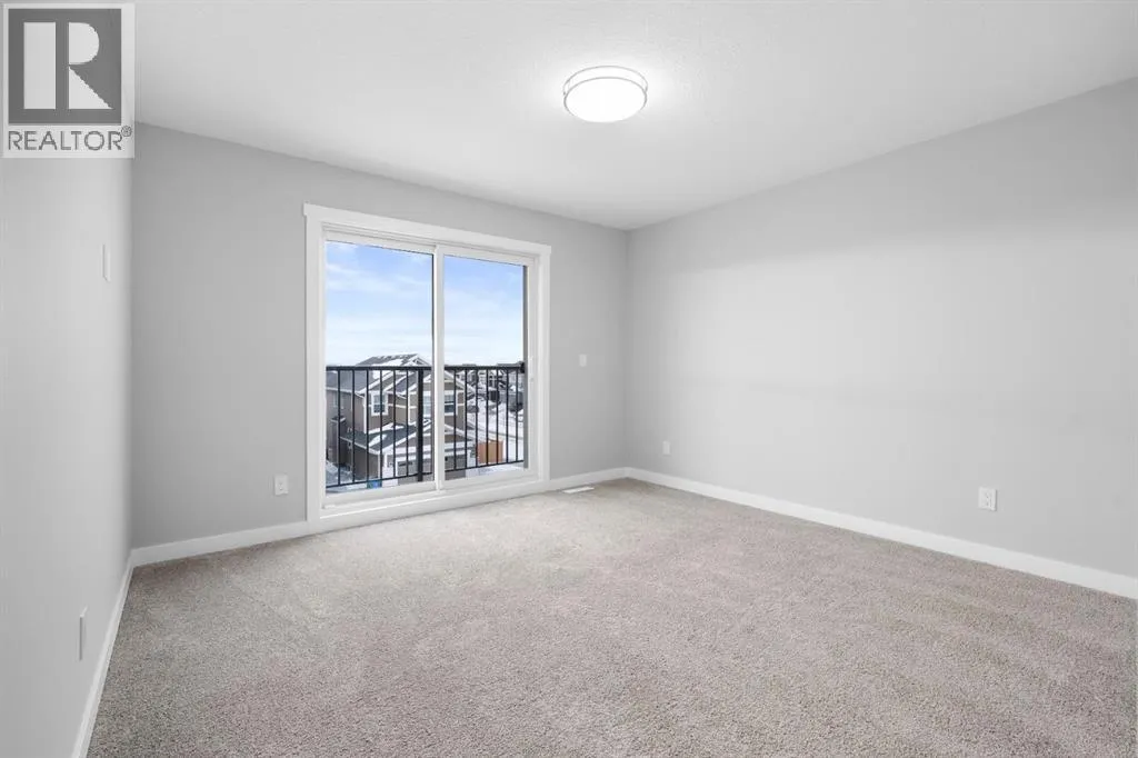 Welcome to this elegant brand-new 3-storey townhome with double attached garage, offering 4 bedrooms and 3.5 bathrooms in the desirable community of Redstone. Designed with upscale modern finishes, this home features quartz countertops, full-height glossy cabinetry, stainless steel appliances, soft-close drawers and cabinets, stacked front-load washer & dryer, and energy-efficient high-performance windows. A rare main-floor studio bedroom with wet bar and 4-pc ensuite provides an ideal private space for elderly family members, guests, or independent living. The open-concept second level showcases a chef-inspired kitchen with large island, pantry, dedicated dining area, home office/den with frosted French doors, and an expansive living room opening to an east-facing balcony, lighting, and privacy screen. Upper level includes a spacious primary suite with walk-in closet and ensuite, two additional bedrooms, full bath, and upper-floor laundry. Low condo fees, central greenspace courtyard, visitor parking, and quick access to Stoney Trail complete this exceptional offering. **Photos are of similar unit in the complex, all from the same floor plan, exterior & interior colors and layout may differ. Photos with furniture are virtually staged. Floor plans are attached in the supplements for this unit. (id:27476)