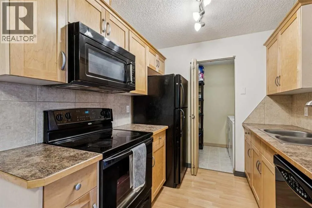 Top-floor, two-bedroom apartment with two secure, side-by-side underground parking stalls located in the community of Canyon Meadows. This pet-friendly complex is within walking distance to the CTrain and Fish Creek Park.The unit features a spacious living room with a tile-faced wood-burning fireplace, California knockdown ceilings, and new carpet professionally installed in 2023. Sliding glass doors provide access to the balcony. A separate dining area connects to the galley-style kitchen, which includes maple cabinetry and a black appliance package.The primary bedroom includes a walk-in closet, and the home is complete with a full-size ensuite washer and dryer. In addition to the two assigned underground parking stalls, an underground storage locker is included.Building amenities include an exercise room, recreational room, and a professionally landscaped central courtyard. (id:27476)