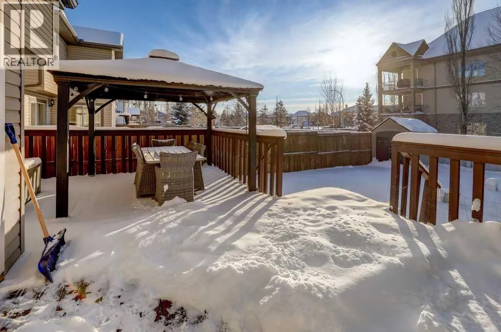 Welcome to this 1844 ft2 2 storey home on quiet cul de sac in the family friendly neighborhood of CRANSTON! This home has a large west-facing backyard big enough for a pool (current owners had an above ground pool in the backyard). The main floor of this Cardel built home features 9' ceilings and tile floors throughout. Open floor plan with spacious kitchen overlooking living room and dining area with patio doors onto large deck with gazebo included. Kitchen has warm hickory stained cabinets, stainless steel appliances and centre island with eating bar, and corner pantry. Living room has cozy gas fireplace with niche above. The main floor laundry room is conveniently located by the entrance to the double attached garage. The spacious upstairs features a large bonus room, 3 bedrooms and 2 full baths. Primary bedroom overlooks the spacious backyard and features a spacious 5 piece ensuite bath and walk in closet. The unfinished basement is perfect for storage or your own development ideas, but already includes a new furnace and central air conditioning (2021), water heater (2019) and water softener. The shingles were replaced in 2019. Cranston is surrounded by natural beauty with easy access to the Bow River and Fish Creek Park with over 100 km of walking/biking trails! Cranston is also renown for it's schools, parks and strong sense of community. Great access to South Health Campus hospital and both Deerfoot and Stoney Trails for quick access to all areas of Calgary! (id:27476)