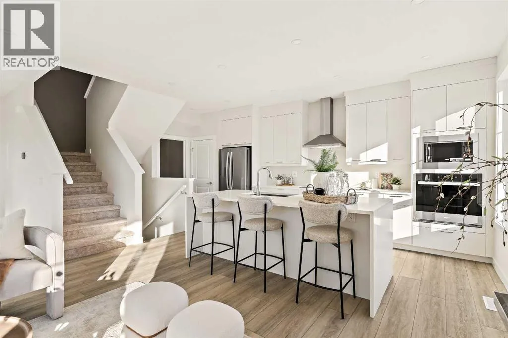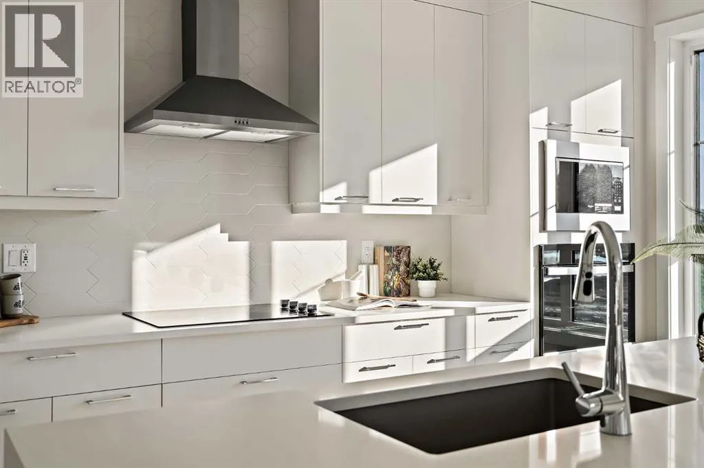Welcome to the Torrey at Crown Park - an exceptional opportunity offering a brand new move-in ready townhouse that features 3 bedrooms, 2.5 bathrooms and a private double attached garage. Featuring nearly 1,700 ft2 of living space, this end-unit townhome is perfectly situated with optimal southwest exposure providing a bright living space that is flooded with natural light. The bright and open main living area features a stunning kitchen with endless upgrades including built-in appliances, a waterfall quartz island and timeless white cabinetry. The kitchen has been designed for entertaining, located directly off of the expansive main living area. Walls of windows surround the entire main level, providing you with a naturally lit living space all year long. The ~17'x16' great room has ample space for virtually any furniture configuration and opens to the large dining area - creating a seamless flow between spaces. The main level is complete with a 2 pc powder room and direct access to the sprawling 26' balcony that spans the width of the home. The outdoor living space is equipped with a BBQ gas line and hose bib, adding to everyday convenience. The upper level has been thoughtfully designed with the primary suite spanning the width of the home and the secondary rooms and bathroom on the opposite end. The ~12'x12' primary bedroom has ample space for a king bedroom suite and includes a walk-in closet and a private 4 pc ensuite with dual sinks and a walk-in tiled shower. The upper level is finished by two additional bedrooms, a full bathroom and laundry - ensuring everyday convenience. The flexibility of three bedrooms makes this the perfect family home or guest bedroom with a home office space - providing exceptional long term value. The entry level of the home provides access to the private double attached garage, which has additional space for storage, as well as a large storage room - keeping all of your valuables safe and secure all year round. Located in one of Ca lgary's last inner-city developments, just minutes to downtown Calgary with endless transportation routes at your fingertips, this brand new home offers exceptional value and is perfect for first time buyers, investors, or those wanting a lock-and-leave lifestyle with maintenance-free living. Backed by a comprehensive builder warranty + Alberta New Home Warranty, this brand new home allows you to purchase with peace of mind! (id:27476)
