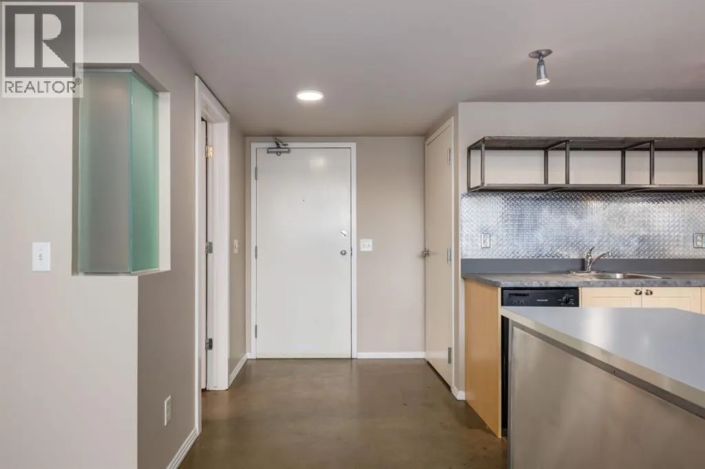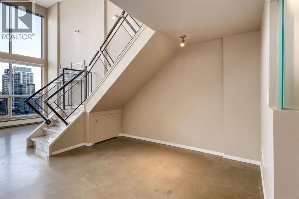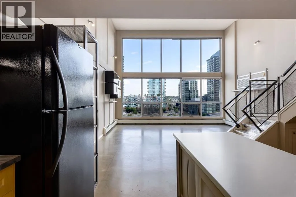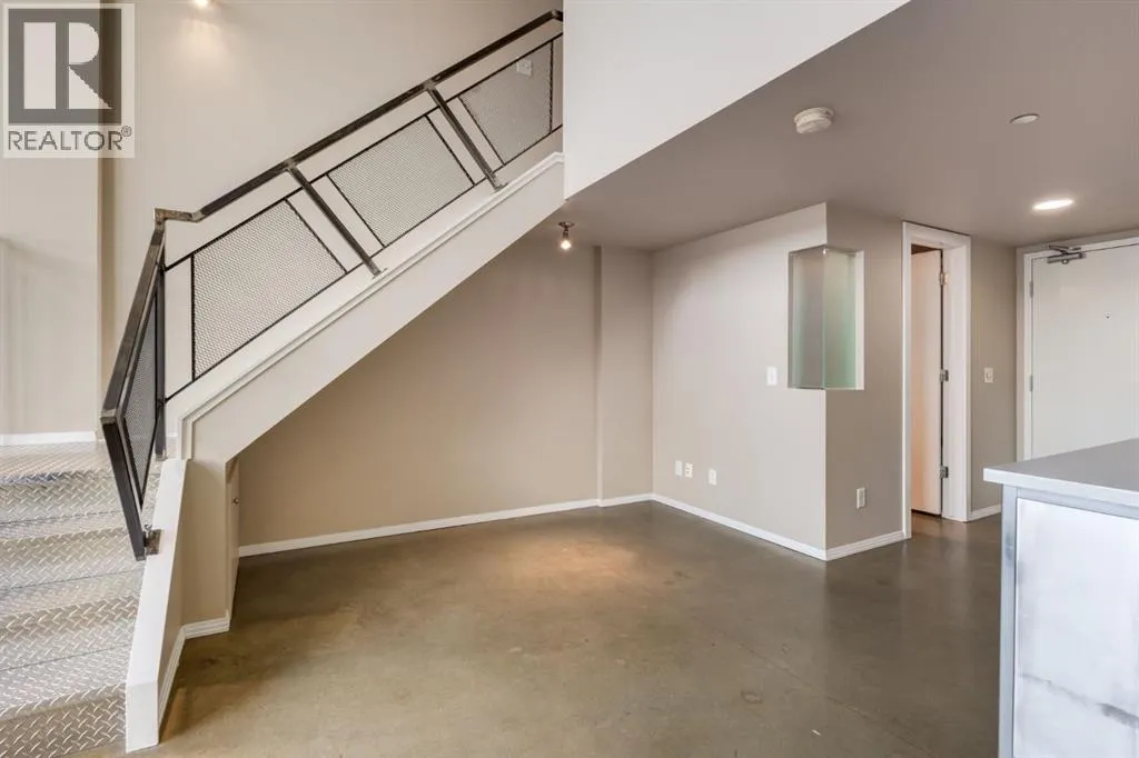 Why live in a typical condo when you can own a top-floor corner loft with 19'3" ceilings and 838 sq ft of wide open, light-filled space?.Welcome to Orange Lofts in the heart of East Village, Calgaryâs most walkable and architecturally distinct inner-city neighborhood. This one-bedroom, one-bath unit is a top-floor corner with no neighbors above and just one shared wall, giving you rare privacy in a buzzing urban setting..The north-facing windows fill the space with soft, ambient natural light all dayâperfect for working from home or relaxingâwithout the heat of direct sun. You'll enjoy panoramic views of East Village, the Bow River, and Calgaryâs skyline..Inside, you'll find polished concrete floors, exposed concrete walls, steel railings, and a lofted bedroom that overlooks the open living space. The layout is flexible, the design is timeless, and the vibe is unmistakably urban..?? Location Highlights (All within Walking Distance):.* RiverWalk Pathways + Bow River access* Studio Bell, Calgary Central Library, Confluence, and Simmons Building* Saddledome + the future event centre and entertainment district* C-Train station for fast downtown access* Local grocery stores, cafes, breweries, and restaurants* Calgary Zoo and St. Patrickâs Island nearby* Blocks from Inglewood and downtown core shopping.Extras include titled underground parking, separate storage, in-suite laundry, and access to a rooftop patio, bike storage, and resident lounge. Condo fees include heat, water, and electricity..This is not your average condo.?.Itâs open. Itâs private. Itâs steps from everything.?.And itâs one of a kind. (id:27476)