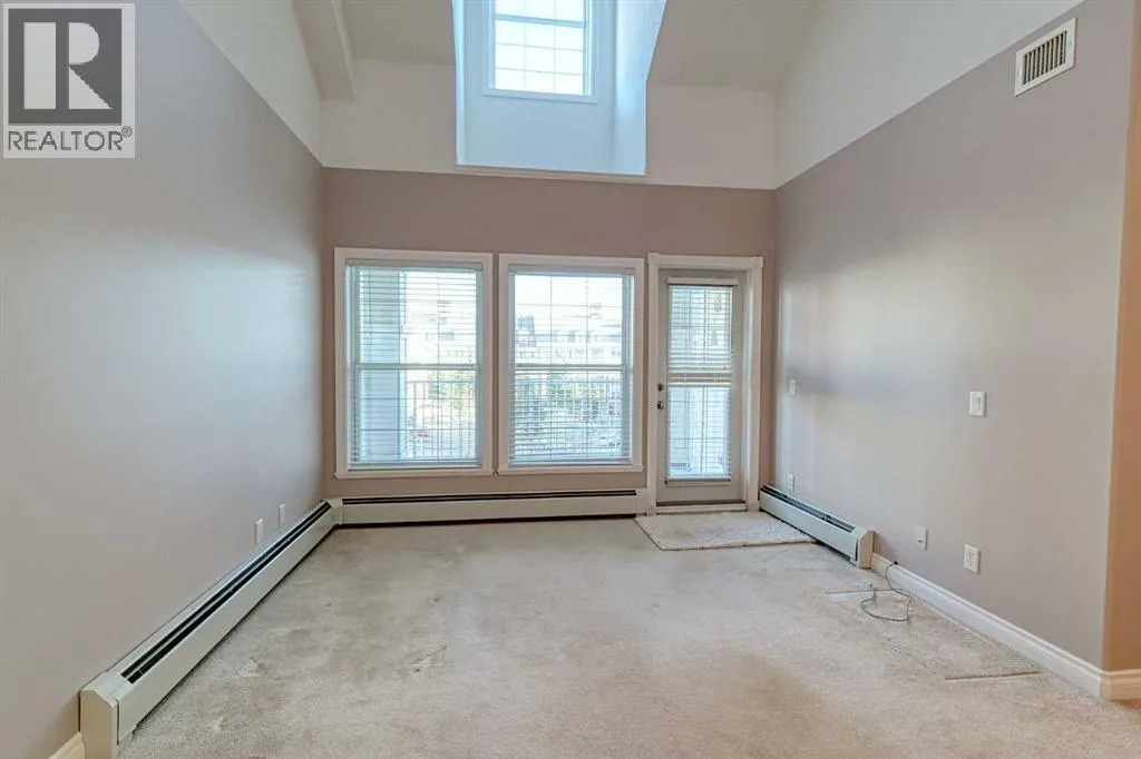 Welcome to this spacious 1,295 sq. ft. multi-level, top-floor condo in the sought-after Country Estates on the Cove, featuring TWO TITLED UNDERGROUND PARKING STALLS and air conditioning.This rare layout offers soaring two-storey ceilings in both the living room and primary bedroom, creating a bright, open feel with impressive natural light. Freshly painted throughout, the open-concept living and dining areas flow seamlessly into the kitchen with solid maple cabinetry. A combined laundry and pantry room adds excellent convenience and storage, while the balcony is accessed directly from the living room.The primary bedroom features a dramatic vaulted ceiling, walk-through closet, and private 4-piece ensuite with double vanity. A second bedroom, additional 4-piece bathroom, and an open loft overlooking the living room complete the layout. The loft includes a 2-piece bathroom and electric fireplace, ideal for a home office or flexible living space.This well-managed 40+ adult community offers exceptional amenities including a fitness centre, indoor pool, hot tub, recreation room with games and bowling alley, library, woodworking shop, guest suites, car wash bay, and assigned storage. Condo fees include all utilities.Conveniently located near shopping, parks, and walking paths, with easy access to Deerfoot Trail, Stoney Trail, transit, and the airport. (id:27476)