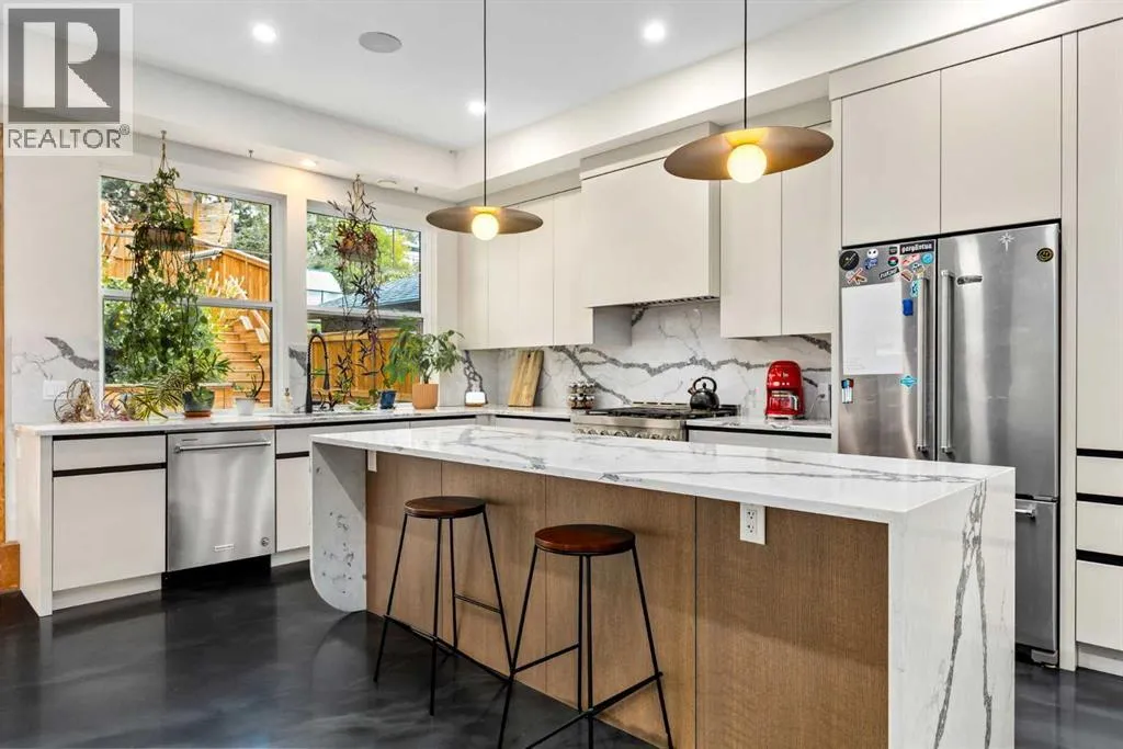 This is Ramsay living at its finest. Perched on one of the most coveted streets in the neighbourhood, this custom brownstone by boutique builder Icon Design and Development, with architecture by John Trinh & Associates and interiors by Studio Felix, gives you unbeatable views over the community and skyline. Plus, youâre just minutes from Inglewood, the Elbow and Bow River pathways, and quick access to Blackfoot Trail, Macleod Trail, and Deerfoot Trail to get anywhere in the city fast. Inside, every detail is dialed in. The main floor has heated polished concrete floors (yes, warm concrete), a showpiece fireplace, and distinctive custom millwork you wonât find in a builder-grade home. The kitchen is built for people who love to cook and host, with a massive island, high-end gas range, and loads of storage. Thereâs even a home bar with beer taps for when friends drop by. Upstairs youâll find three big bedrooms, including a primary suite with a spa-style ensuite and walk-in closet. In the lower level, you will find an excellent flex space! The west-facing backyard is private and tiered to make the most of the views. Itâs low-maintenance, has plenty of space to relax, and yes â thereâs already a hot tub waiting for you. The heated attached garage (rare for Ramsay) is oversized and tandem, perfect for your gear, hobbies, and Calgary winters. Homes like this donât come up often here. Ramsay gives you that small-town feel in the middle of the city, and Maggie Street is as good as it gets. For more info and photos, click the links below! (id:27476)