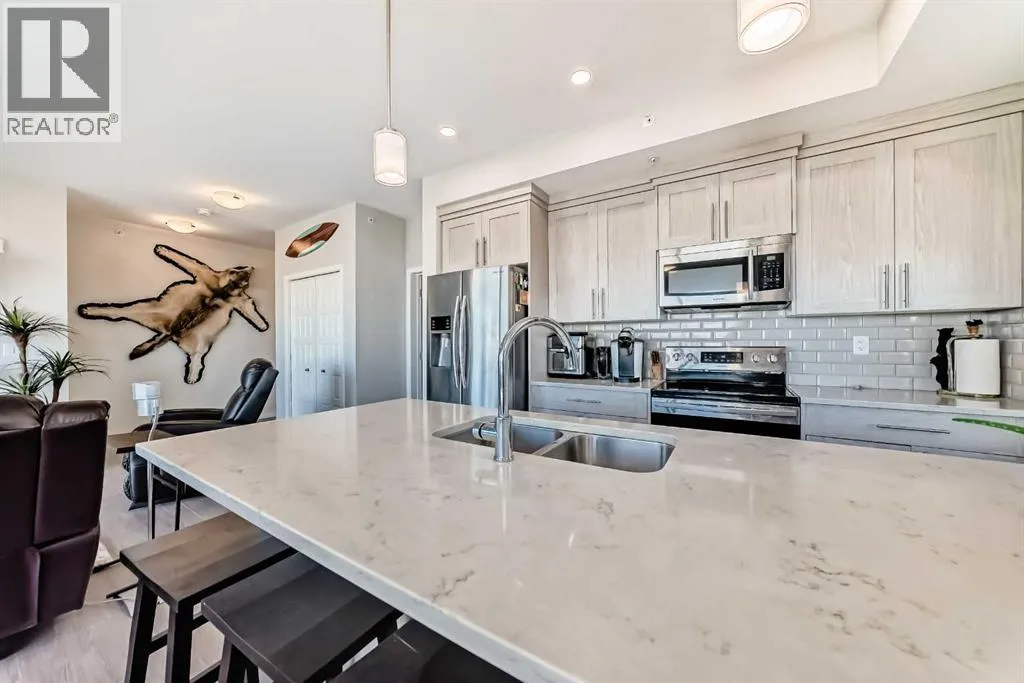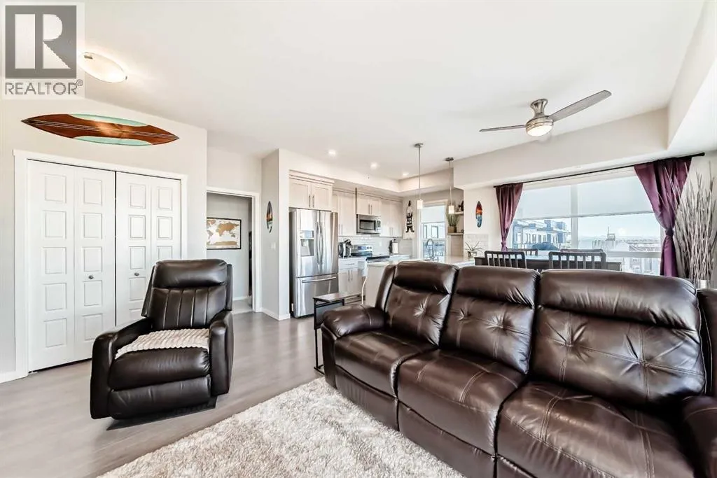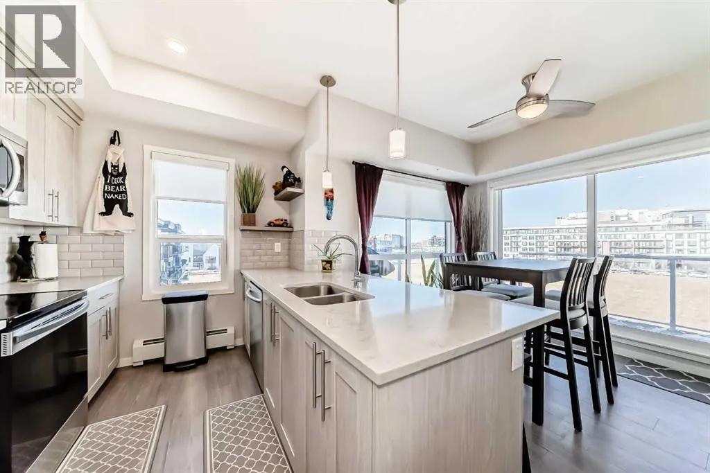 Top-floor corner unit located at #409 4150 Seton Drive SE! This home features a wrap around balcony with stunning views facing green space as well as one of the only units to have beautiful mountain views to the west. With floor to ceiling windows, high end finishes throughout the home, complete with two bedrooms and two bathrooms as well as in-suite laundry and extra storage. This home has upgraded kitchen appliances, quartz counter tops throughout vinyl plank flooring, 9' ceilings, built-in closet organizers along with window coverings. Included with this unit are two titled underground parking stalls and one storage locker to ensuring that you'll have ample space to store your vehicles and personal belongings. Over looking the YMCA within steps to swim workout or be in nature with all of the greenspace. Easy access to Deerfoot and Stoney Trail, South Health Campus, shops, restaurants, and so much more, this home is the perfect spot to plant your roots! Don't miss out on this incredible opportunity pack your suitcase and move on in as the furniture is negotiable. (id:27476)
