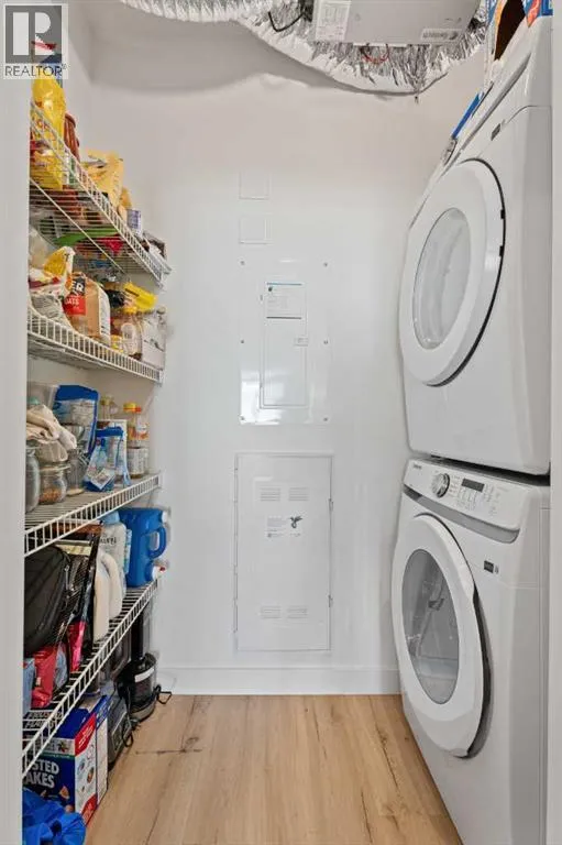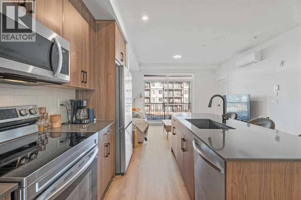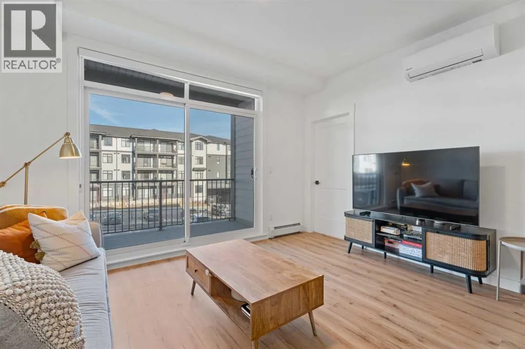 MOVE-IN READY! Discover the perfect balance of style and functionality in this impeccable condo built by award-winning Logel Homes. The unit remains under the first-year coverage period, providing 100% coverage and peace of mind. Located in the Sage Walk development, this unit offers over 700 sq. ft. of well-planned living space with two bedrooms, including a spacious primary suite, and two full bathrooms, plus a private patio for outdoor relaxation. The 9-foot ceilings create an open, airy feel throughout. Over $24,000 in upgrades enhance both style and comfort, including: Luxury Vinyl Plank (LVP) flooring throughout the unit, oversized kitchen sink, cabinets extended all the way to the ceiling with upgraded hardware, air conditioning, taller bathroom countertops, an extra closet in the primary suite, tiled shower in the ensuite bathroom, full-height tile in the secondary bathroom, and blinds added throughout the home. The gourmet kitchen features quartz countertops, stainless steel appliances, including a French door fridge and smooth-top range, and a tile backsplash extending under the cabinets. Designed for quiet living, the building features superior soundproofing, with a lightweight concrete topping separating the floors. Additional highlights include in-unit laundry and a titled, underground parking stall. Conveniently located near Shaganappi Trail and Sage Hill Blvd, this condo combines thoughtful upgrades, modern finishes, and a prime location with competitive condo fees, making it a rare opportunity in a highly sought-after community. (id:27476)