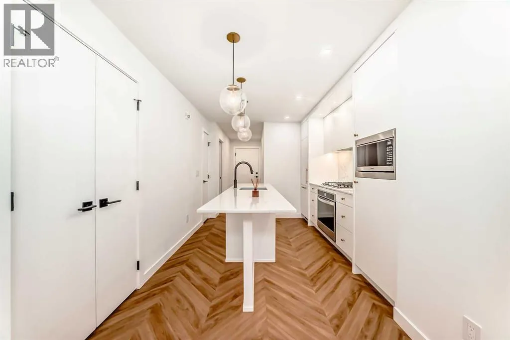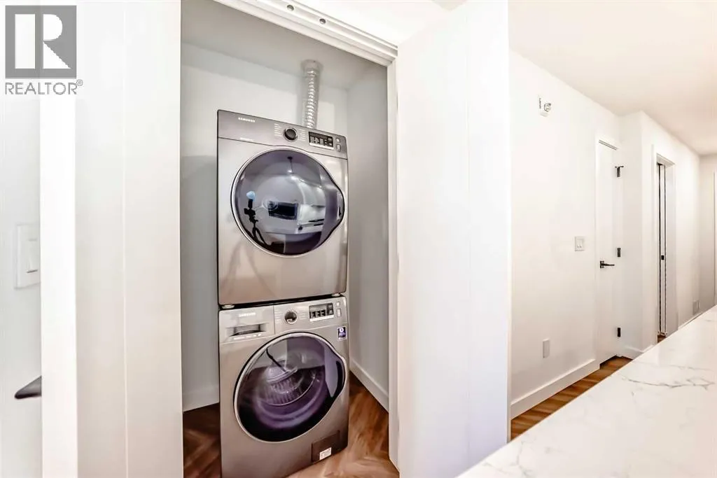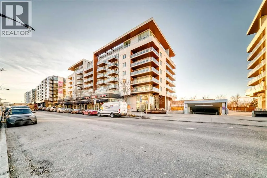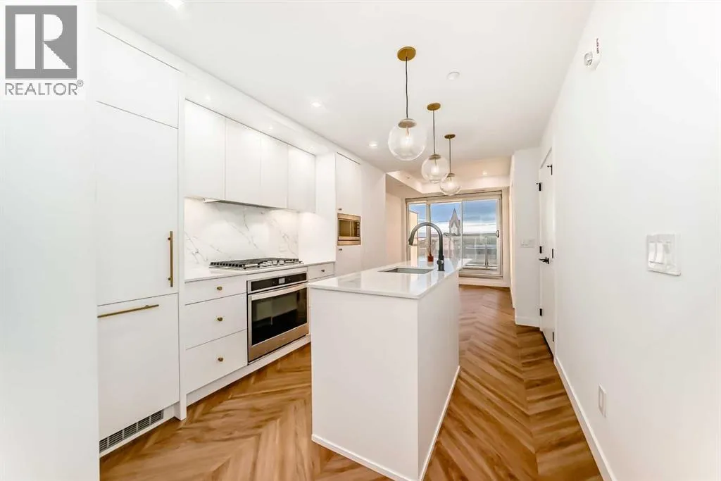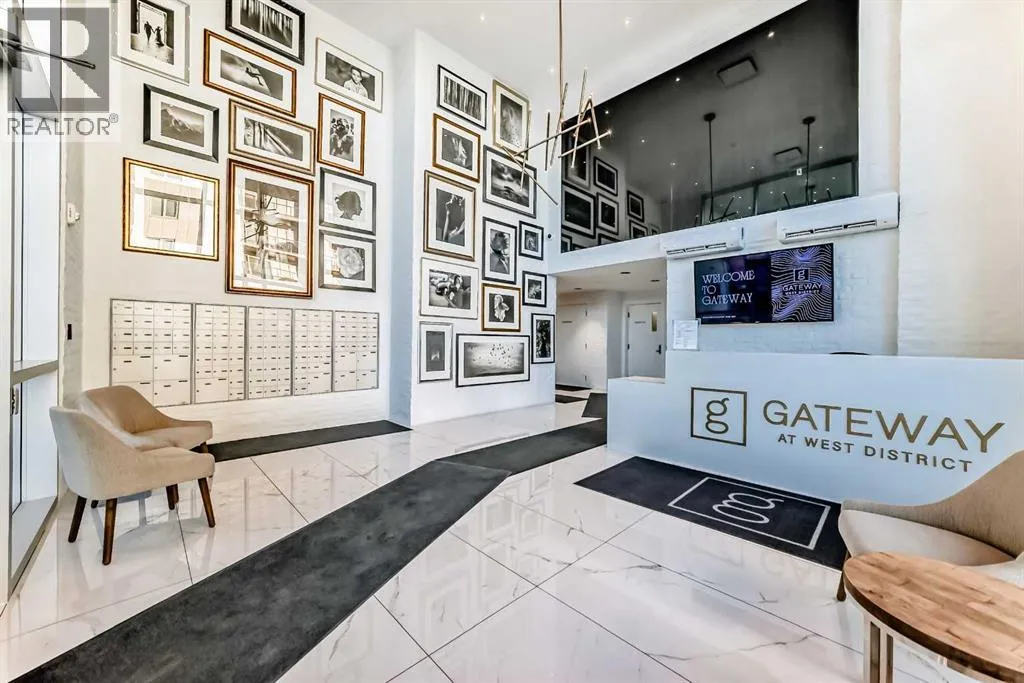 Welcome to Gateway by TRUMAN, ideally located in the vibrant, master-planned West District. This concrete-constructed residence offers modern luxury, thoughtful design, and exceptional urban convenience. This two-bedroom, two-bathroom home with titled underground parking features chevron wide-plank flooring, designer lighting, and flat-painted ceilings for a timeless, upscale feel. Floor-to-ceiling windows flood the space with natural light and capture mountain views, while central air conditioning ensures year-round comfort. The chef-inspired kitchen blends style and function with matte custom cabinetry, brushed-gold accents, quartz countertops and backsplash, under-cabinet lighting, and a generous eating bar. Premium appliances include a gas cooktop, wall oven, 36â Fisher & Paykel integrated refrigerator, paneled dishwasher, and statement hood fan. The open living and dining areas extend to a private terrace, ideal for outdoor lounging and entertaining. The primary suite features a walk-in closet and spa-inspired ensuite with quartz counters, mosaic tile, and a glass-enclosed shower. The second bedroom offers flexibility as a guest room or home office with access to a stylish four-piece bath. Additional highlights include in-suite laundry, ample storage, and secure underground parking. Residents enjoy premium amenities such as a rooftop patio, ownerâs lounge, concierge, bike storage, EV charging, and visitor parking.Surrounded by parks, walking paths, boutique shopping, cafés, and dining, this home offers elevated living in one of Calgaryâs most sought-after communities. (id:27476)