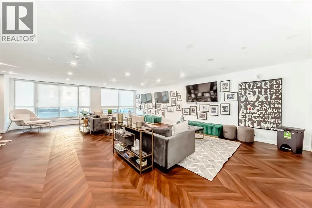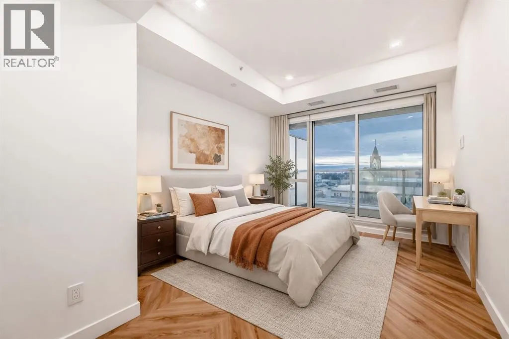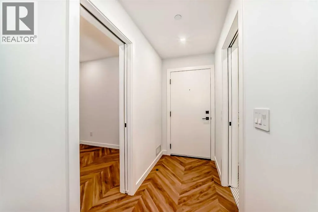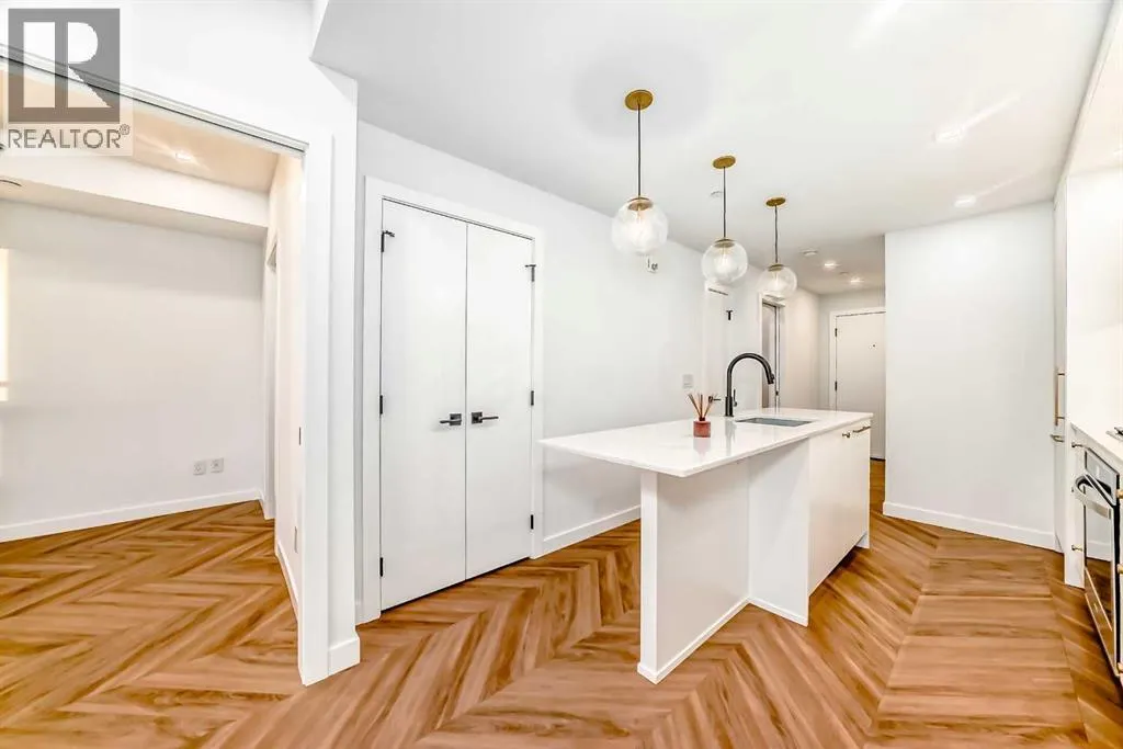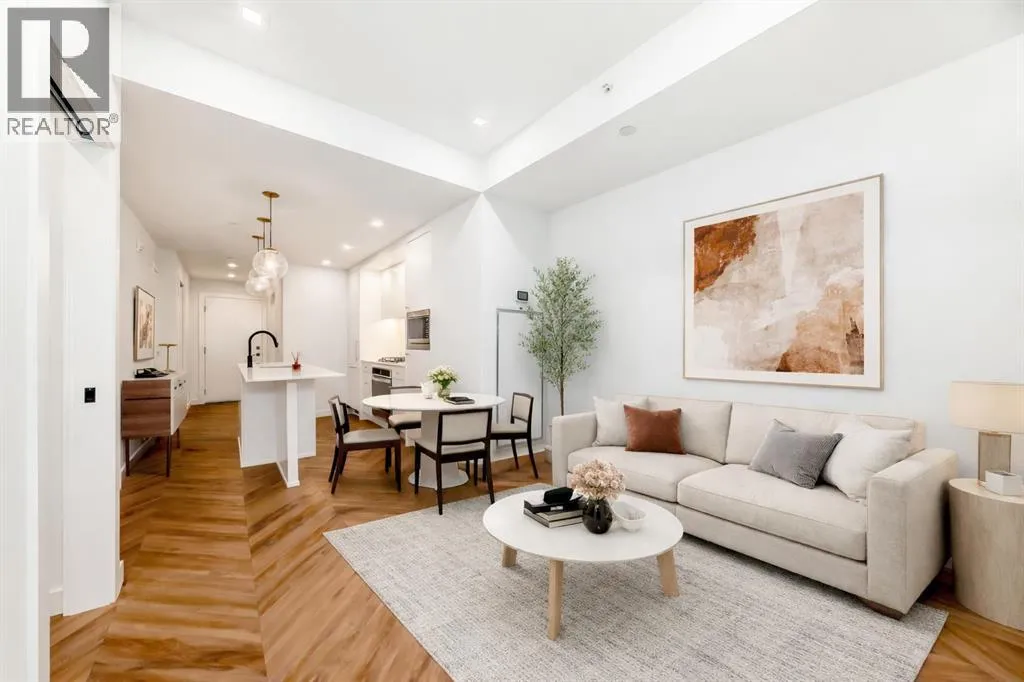 Welcome to Gateway by TRUMAN, ideally located in the vibrant, master-planned West District. This concrete-constructed residence offers modern luxury, thoughtful design, and exceptional urban convenience. This two-bedroom, two-bathroom home with titled underground parking features chevron wide-plank flooring, designer lighting, and flat-painted ceilings for a timeless, upscale feel. Floor-to-ceiling windows flood the space with natural light and capture mountain views, while central air conditioning ensures year-round comfort. The chef-inspired kitchen blends style and function with matte custom cabinetry, brushed-gold accents, quartz countertops and backsplash, under-cabinet lighting, and a generous eating bar. Premium appliances include a gas cooktop, wall oven, 36â Fisher & Paykel integrated refrigerator, paneled dishwasher, and statement hood fan. The open living and dining areas extend to a private terrace, ideal for outdoor lounging and entertaining. The primary suite features a walk-in closet and spa-inspired ensuite with quartz counters, mosaic tile, and a glass-enclosed shower. The second bedroom offers flexibility as a guest room or home office with access to a stylish four-piece bath. Additional highlights include in-suite laundry, ample storage, and secure underground parking. Residents enjoy premium amenities such as a rooftop patio, ownerâs lounge, concierge, bike storage, EV charging, and visitor parking.Surrounded by parks, walking paths, boutique shopping, cafés, and dining, this home offers elevated living in one of Calgaryâs most sought-after communities. (id:27476)