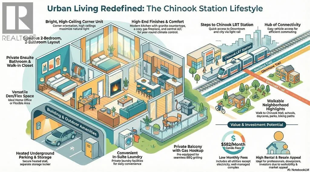 RARE Spacious 2 bedroom, 2 bathroom + Den layout *** ENSUITE bathroom and WALK-IN closet in primary bedroom *** Newer Dishwasher, Stove, and Microwave Hood Fan (Approximately 3 Years Old) *** BRIGHT corner unit with natural light *** HIGH CEILINGS *** Gas fireplace *** Central A/C *** GRANITE countertops *** In-suite laundry *** Balcony with gas BBQ hookup *** HEATED UNDERGROUND PARKING and SEPARATE STORAGE Locker, Both Forming Part of the Condo Unit Title. *** Low Condo Fees - $582/month *** All UTILITIES INCLUDED Except Electricity *** Well-managed and well maintained complex *** Steps to CHINOOK LRT station *** Quick Access to Downtown *** Easy Access to Macleod Trail, Glenmore Trail, and Deerfoot Trail *** Walking distance to Chinook mall *** Nearby parks and green spaces *** Walking and biking paths *** Close to SCHOOLS and DAYCARES *** Excellent walkability and transit access *** Strong long-term rental appeal (id:27476)